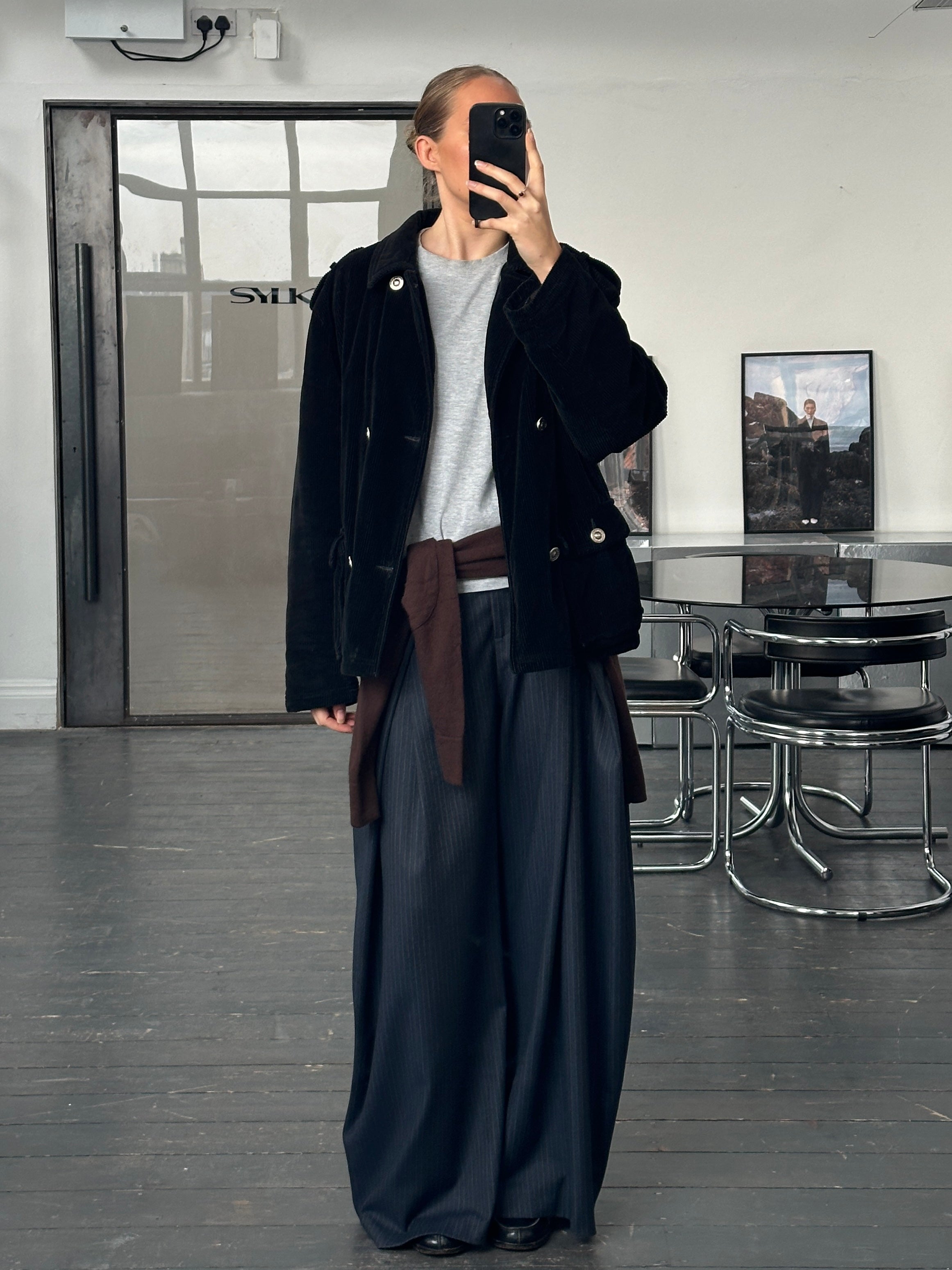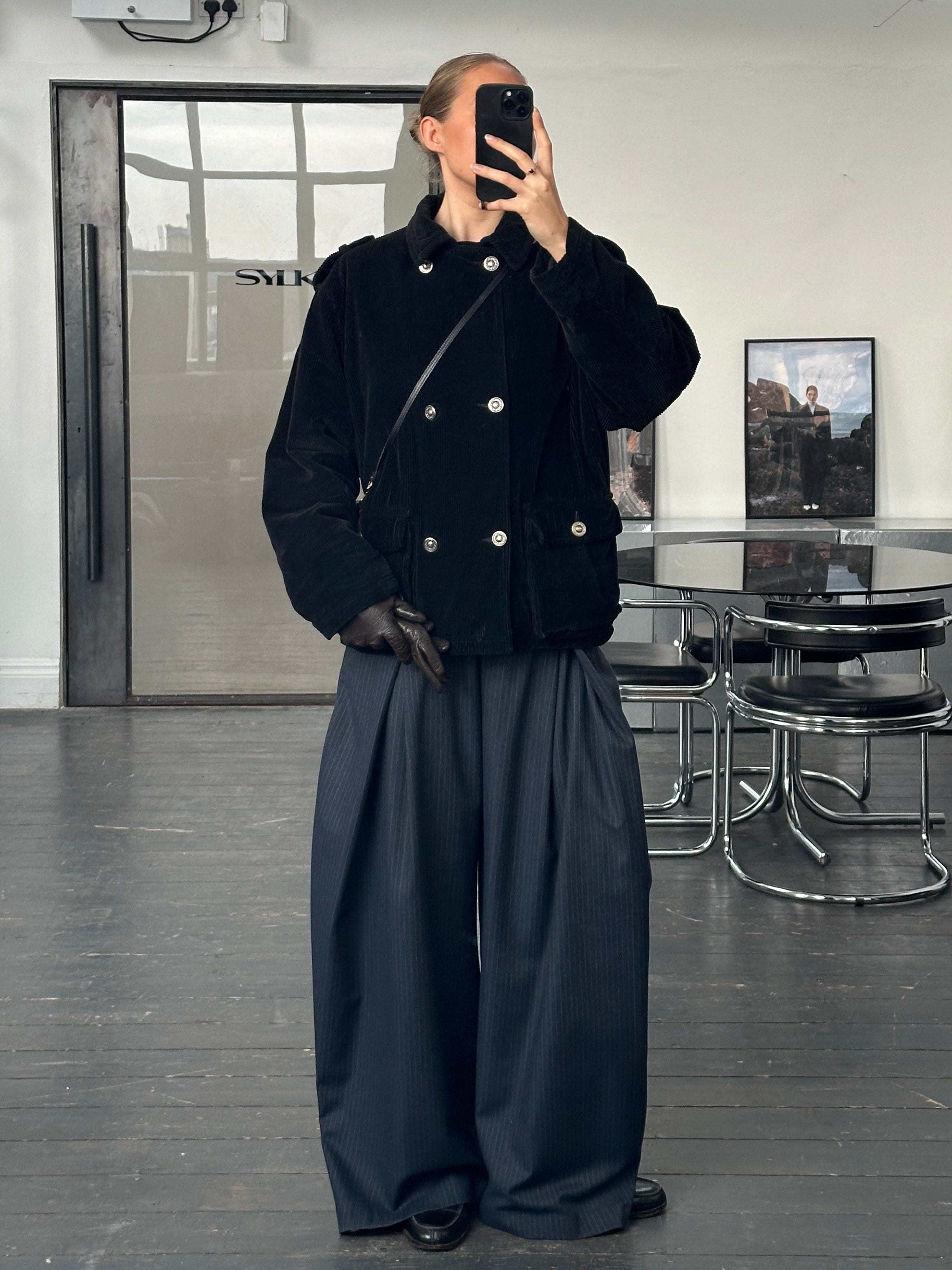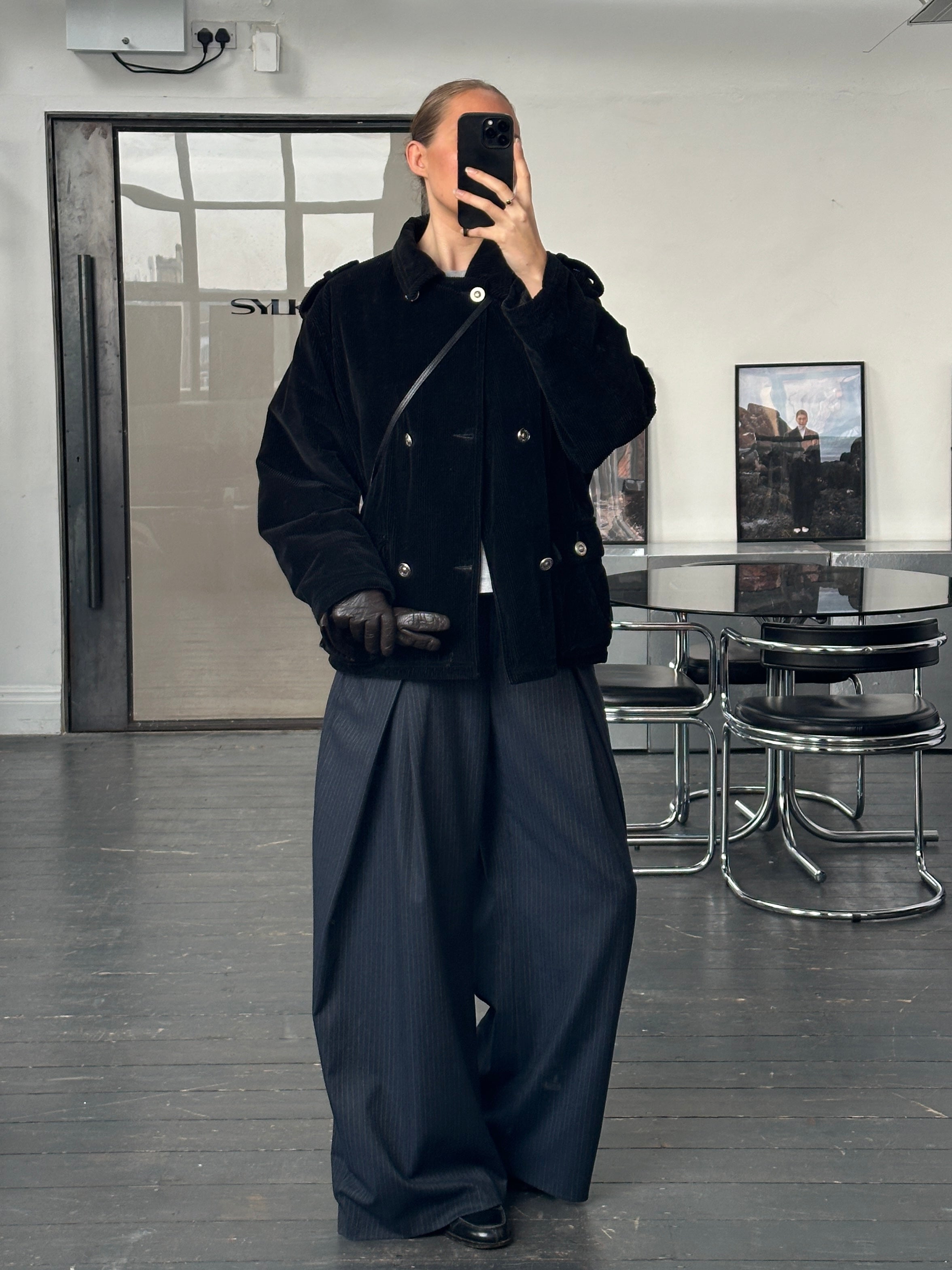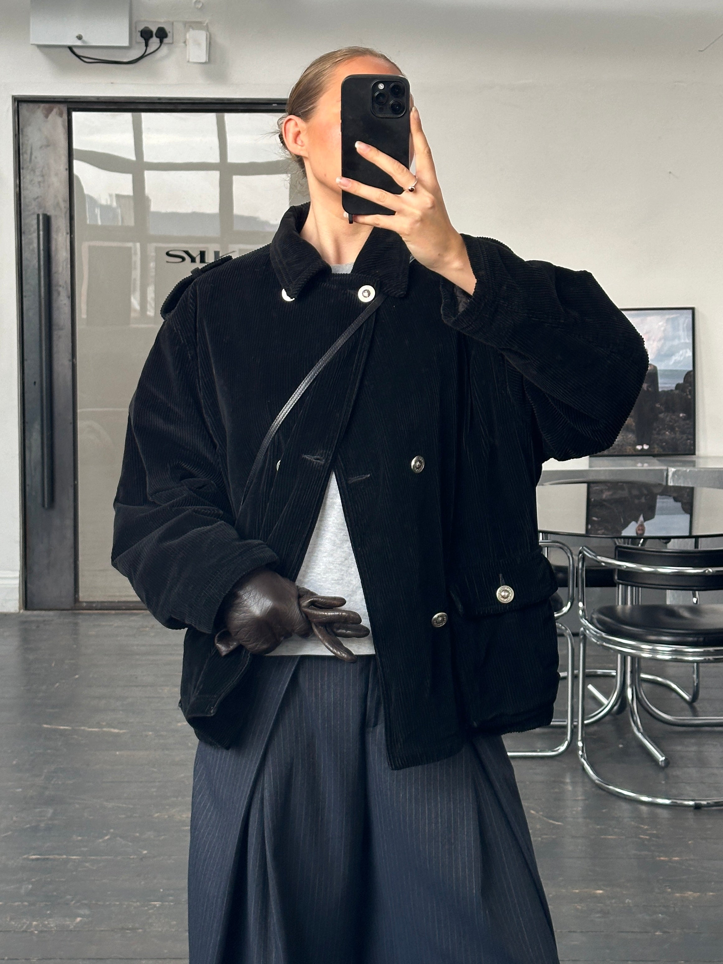 Vintage 1990s Versace Sport double breasted jacket in deep black corduroy. A structured yet relaxed silhouette with utilitarian detailing and signature bespoke Medusa buttons.