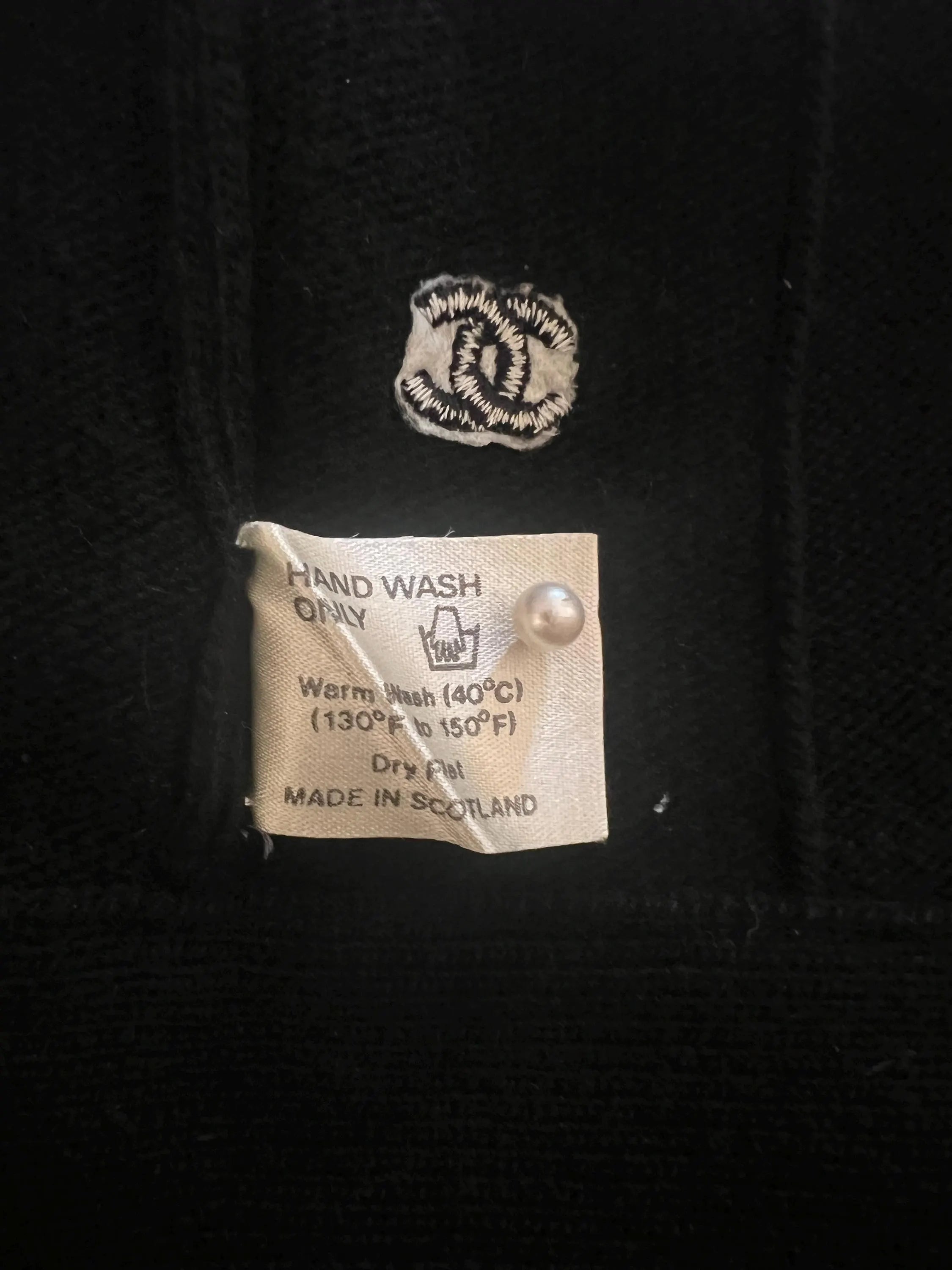 The knit is in truly excellent vintage condition with no flaws of any note and looks as good as the day she was made. Pieces from this collection are rare to market and this has merit in any Chanel collector’s archive. The cardigan is 100% Cashmere and made in Scotland. There is no size label so please refer to the measurements below; it has some stretch. We believe this would fit a variety of sizes up to a UK 12, US 8, or maybe a size bigger if left open. The accompanying blouse is not in great condition with noticeable staining under the underarms. However, I'd love these two to stay together as collector's pieces and she is our gift to you.