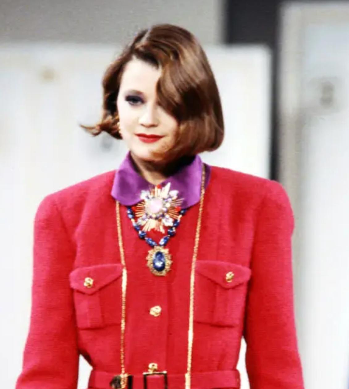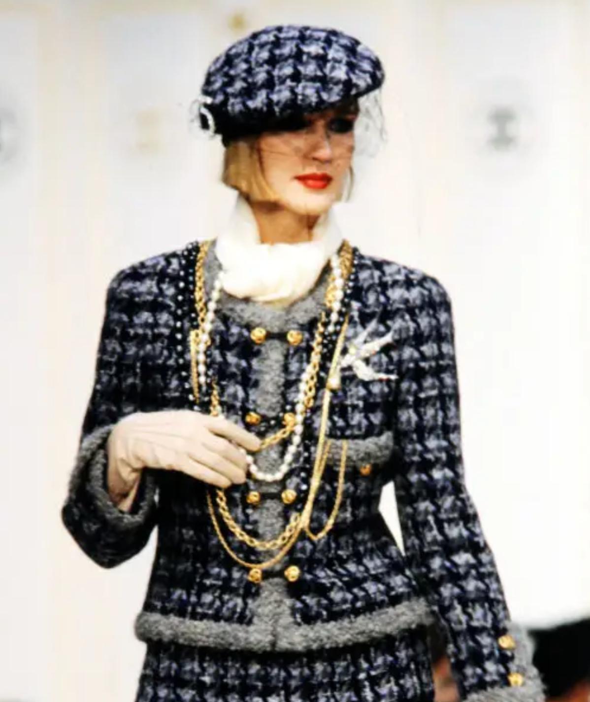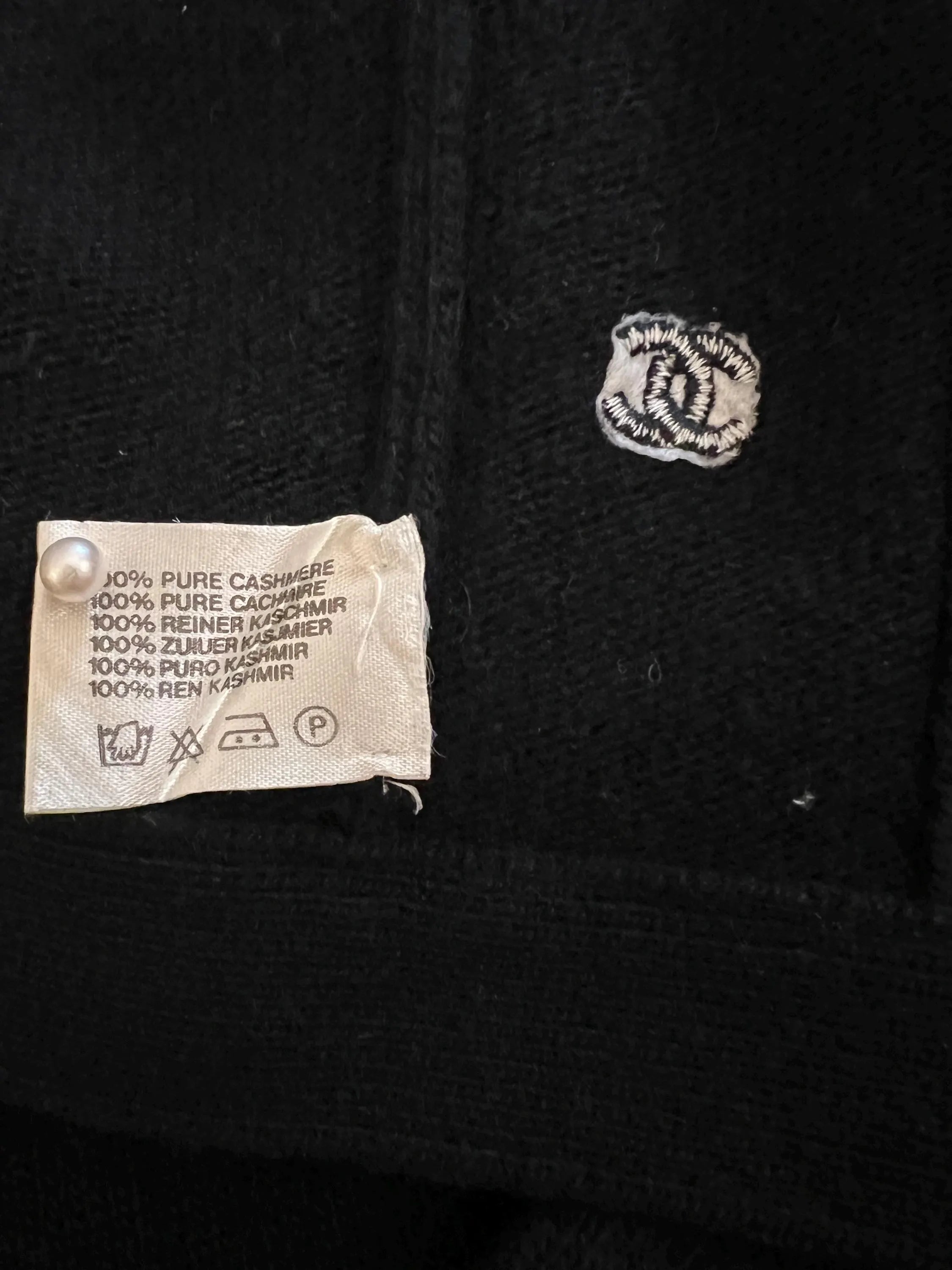 Rare and early Chanel 1983 Fall collection cashmere cardigan. This was Karl Lagerfeld's very first ready to wear presentation for the House and the fashion eyes of the world were upon him. WWD reported that Lagerfeld knew Chanel needed to be pushed into modernity, and brought in many of his own people including a young Herve Leger, but he was also nothing if not respectful of the house’s legacy. He gently justified his changes, noting at the time: “Even if she never did it this way, it’s very Chanel, no?”