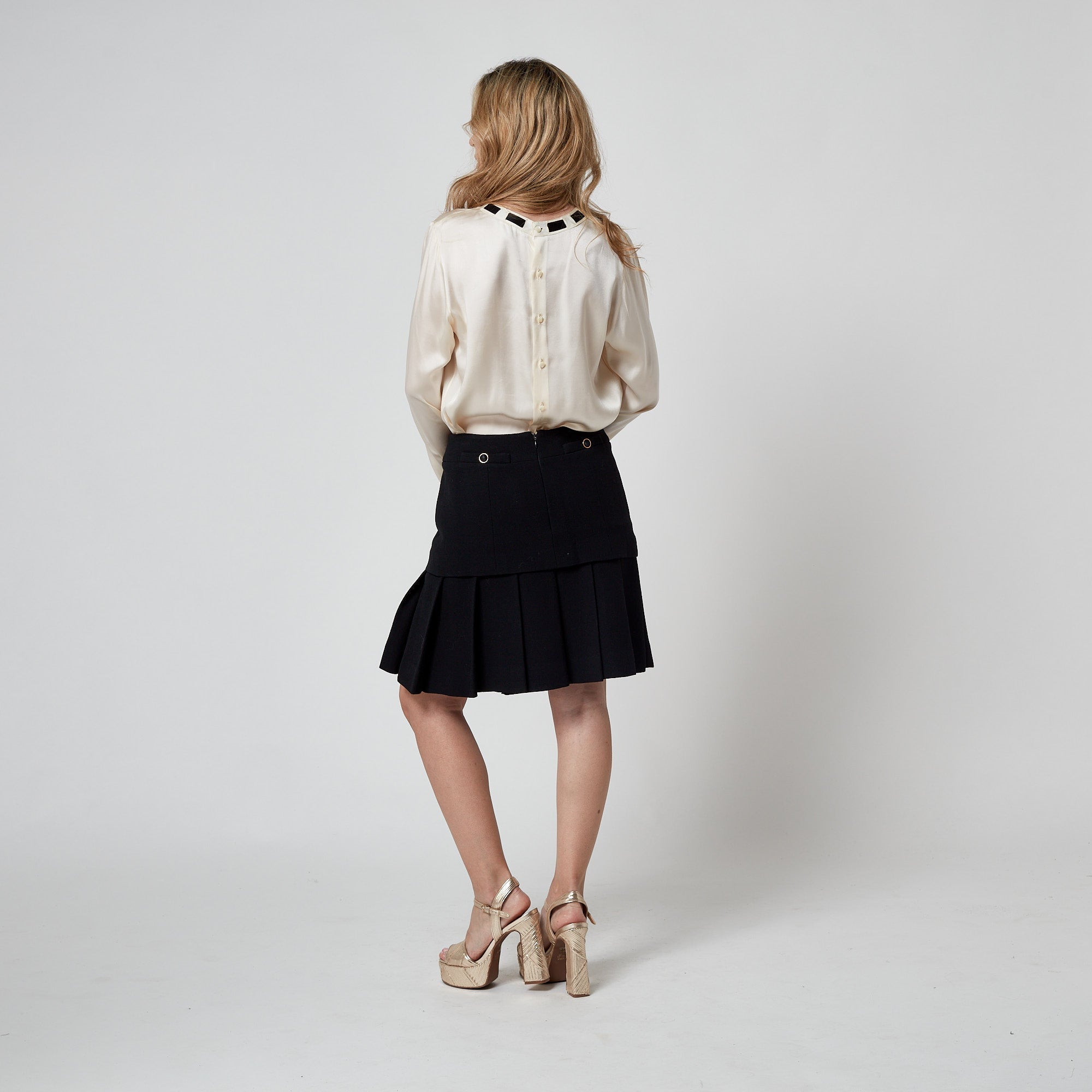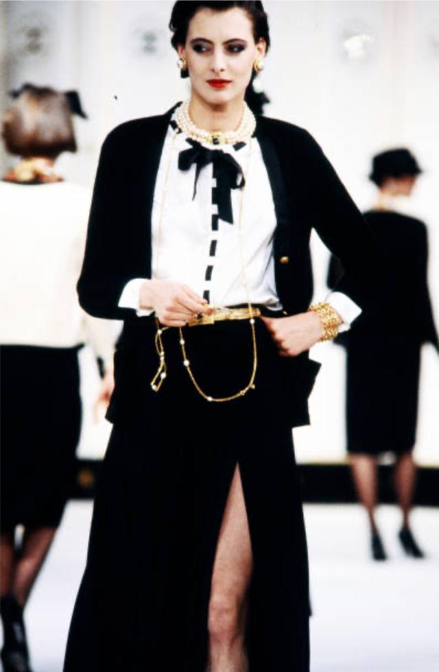 Although this exact cardigan did not appear on the runway, many other garments featured the button design which was, and still is, unique to a particular Chanel collection. We have included runway shots detailing the button design together with a similar cardigan design paired with a white and black silk blouse as part of an ensemble. Circa is delighted that this exact blouse was purchased with this cardigan from the original vendor and we will include it to make a set.
