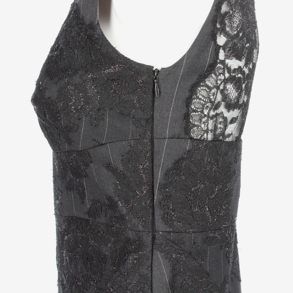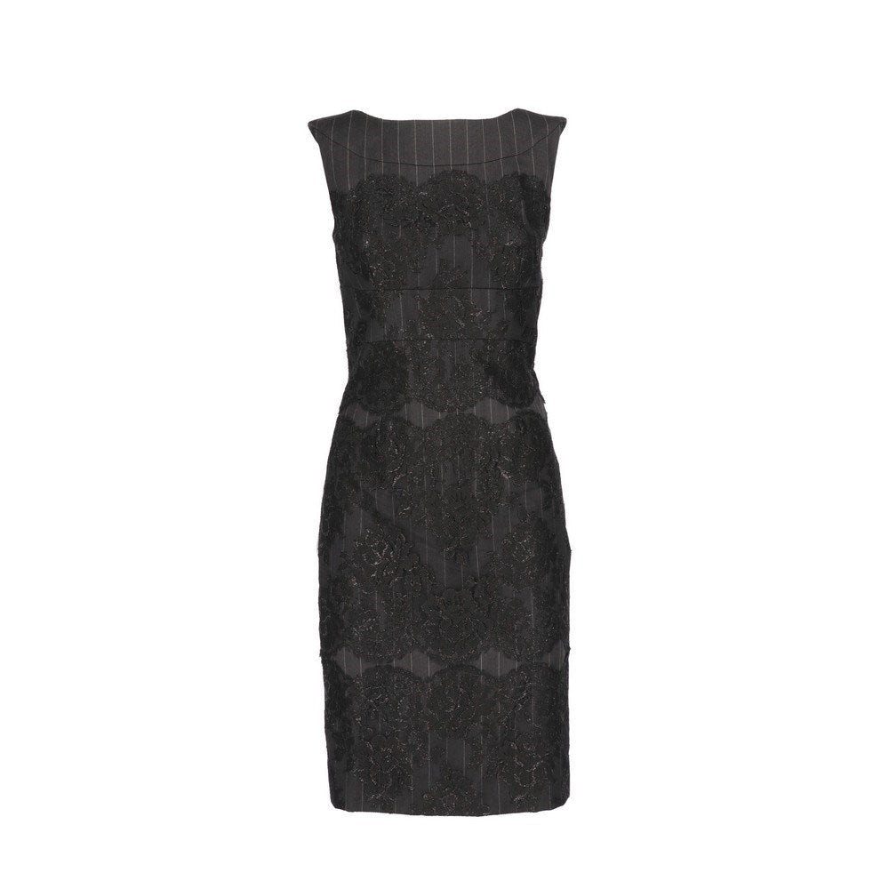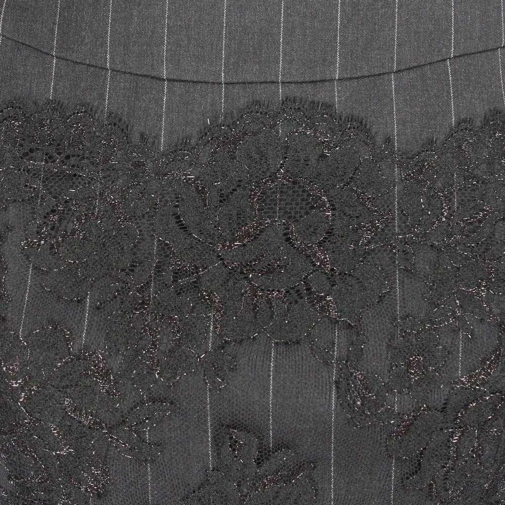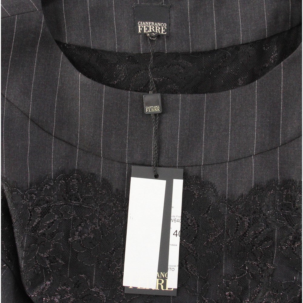 Gianfranco Ferrè sleeveless grey pinstripe cotton dress. Black lace with roses sew on the whole dress. Top back part made by black sheer lace. Knee length, back zip closure. This item belongs to a deadstock, it has never been worn and comes with its original tag.
