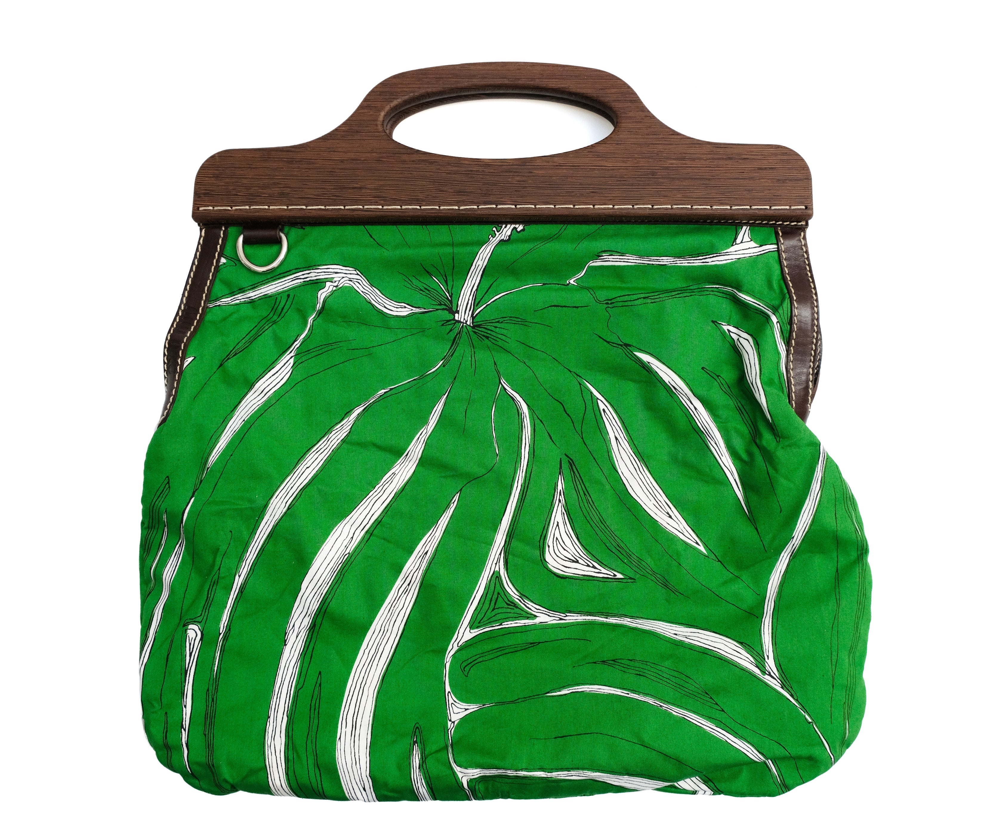 A gorgeous summery handbag by Miu Miu, in emerald green and white tropical leaf print cotton.
