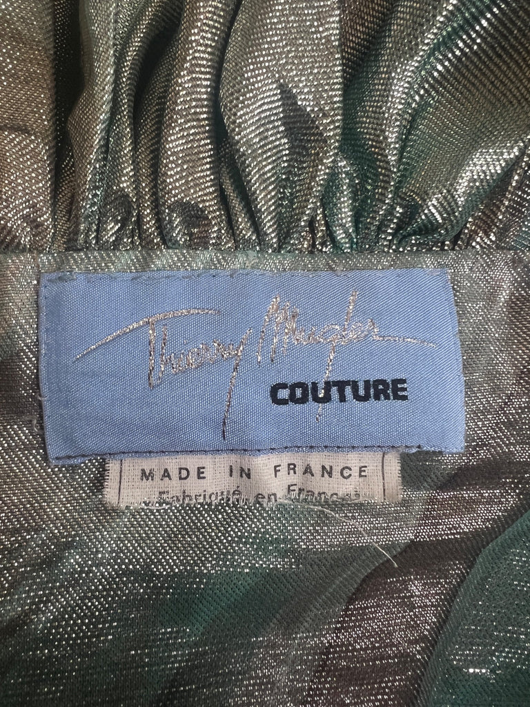 This spectacular Y2K lamé top and skirt ensemble were couture crafted by Manfred Thierry Mugler circa 1998 to 2001. Designed by the master of empowering, hyper-feminine tailoring, the ensemble twists around the body in a manner that recalls Grecian draping and the fluid, glittering designs that the patrons of 1970s nightclub Studio 54 wore on the dancefloor. The fabric is dazzling; a lightweight silk lamé with an aqua hue, detailed with a subtle pink-bronze ombré stripe. The attention-grabbing look is composed of two parts: a skin-flashing top and maxi-skirt. The top is tailored almost as though a lamé scarf has been expertly twisted around the body. It has a halter-style neckline that gives way to a racerback at the rear. It has a cropped length and wide waistband that can be adjusted and tied at the side of the waist, the tie then draping down the side over the hips. The incredible, hip-hugging skirt is cut with a high-waist that sits under the top. It has a dramatic fishtail cut which becomes a graceful, floor-sweeping train at the back of the dress. The skirt fastens at the rear with a hidden hook-and-eye clasp and off-white zip with angular pull. Both pieces are unlined.