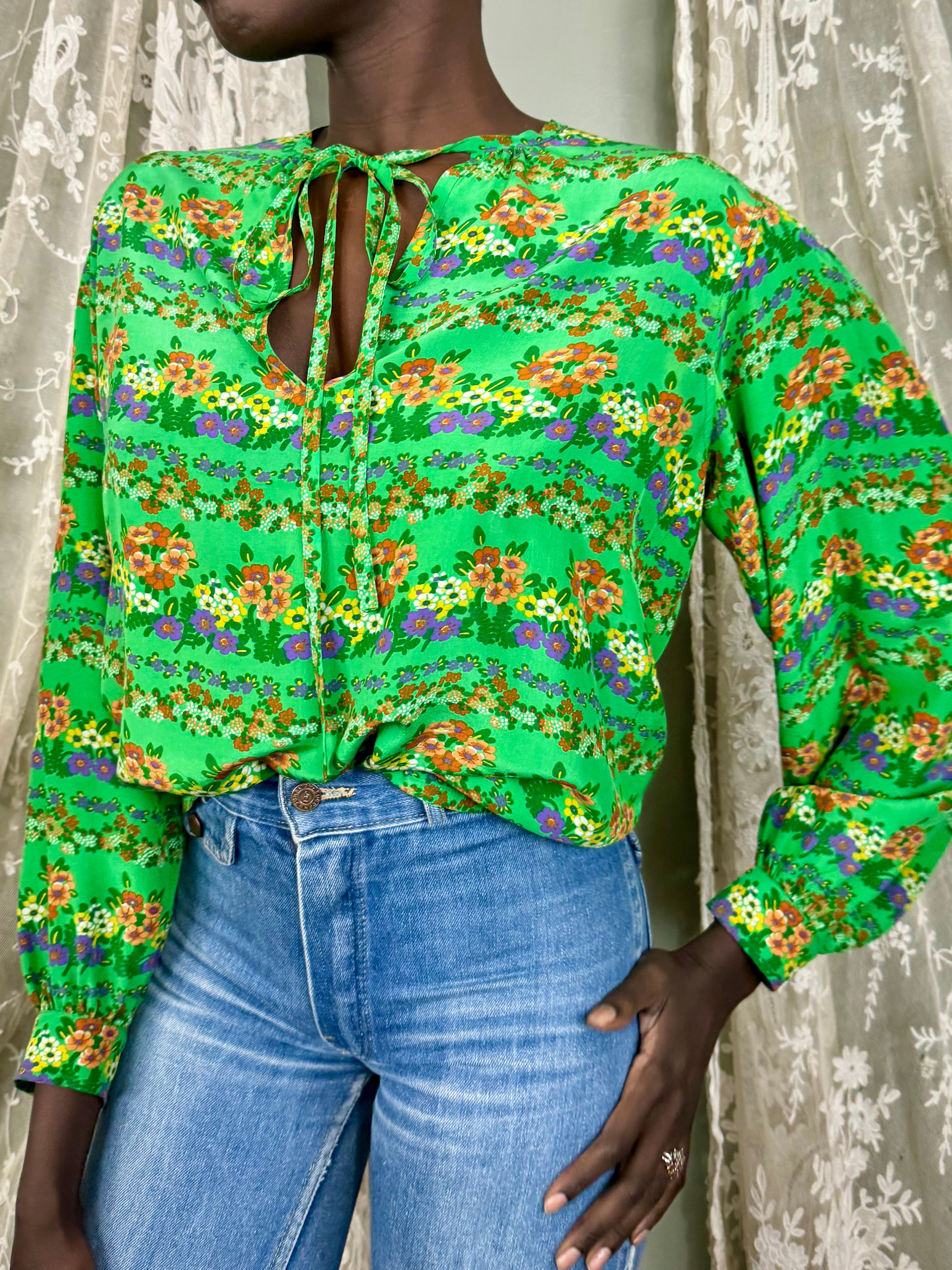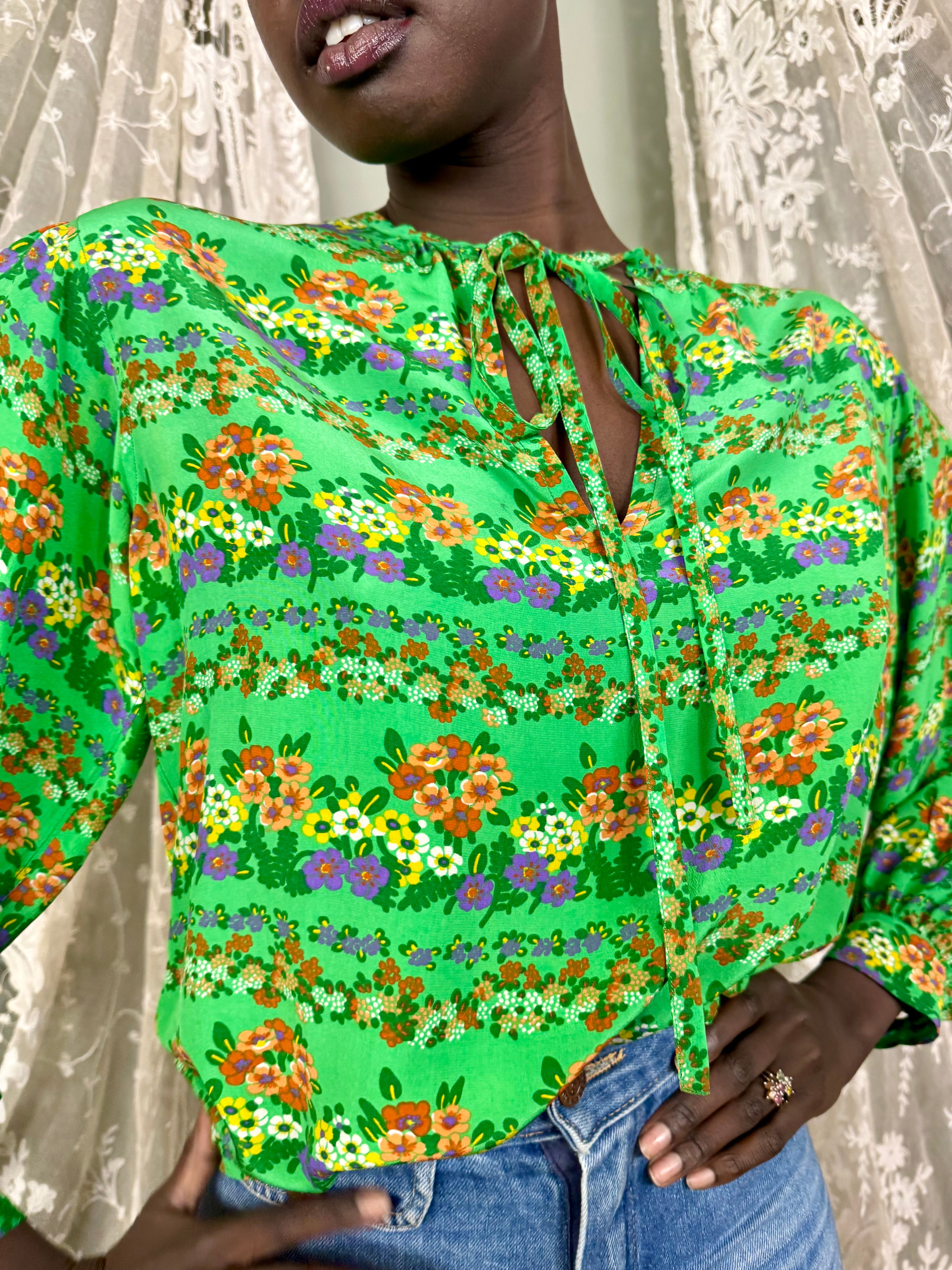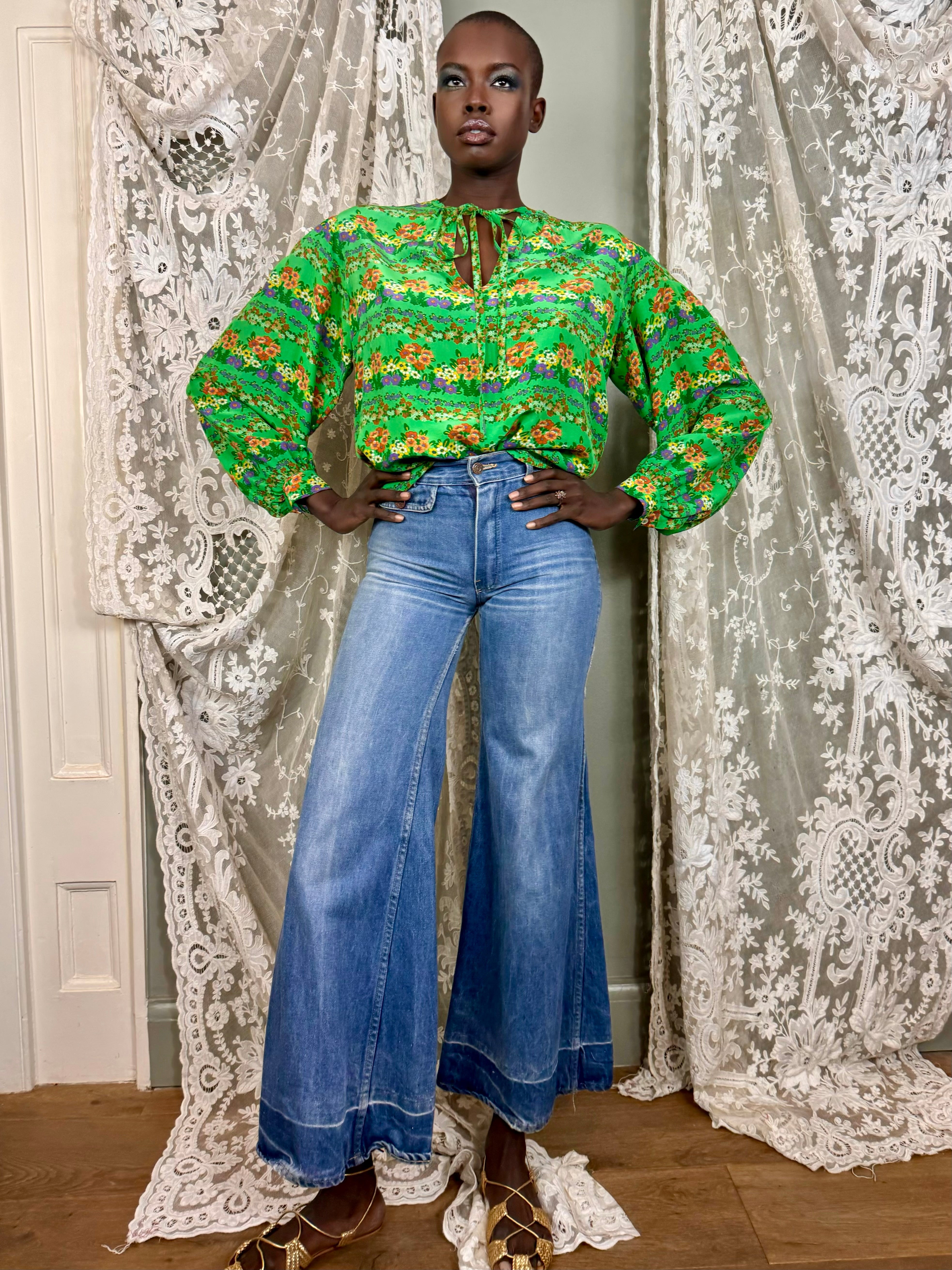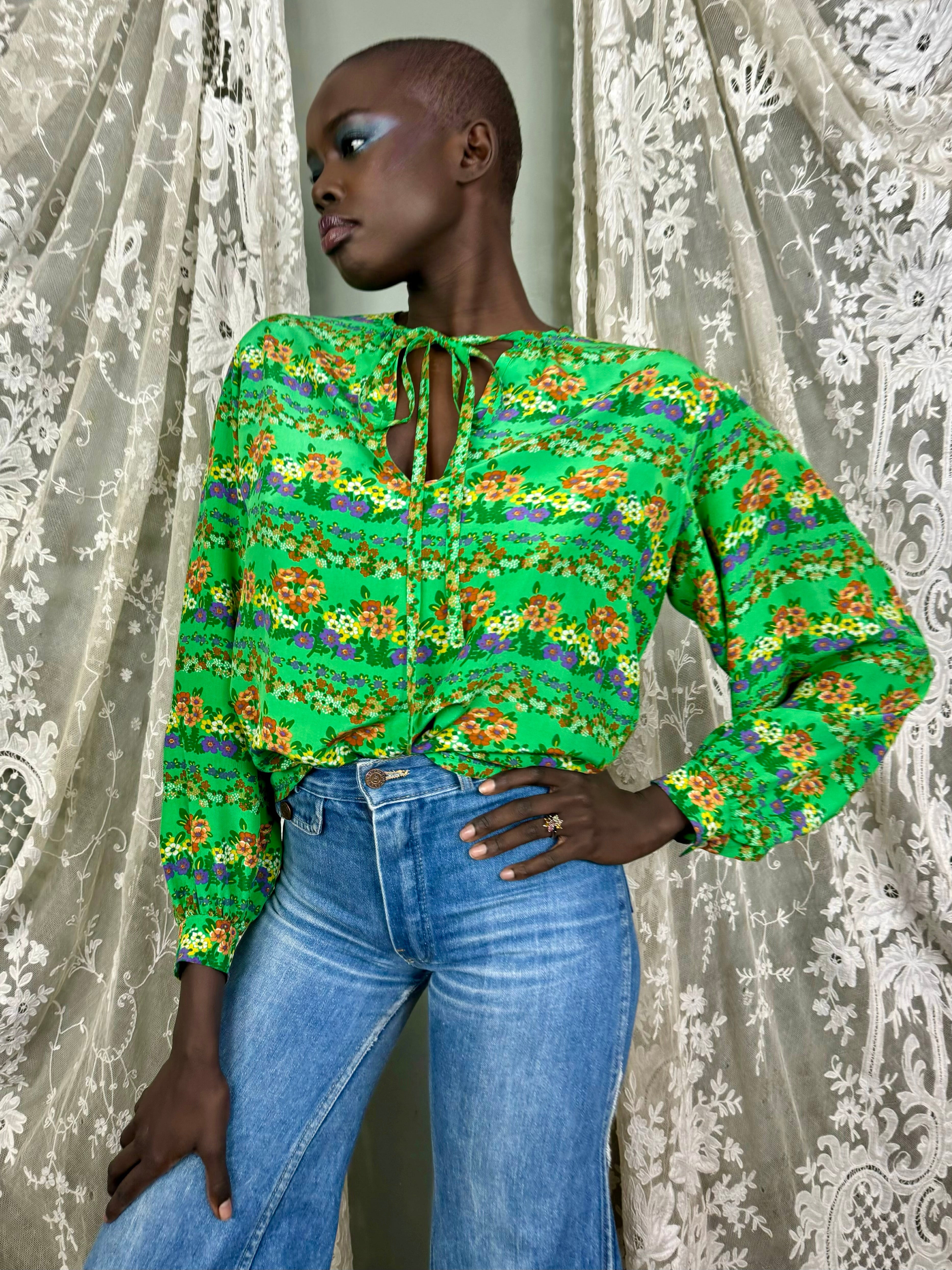 This collectible Yves Saint Laurent blouse from the 80s features a beautifully crafted silk peasant design with balloon sleeves and a front V neckline with a tie. The elegant and straight fit offers a timeless and sophisticated look.