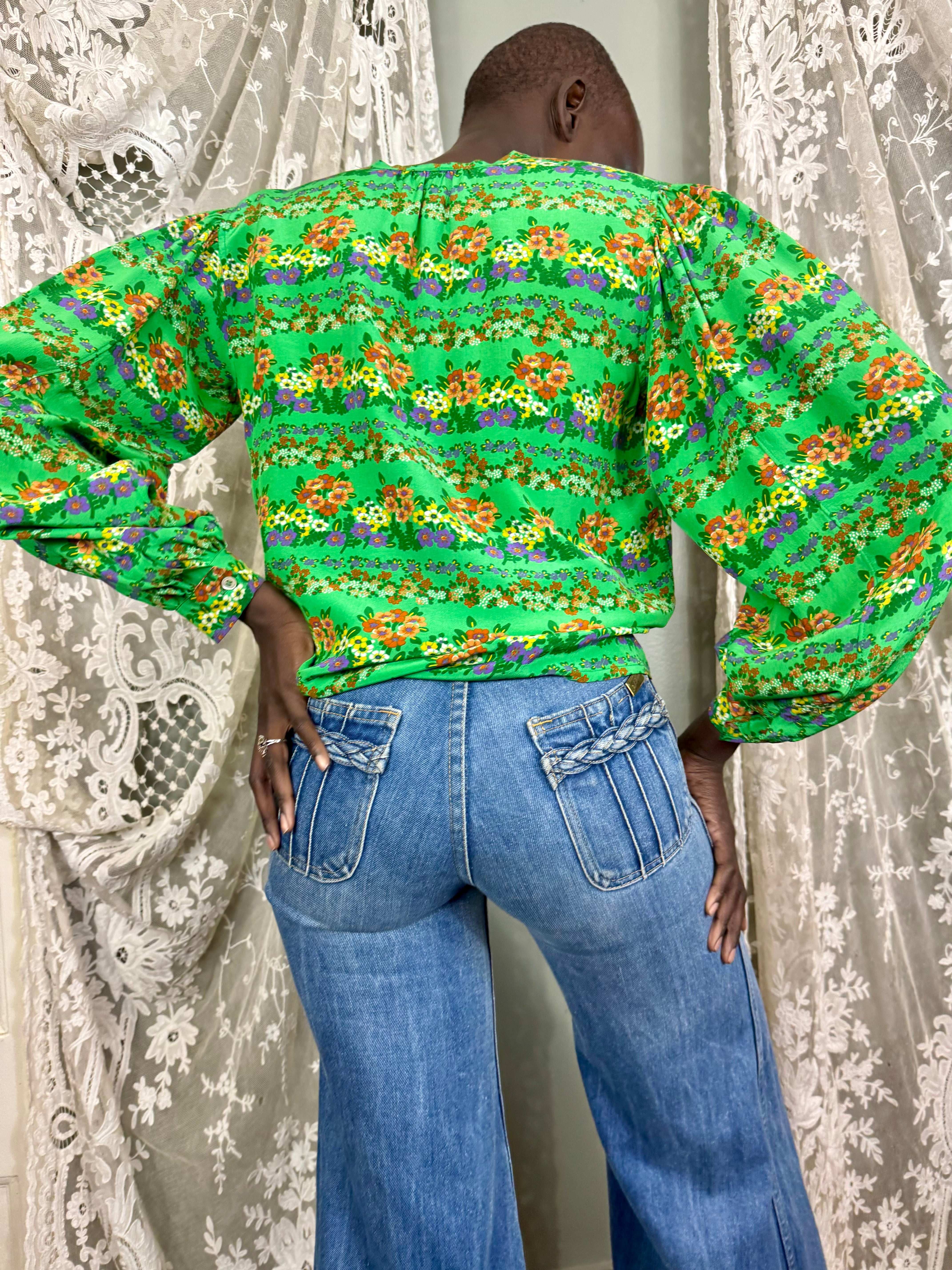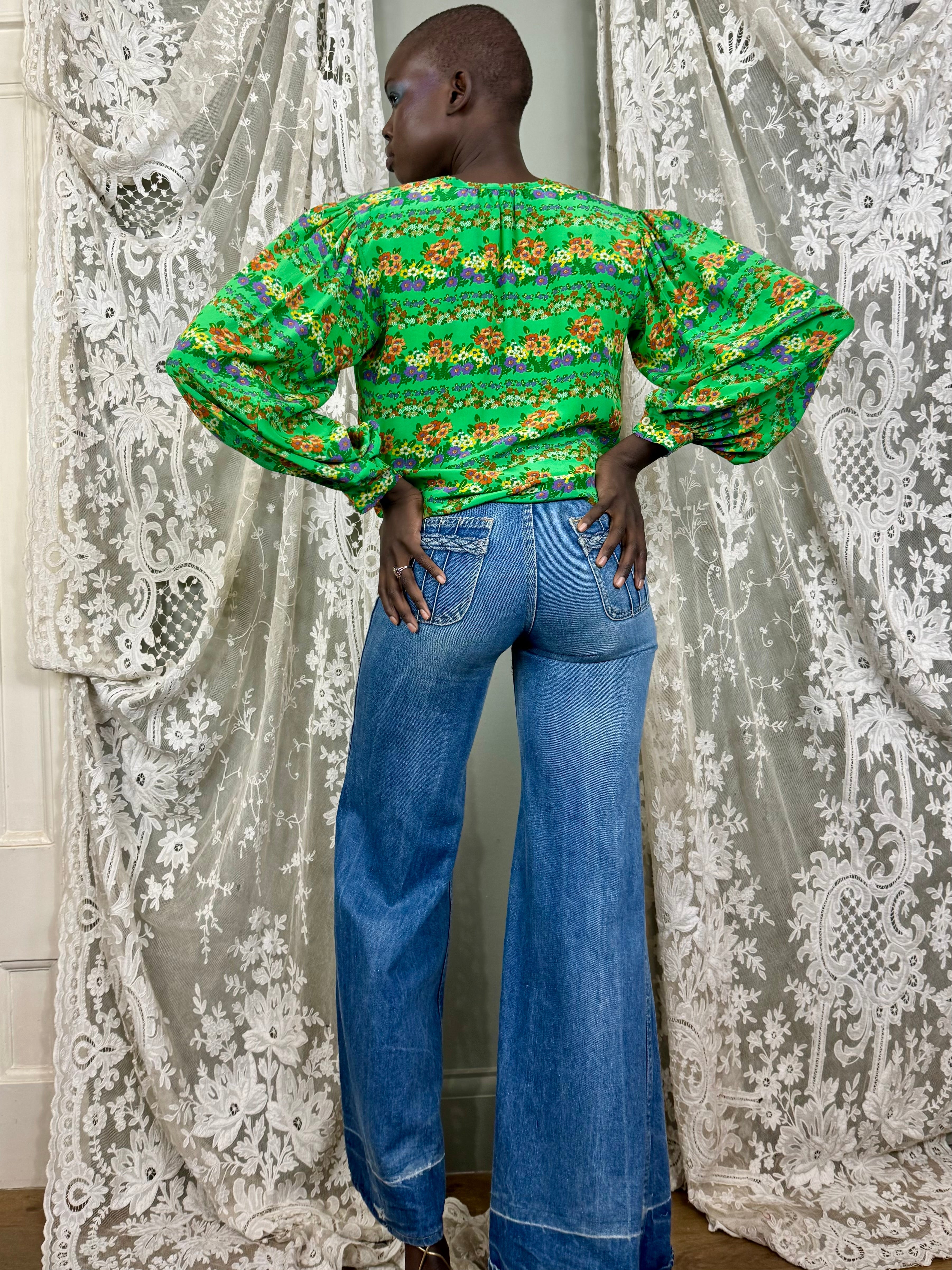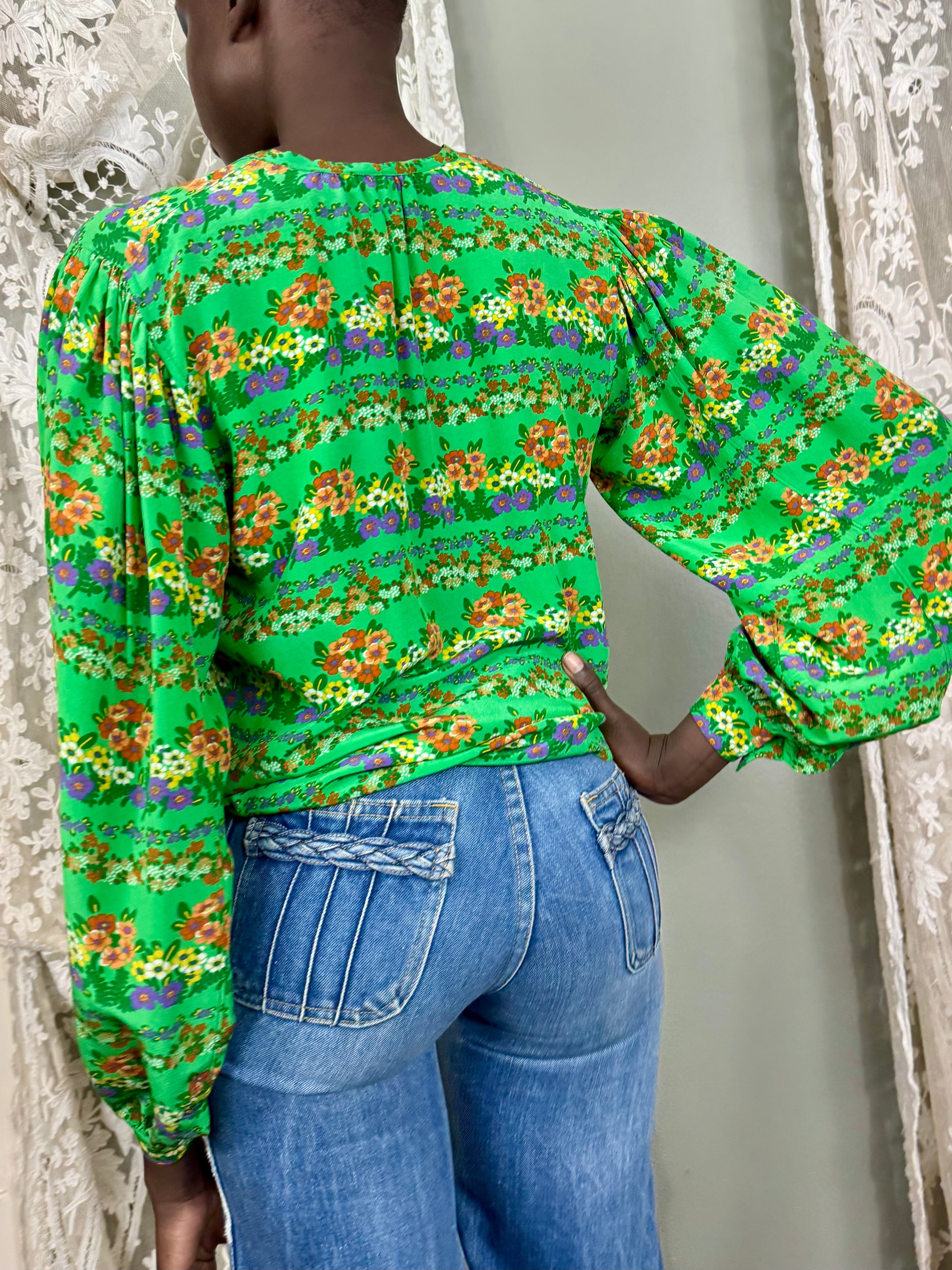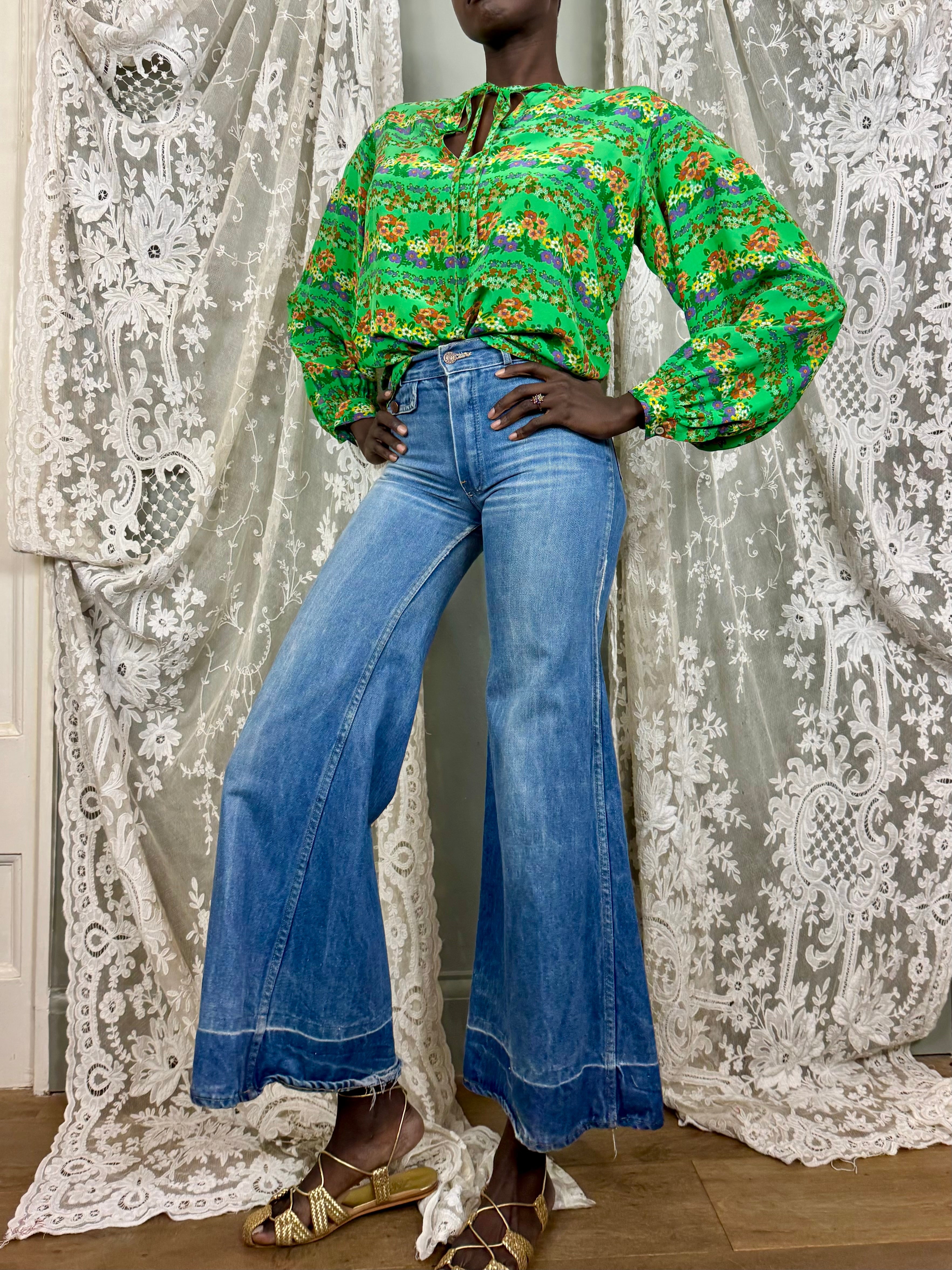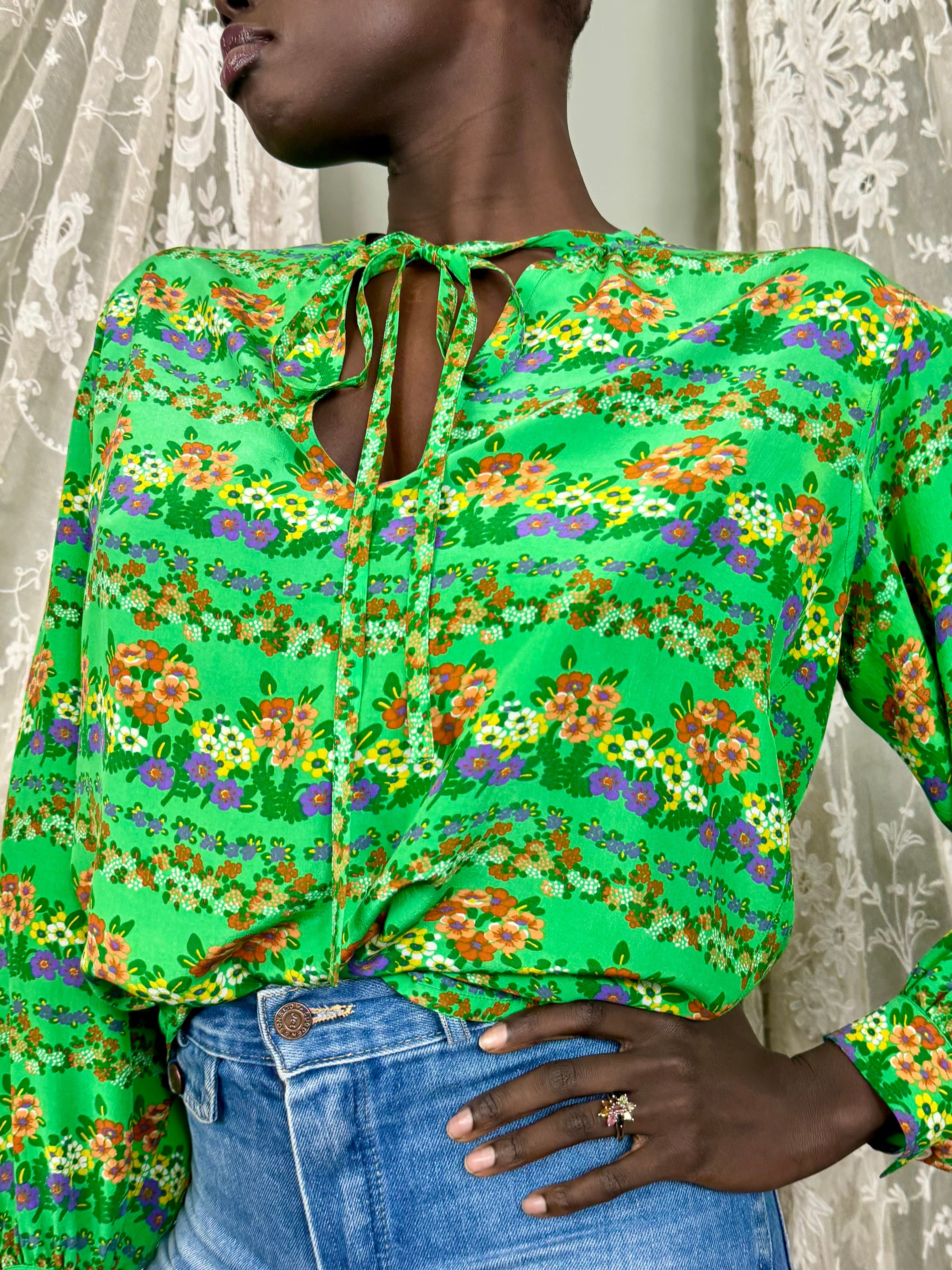 This collectible Yves Saint Laurent blouse from the 80s features a beautifully crafted silk peasant design with balloon sleeves and a front V neckline with a tie. The elegant and straight fit offers a timeless and sophisticated look.
