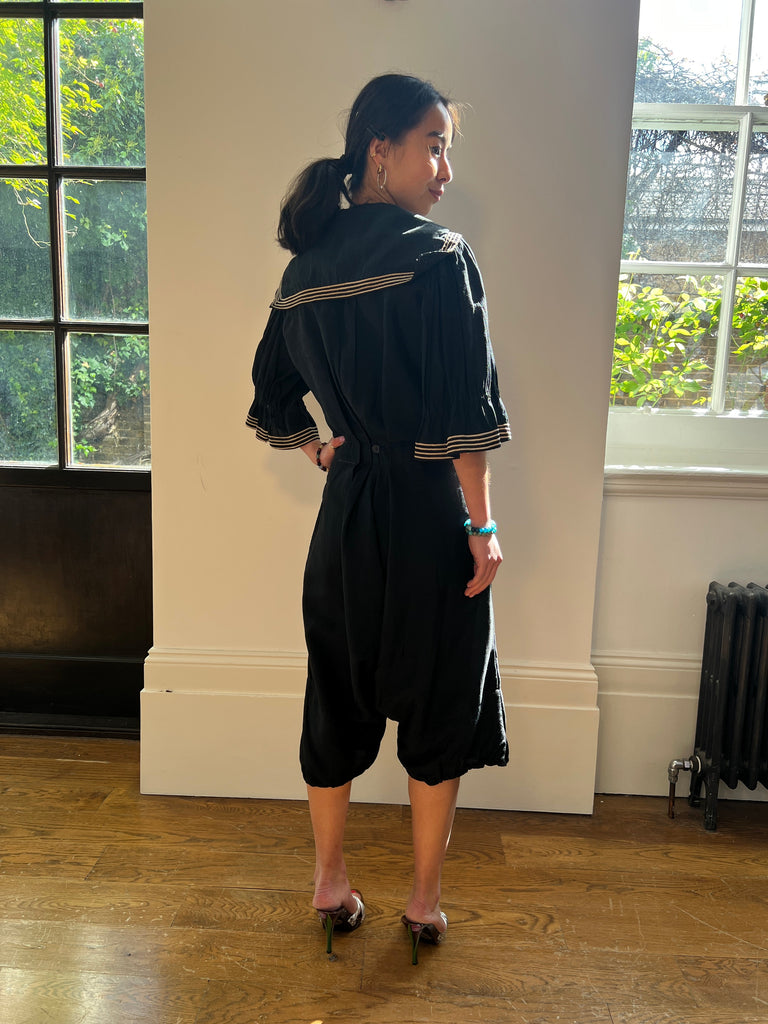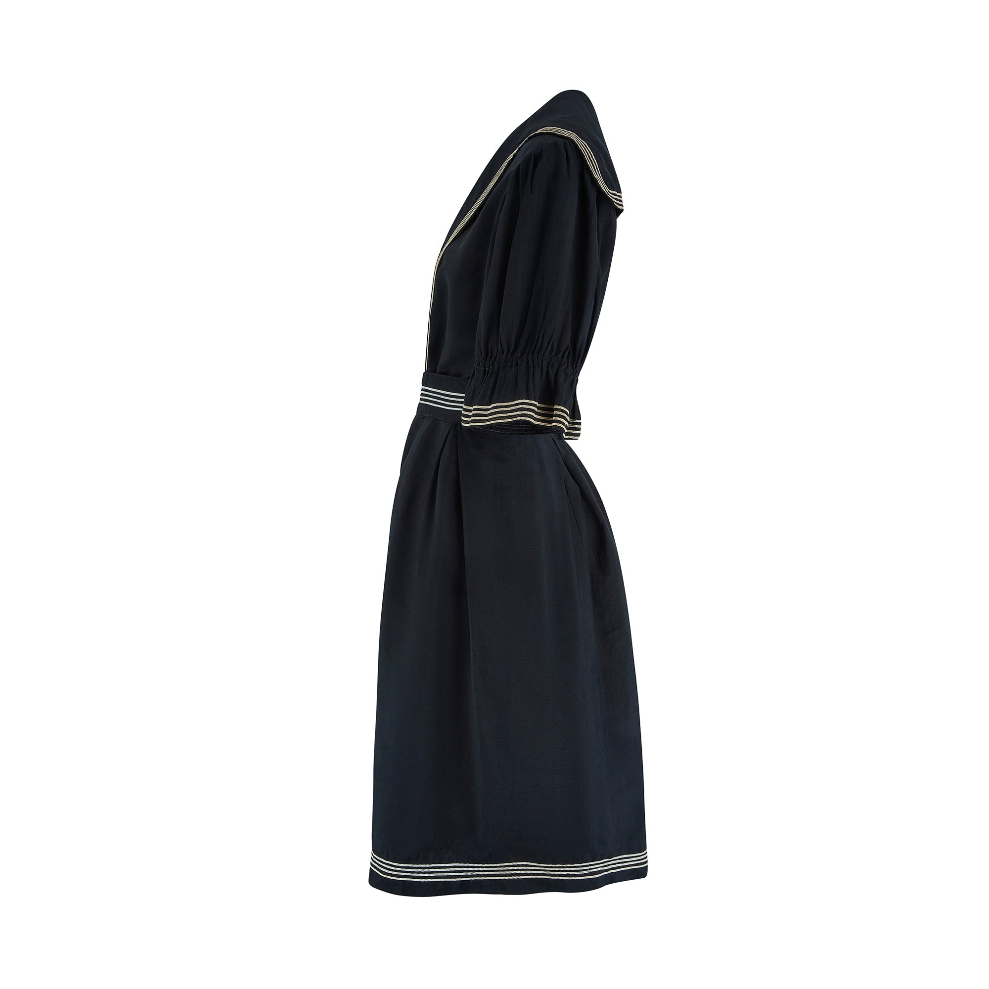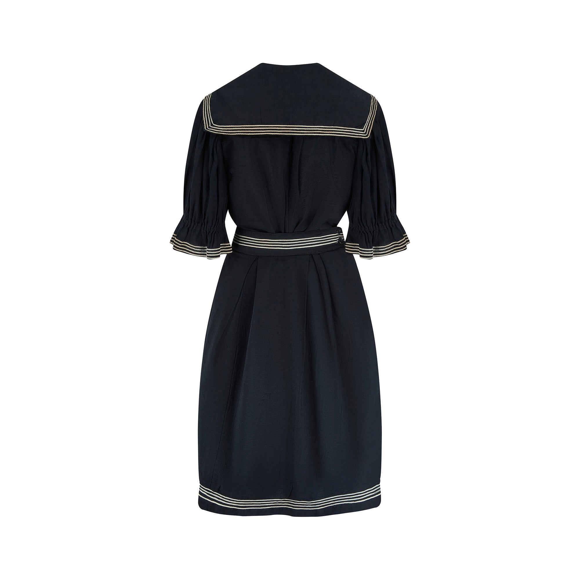 The ensemble is crafted from deep navy cotton and features nautical cream stitching running in stripes along the cuffs and collar of the romper and on the waistband and bottom hem of the skirt. The romper has a wide sailor collar alongside puff-sleeves and short bloomer leggings with gathered hems. There is a V-shaped modesty panel which nestles between the collar with an inverted chevron design which attaches to one side with a row of hidden buttons. The pleated skirt has a high waistband and fastens in a wrap-around design with a snap closure and two buttons.