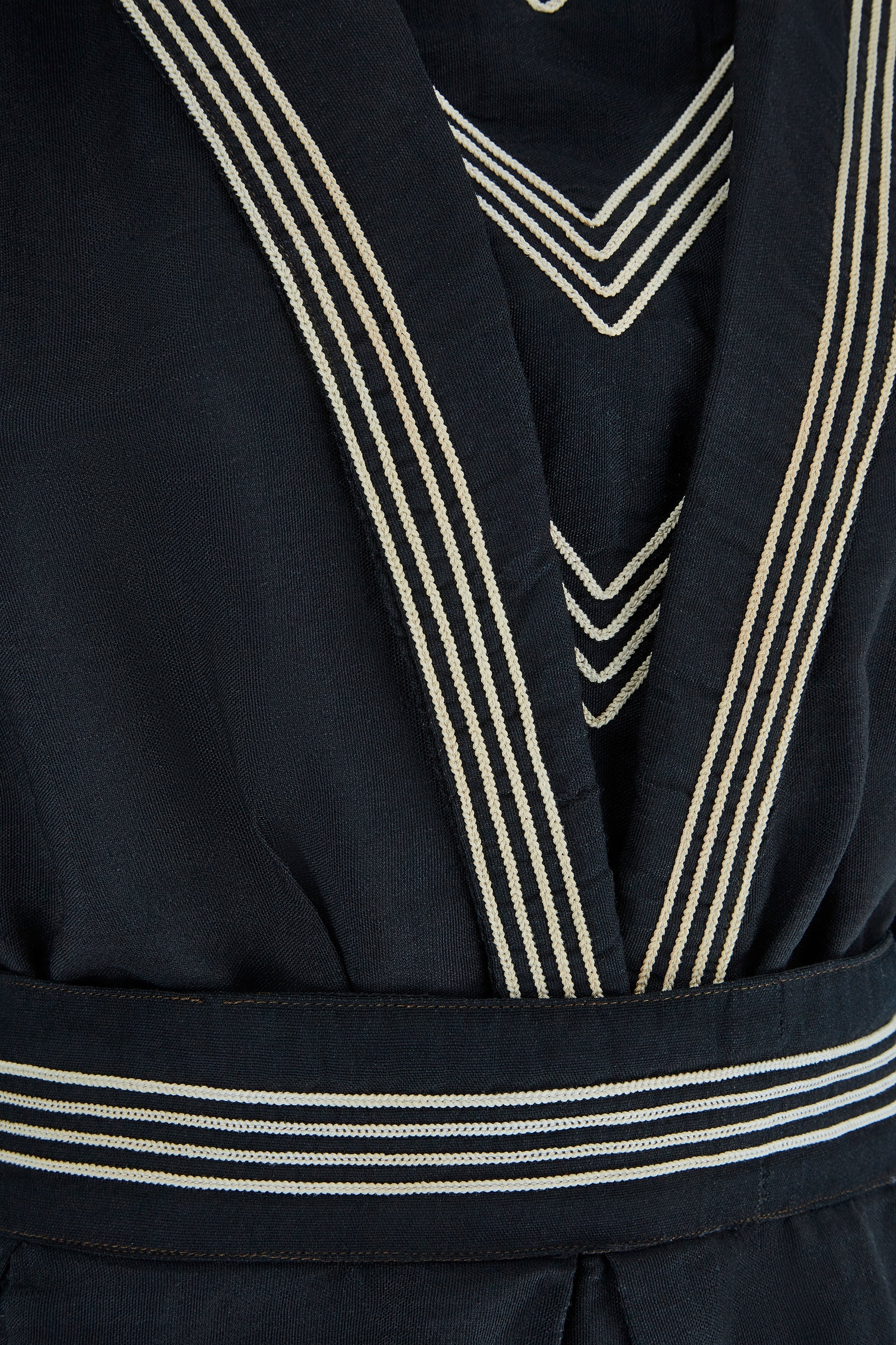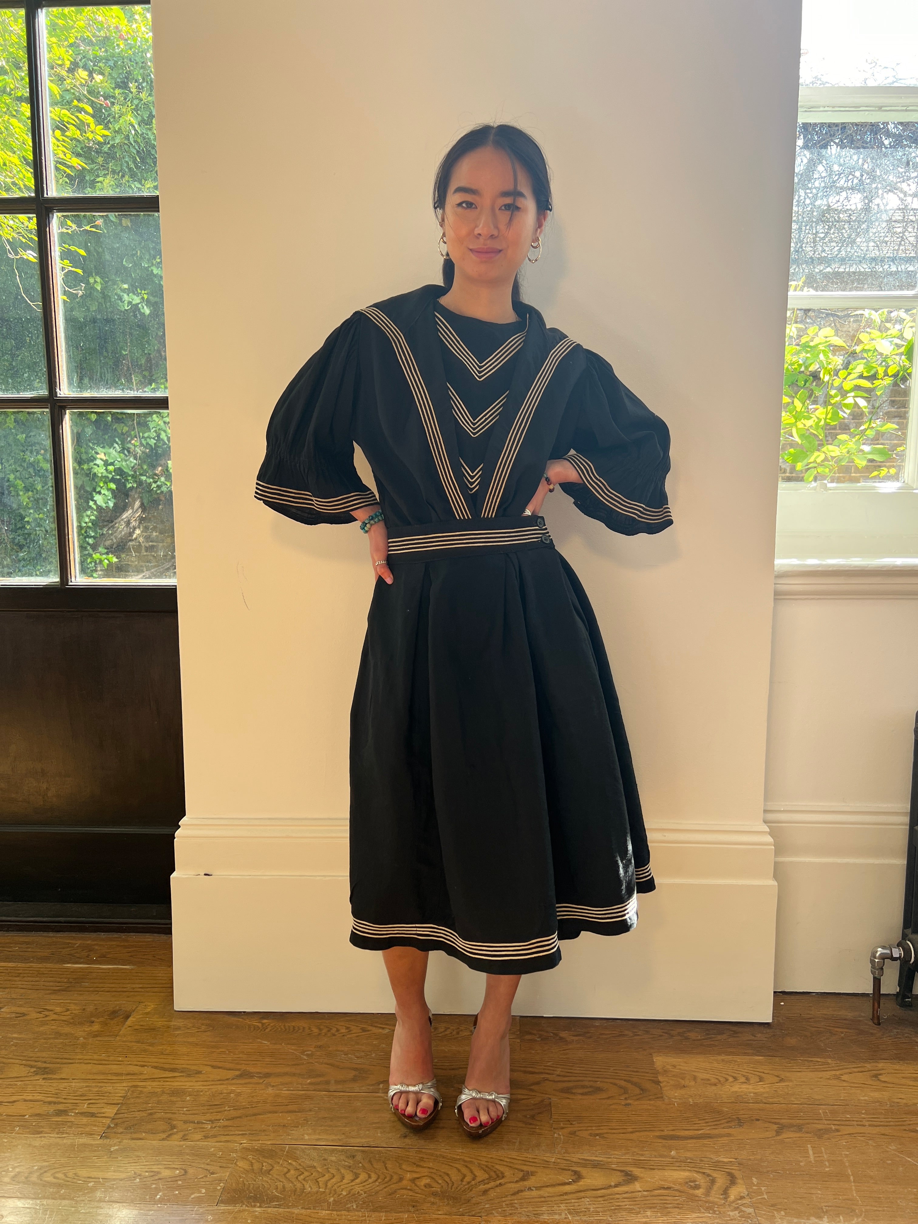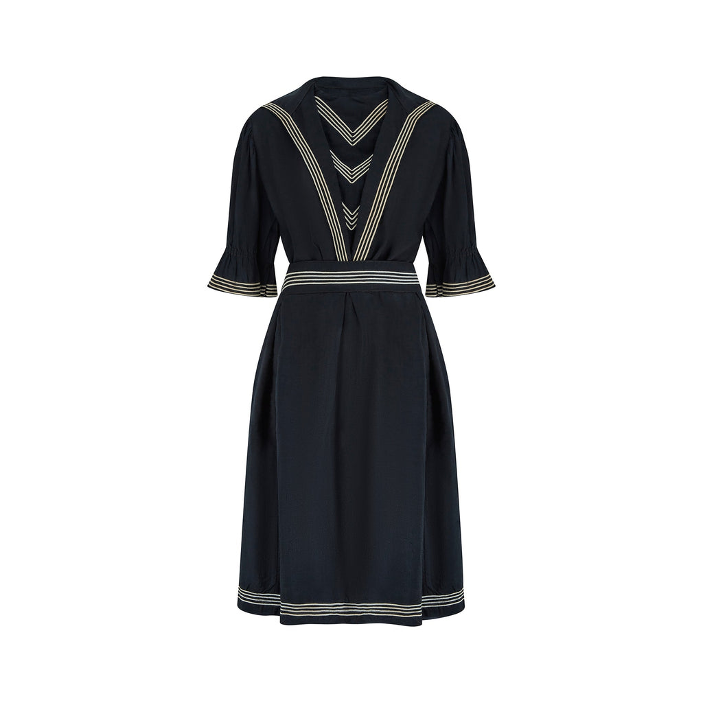 The ensemble is crafted from deep navy cotton and features nautical cream stitching running in stripes along the cuffs and collar of the romper and on the waistband and bottom hem of the skirt. The romper has a wide sailor collar alongside puff-sleeves and short bloomer leggings with gathered hems. There is a V-shaped modesty panel which nestles between the collar with an inverted chevron design which attaches to one side with a row of hidden buttons. The pleated skirt has a high waistband and fastens in a wrap-around design with a snap closure and two buttons.