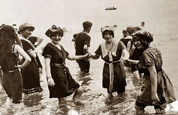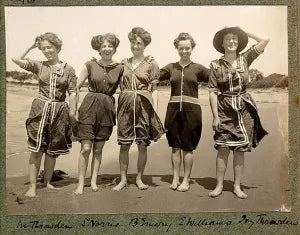 Circa 1900, this original bathing suit is composed of two separate garments; a high-waisted skirt and romper-style playsuit. It would have been traditionally worn with the skirt over the romper. Many of the designs, often home sewn or dressmaker made from available sewing patterns, referenced naval styles and were fashionable for bathers from the late 1880s through to around 1910.