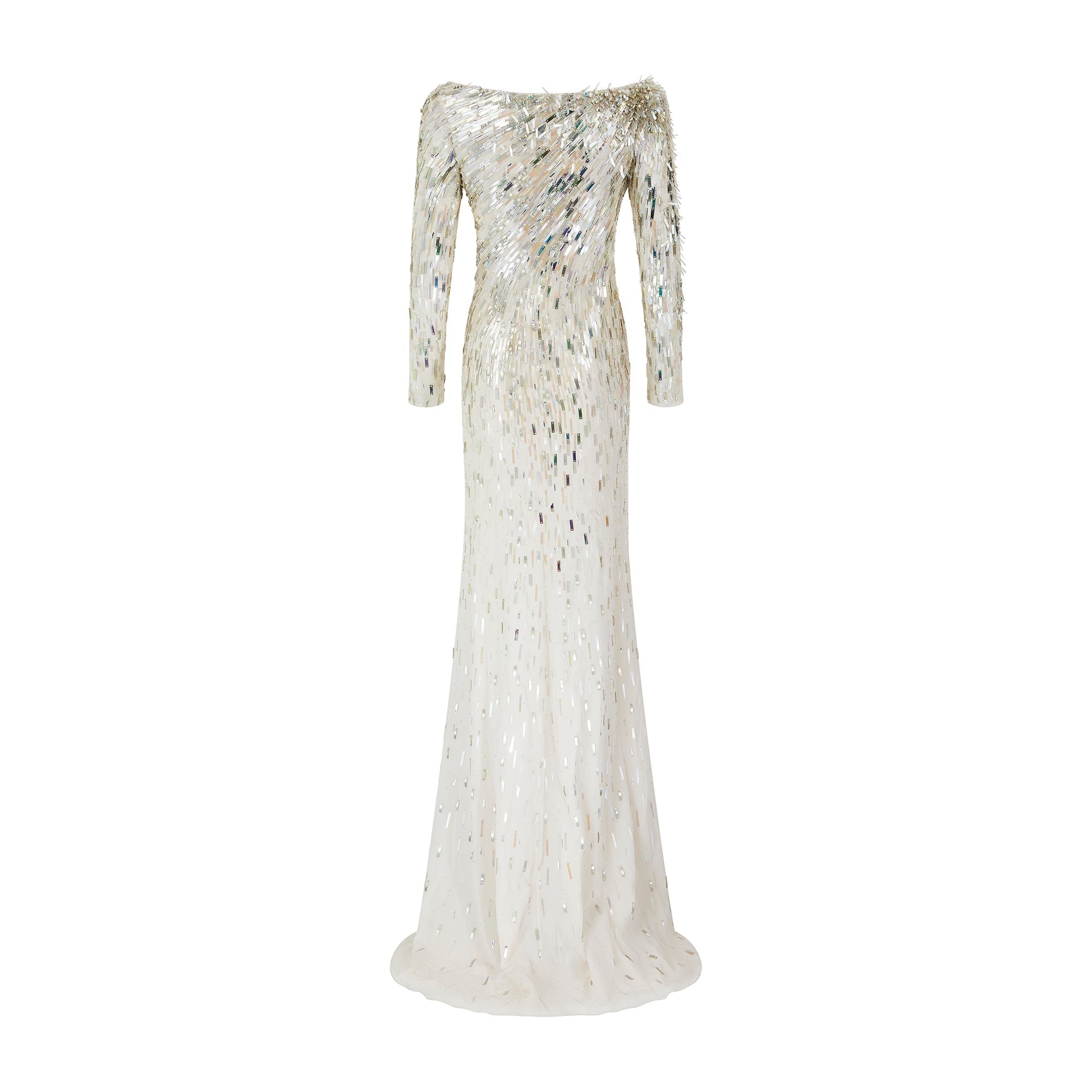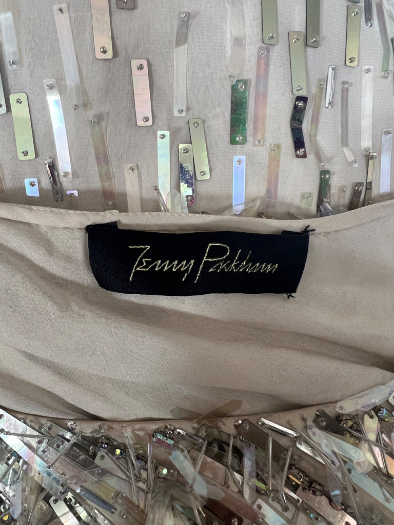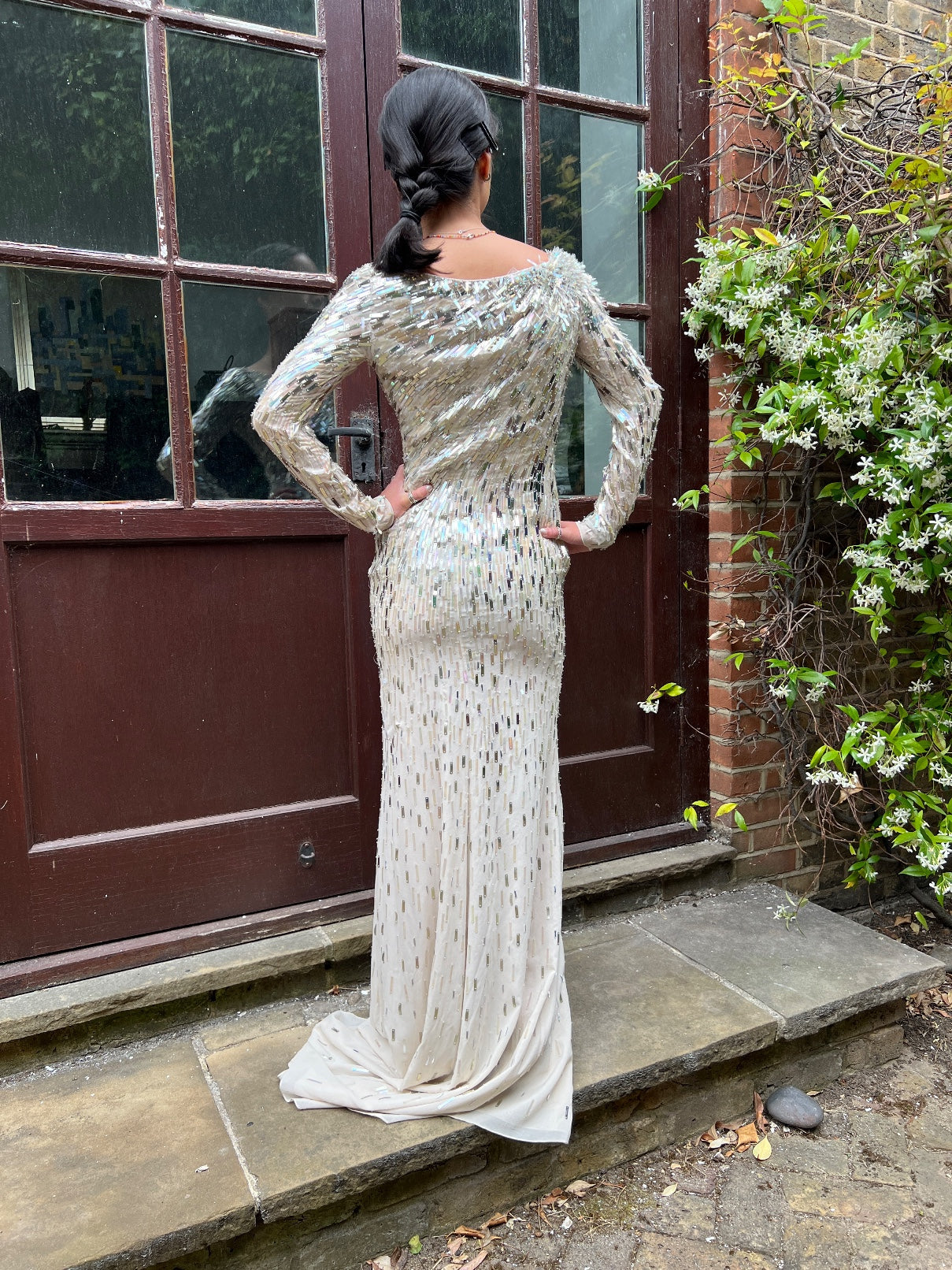 This high octane gown was designed by British designer and occasion-wear specialist Jenny Packham in the early 2010s and was probably part of a bridal or resort collection. Tailored from pale champagne silk with a semi-sheer finish, the silhouette is incredibly flattering, skimming the body and giving way to a graceful train at the back. A high slit in the front for the skirt breaks up the solid construction. The wide neckline adds to the classic elegance, revealing the collarbones. True to Packham’s signature glamorous style, this gown is smothered in iridescent rectangular palette sequins and dotted with rhinestones. Beginning at the right shoulder, these high-shine adornments are masterfully adorned to appear to fade as they cascade down the body, resulting in a glistening mirror ball effect as the wearer moves. It fastens down the side under the left arm with a tonal hidden zip.