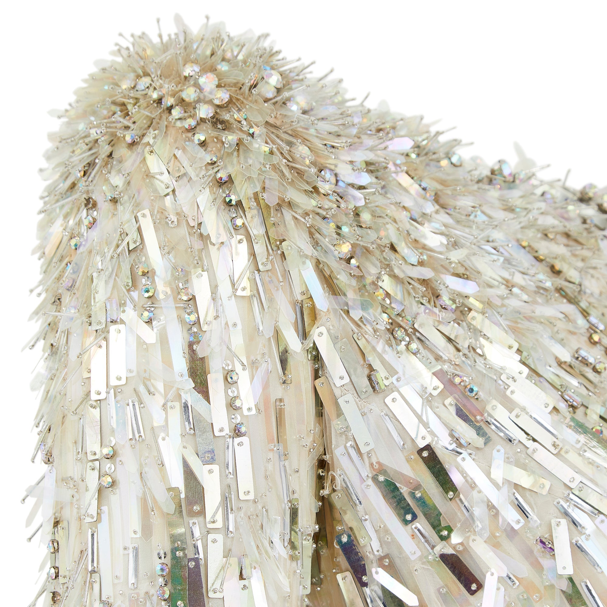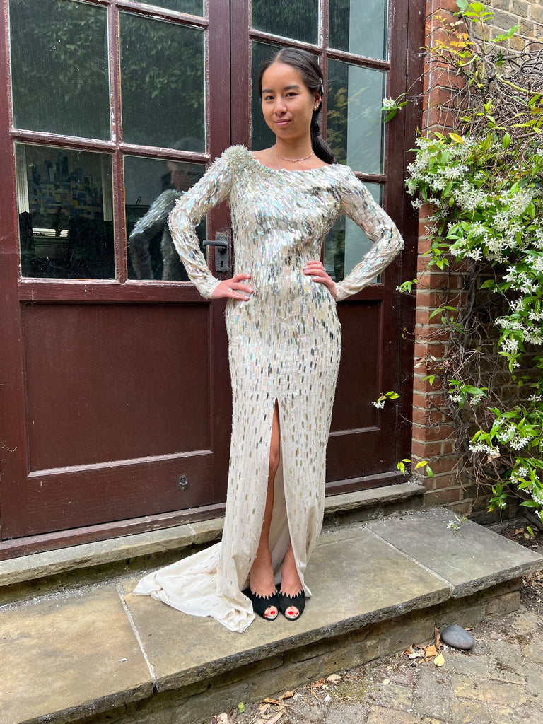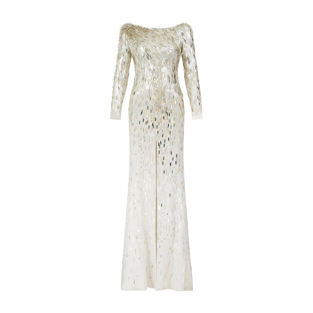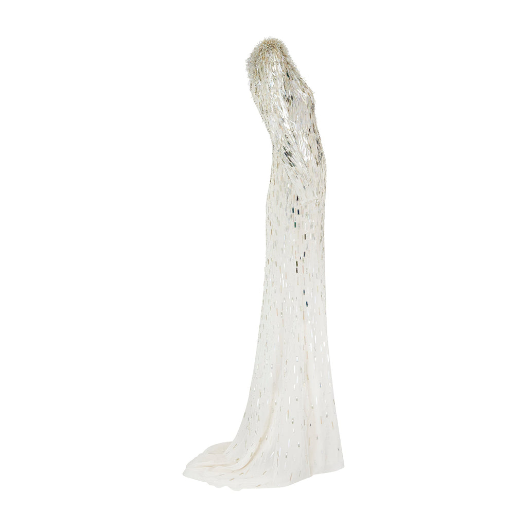 This high octane gown was designed by British designer and occasion-wear specialist Jenny Packham in the early 2010s and was probably part of a bridal or resort collection. Tailored from pale champagne silk with a semi-sheer finish, the silhouette is incredibly flattering, skimming the body and giving way to a graceful train at the back. A high slit in the front for the skirt breaks up the solid construction. The wide neckline adds to the classic elegance, revealing the collarbones. True to Packham’s signature glamorous style, this gown is smothered in iridescent rectangular palette sequins and dotted with rhinestones. Beginning at the right shoulder, these high-shine adornments are masterfully adorned to appear to fade as they cascade down the body, resulting in a glistening mirror ball effect as the wearer moves. It fastens down the side under the left arm with a tonal hidden zip.