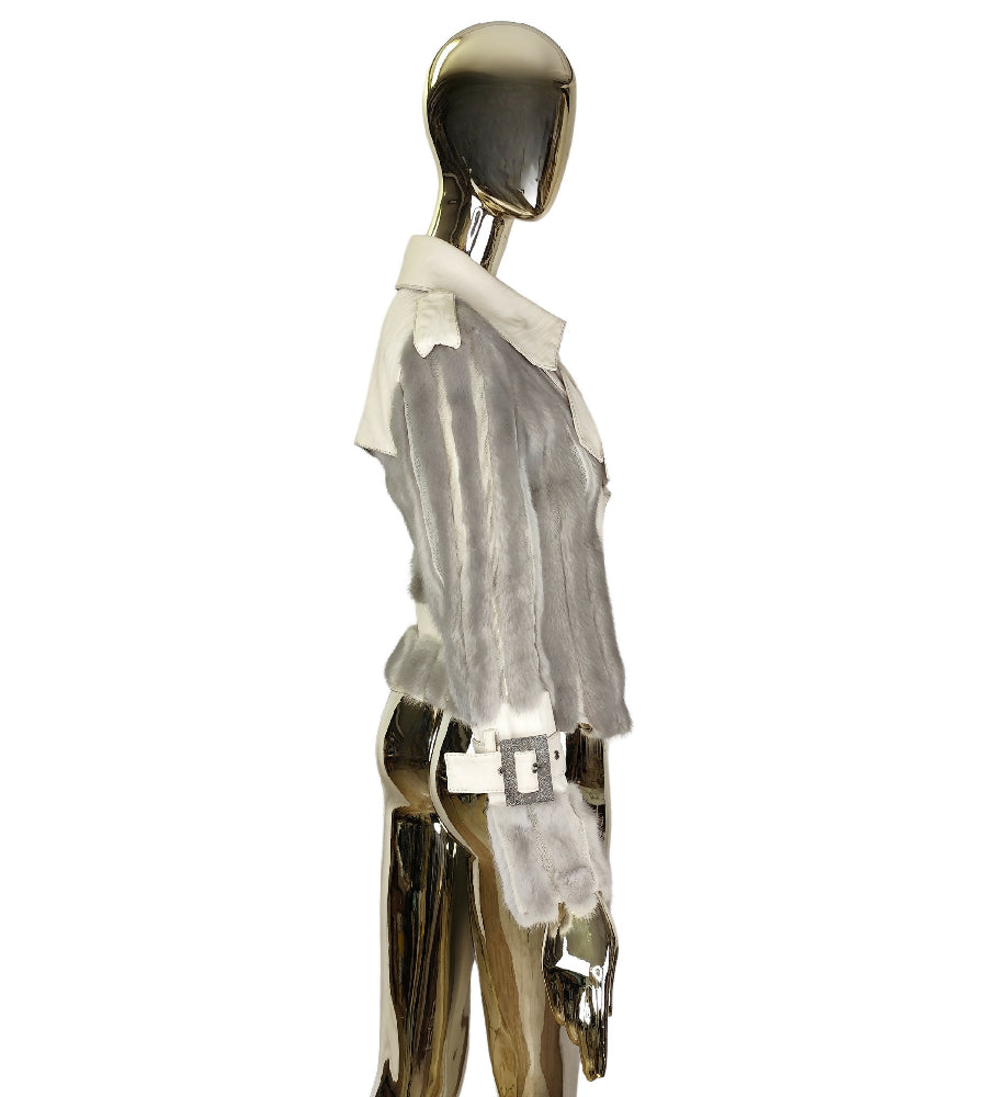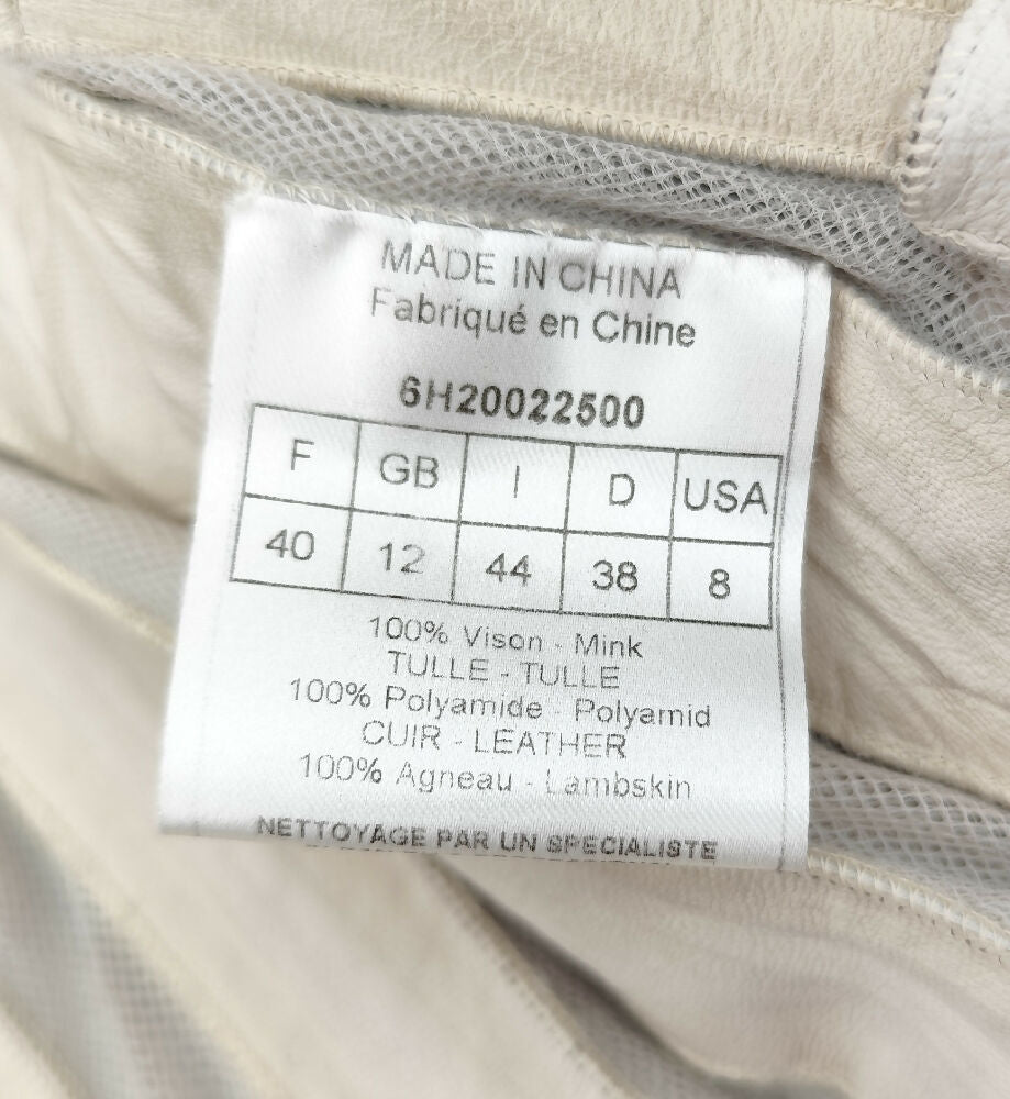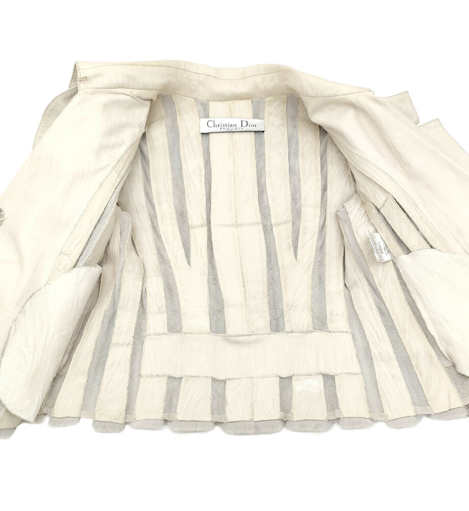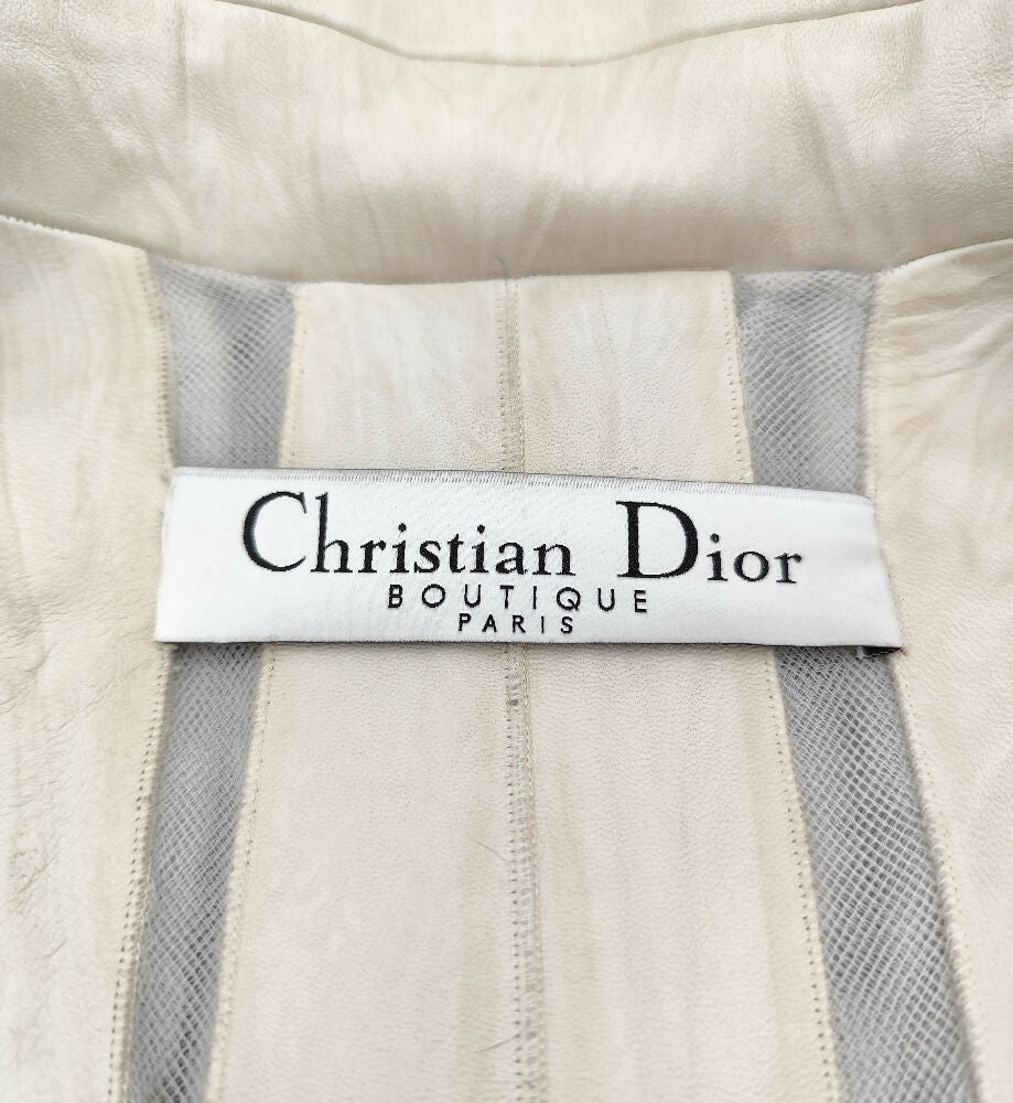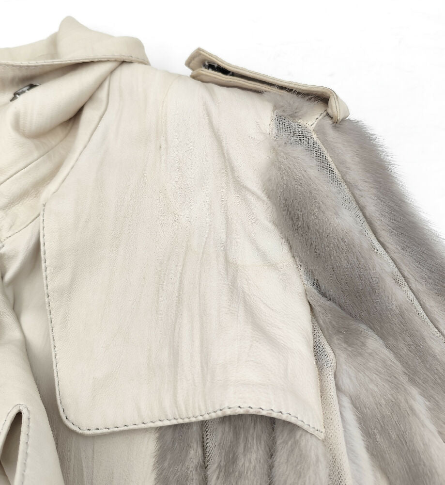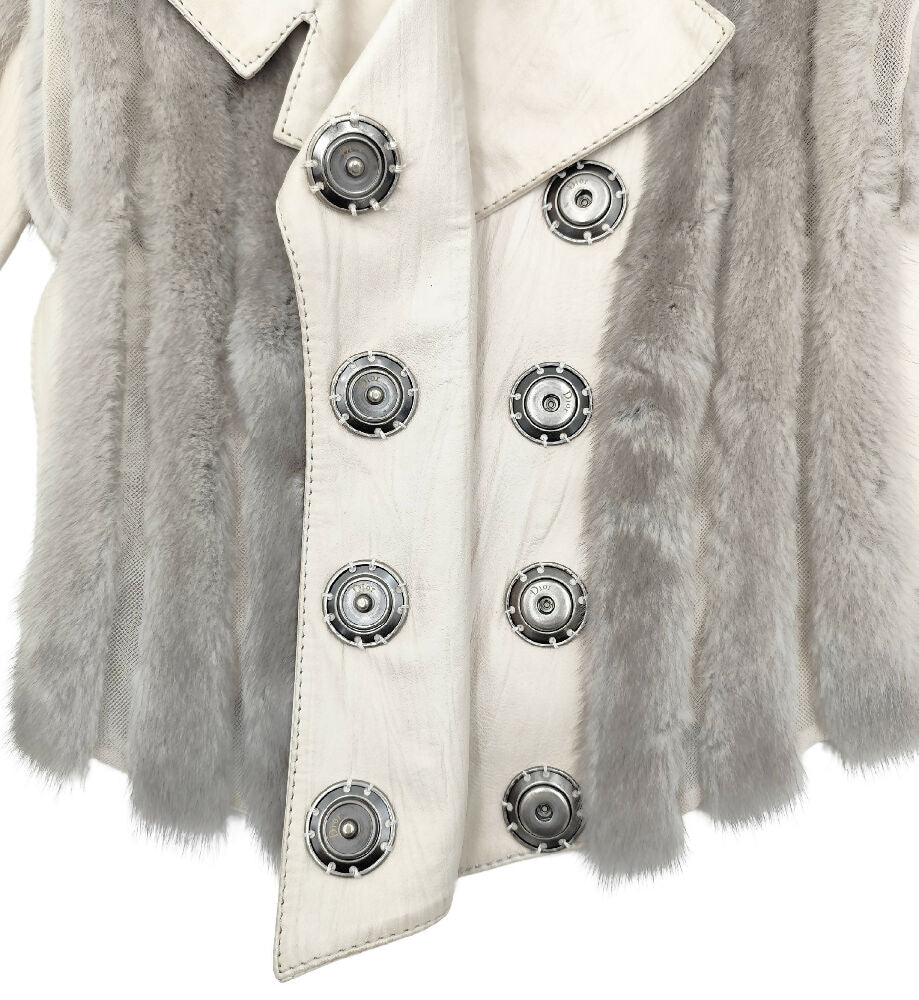 PLEASE NOTE: Due to the genuine fur component on this item, it can be sold and shipped exclusively within the European Union. Christian Dior John Galliano F/W 2006 jacket White leather, mesh panels and genuine grey mink fur Silver metal engraved buckles Double breasted snap button closure Marked size 40 FR Measurements: shoulders 42 cm - 16.5 in bust 96 cm - 37.5 in waist 90 cm - 35.5 in hips 90 cm - 35.5 in length 62 cm - 24.5 in Good condition Various marks and signs of use on leather