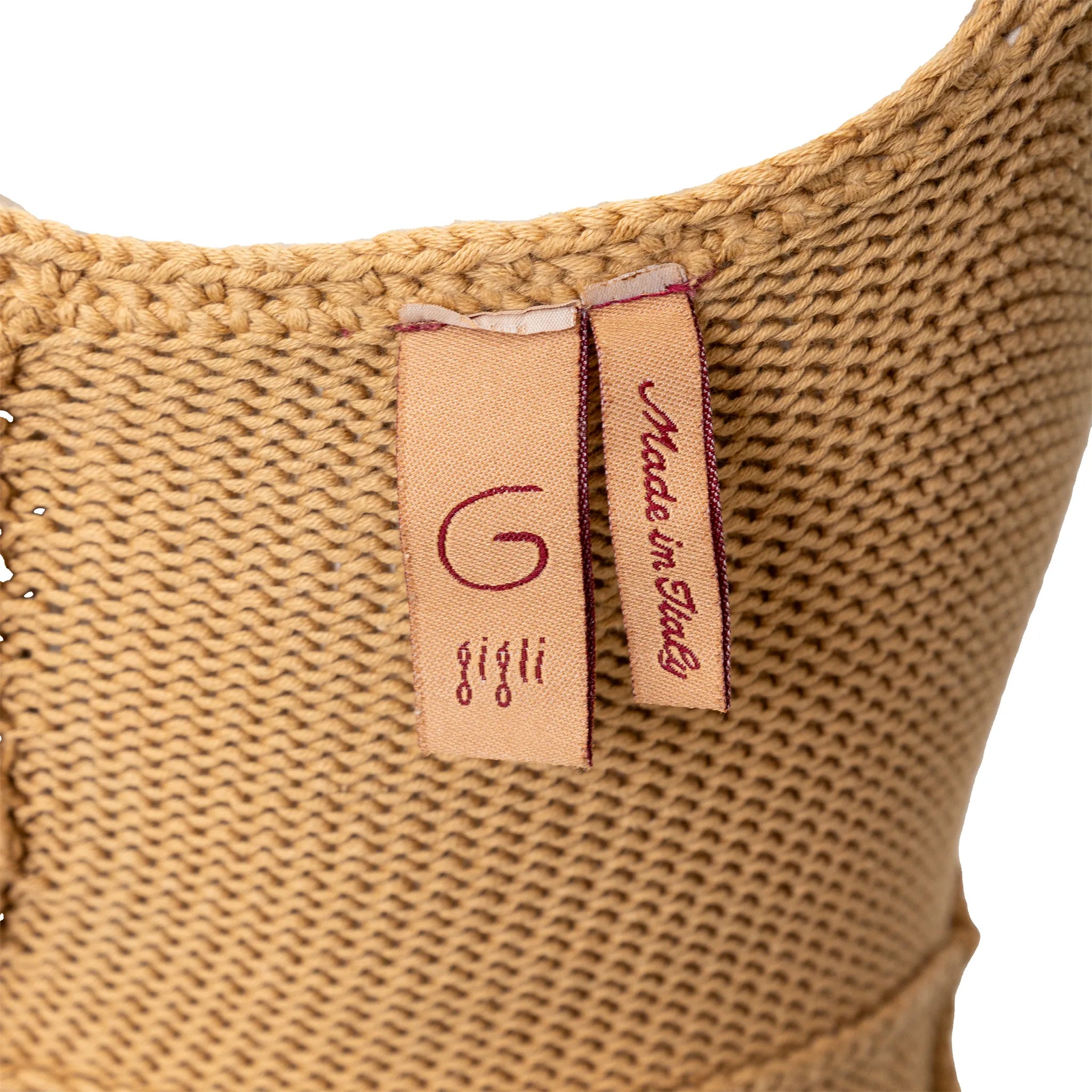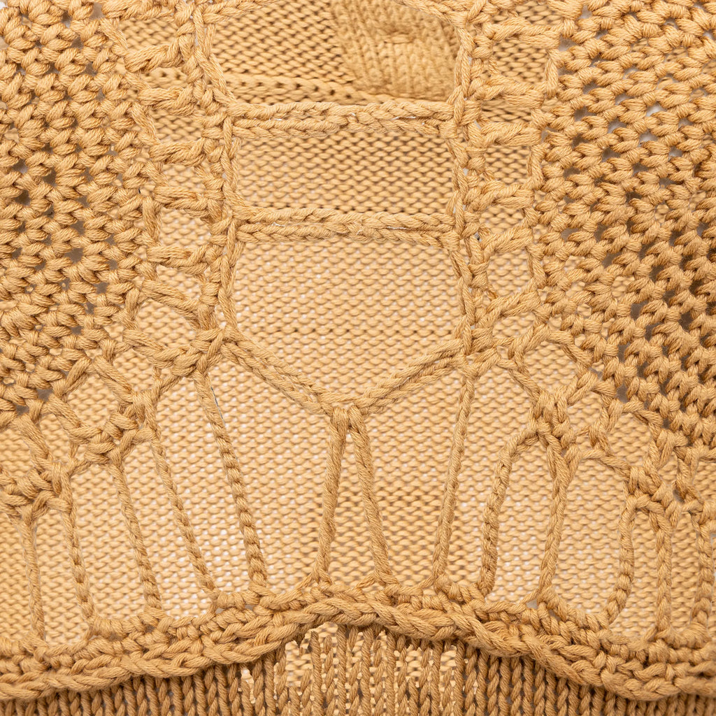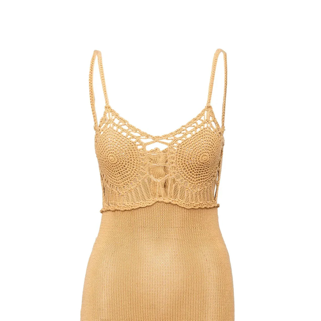Crochet mini dress by Romeo Gigli in light brown cotton, featuring thin straps and airy open-knit design. Perfect as a summer staple.