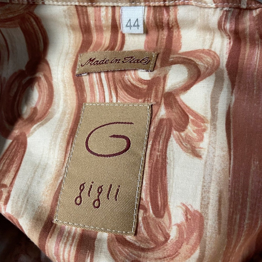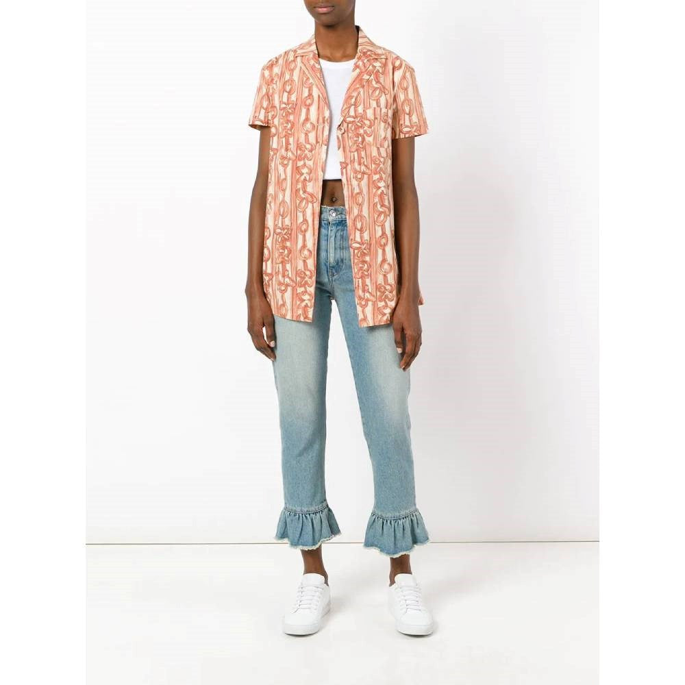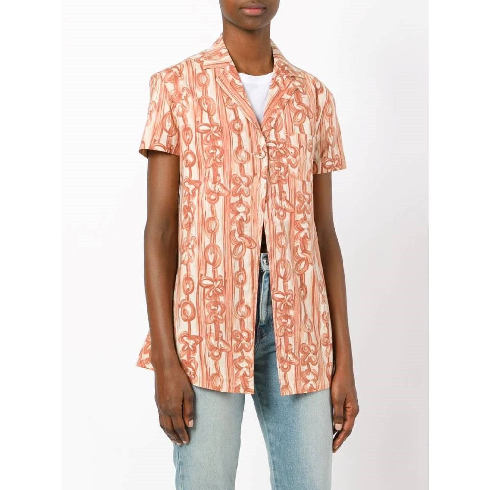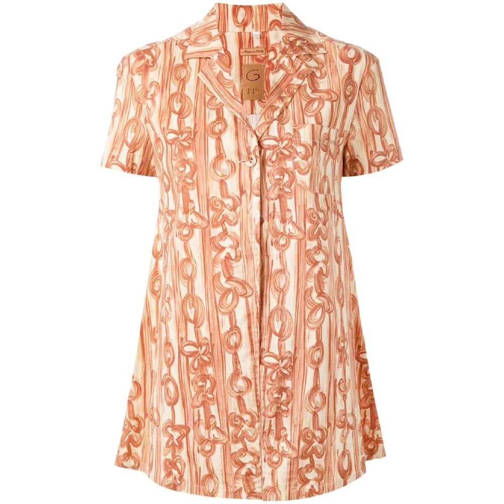 Romeo Gigli brick colored cotton 2000s shirt with floral prints. Short sleeves. Lapel collar and one frontal button closure. Chest welt pocket.