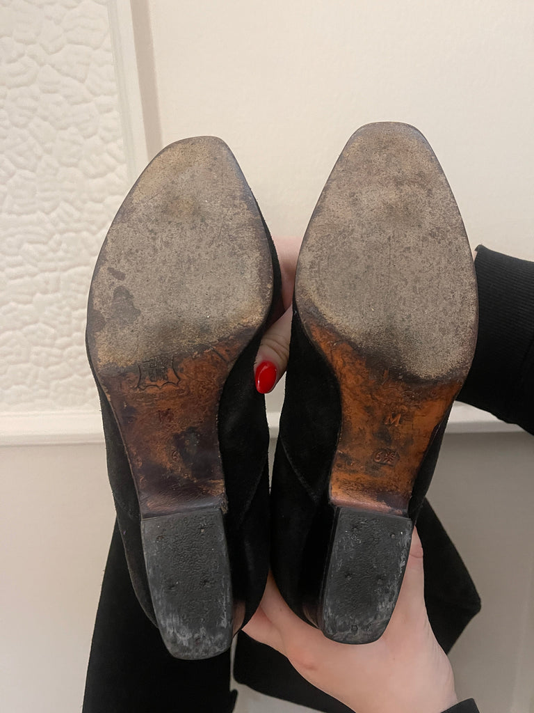 These boots are in very good vintage condition with no flaws to the suede, aside from a tiny bit of wear to the back heels - hardly noticeable when worn. The soles show wear in keeping with their age and the heels are replacements that have started to wear down (please see picture). They are labelled a US size 6M which corresponds to a UK 4 or EU 37 but please check our measurements below.