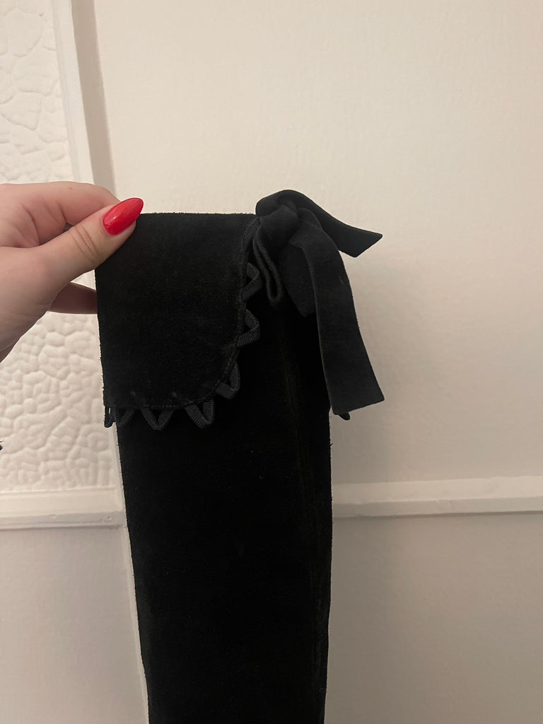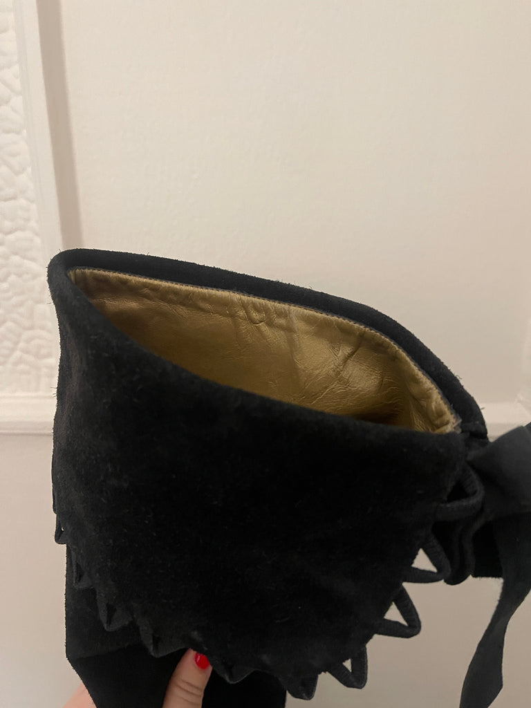 These are Circa's favourite boots and designed by Yves Saint Laurent in the late 1970s. Made with soft black suede and turned-over cuffs, finished with playful zig-zag ribbon work and tied at the back with suede bows. A gently bohemian take on the classic pirate style, with a low 1.1-inch heel for easy wear. The insides are lined in smooth gold leather with the designer's name at the bottom. Made in Italy, they are stamped “Cuir” (leather) on the sole.