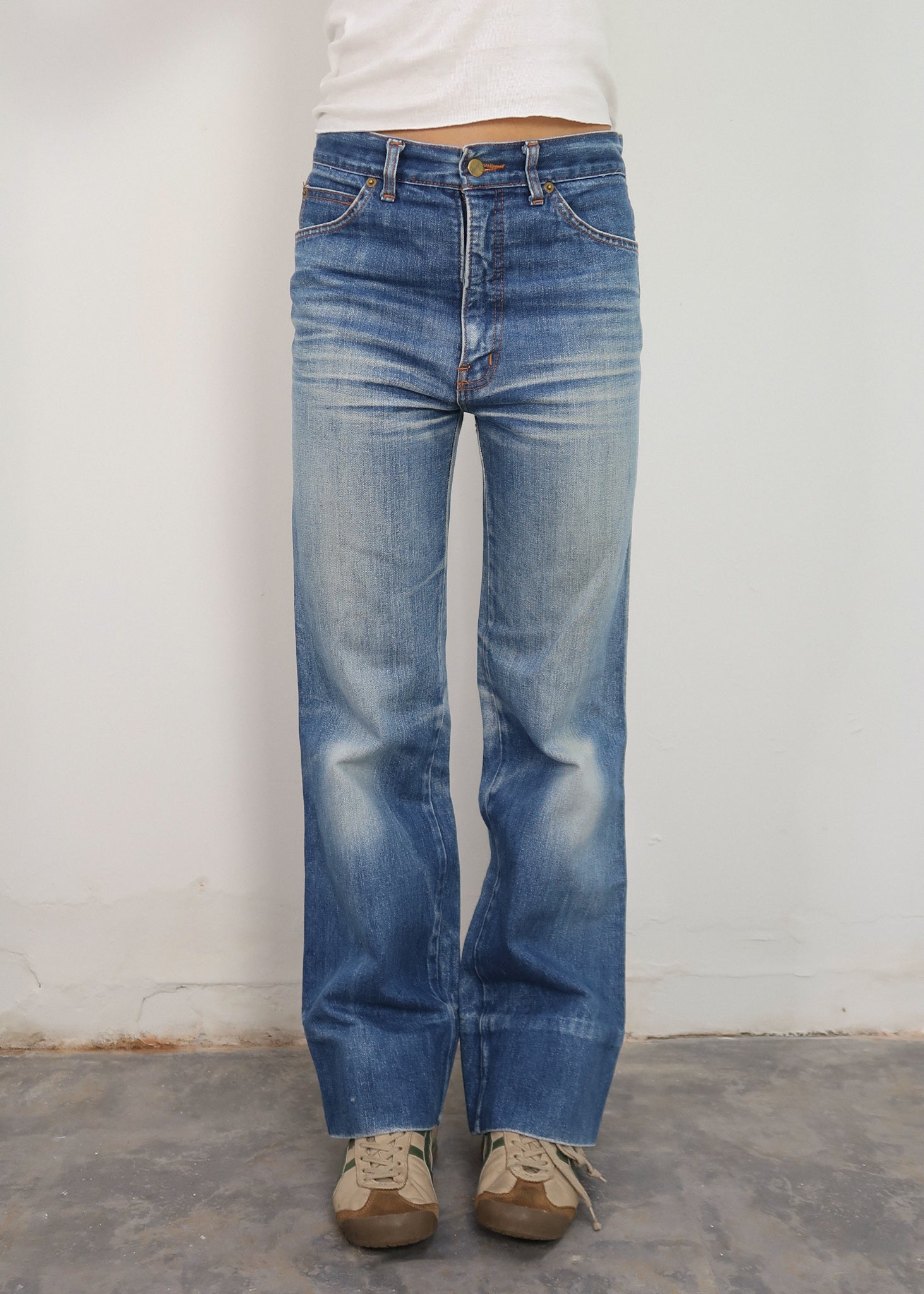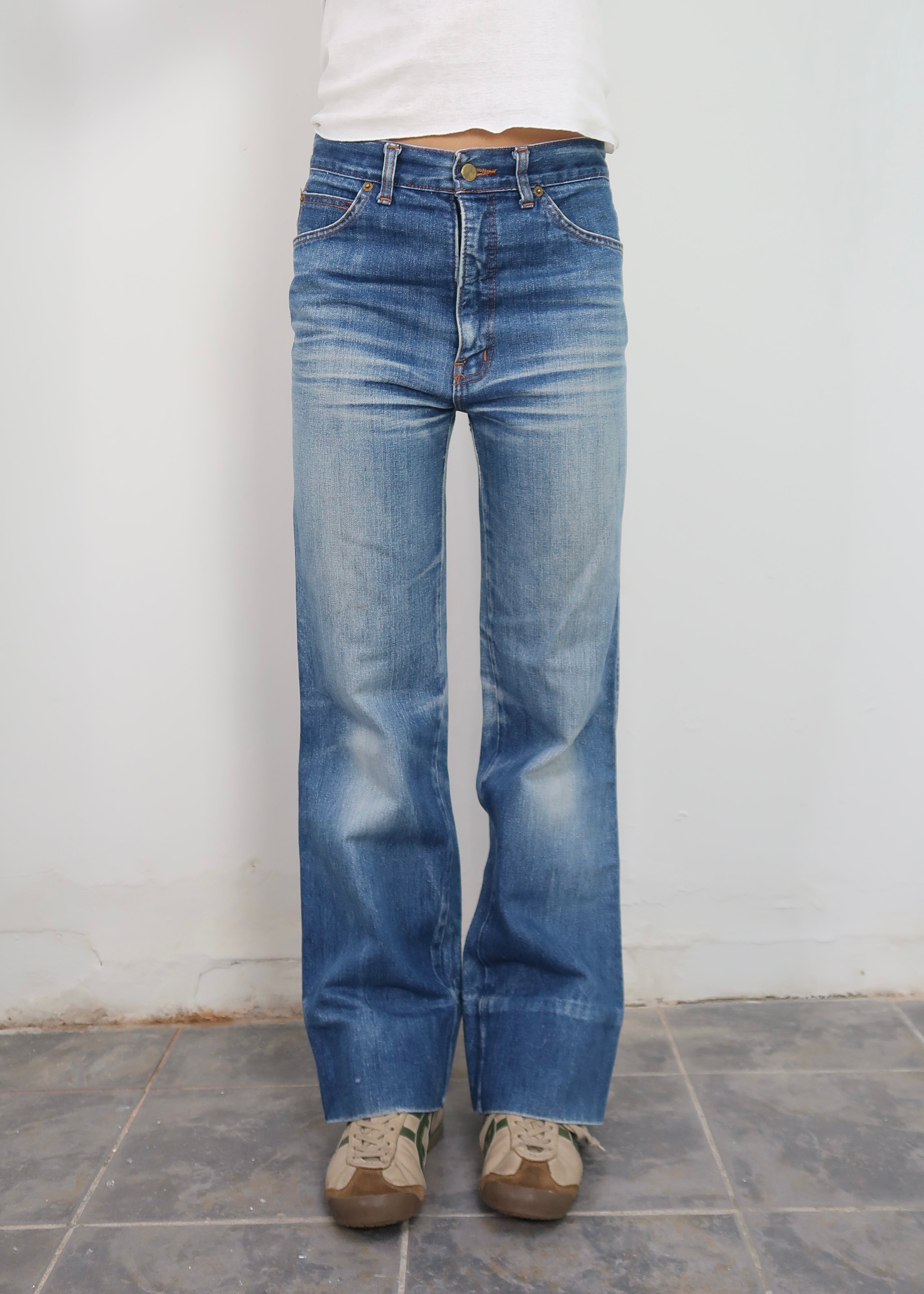 A GREAT PAIR OF 1970S BRUTUS GOLD JEANS. STRAIGHT WIDE LEG, GREAT FADING AND WHISKERING.