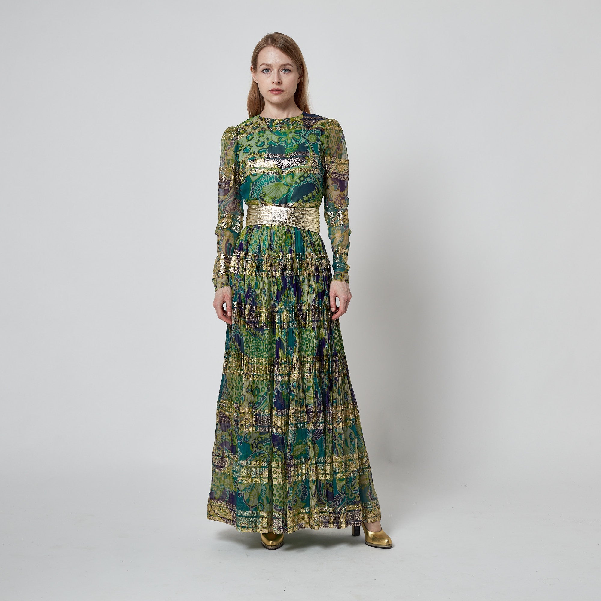 1970s Green and Gold Long-Sleeve Metallic Lame Maxi-Dress