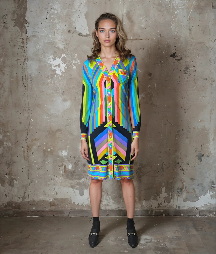 This 1970's Original Vintage Multi - Coloured Leonard Dress is in great condition. It features, gold buttons up the front, on the pocket and cuffs and has long sleeves and a matching belt. Its incredible print is a real show stopper. Due to its design it would fit a UK size 10 - 12 so please do check the measurements to avoid disappointment.