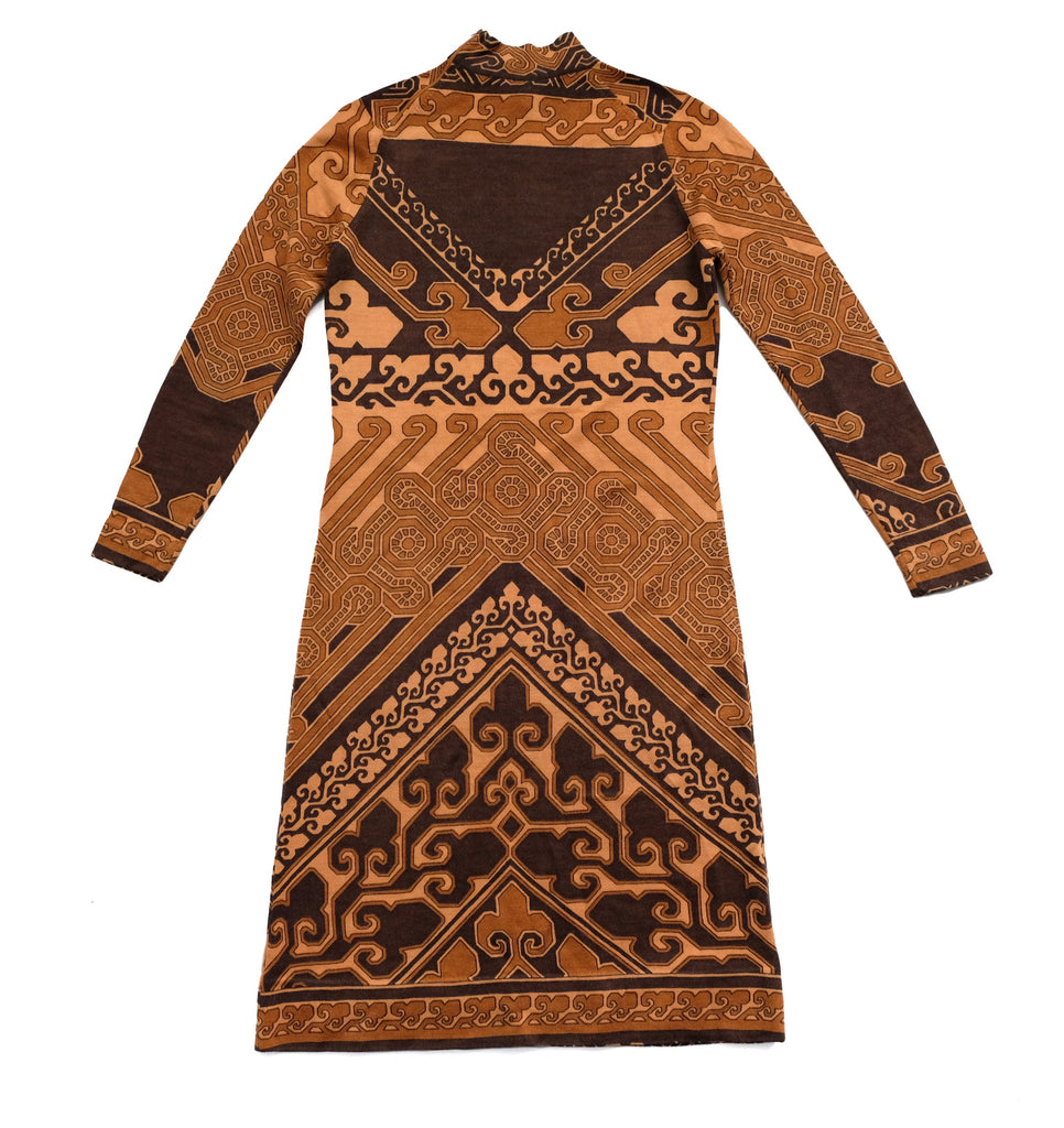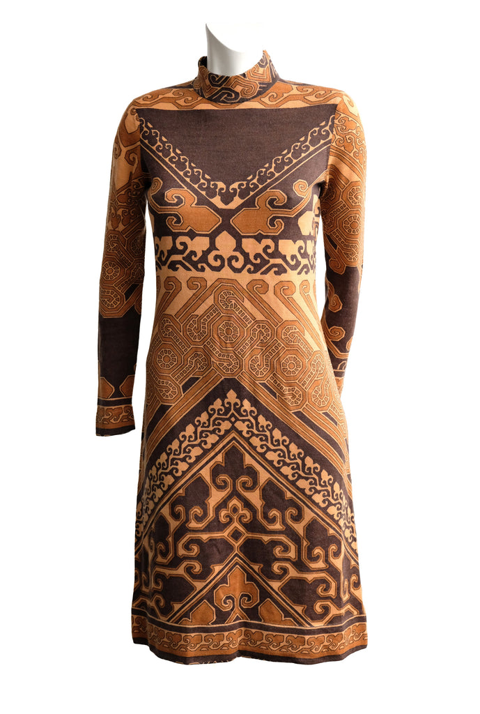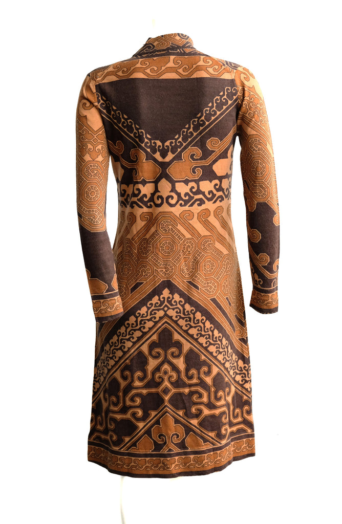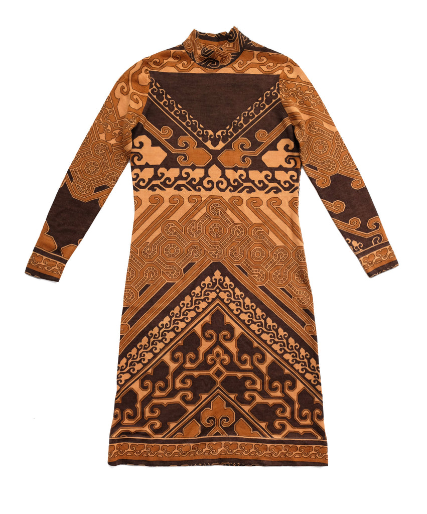 Beautiful geometric design in shades of tan and brown, with geometric borders at the neck, hem and sleeve. High neck with side shoulder zip, slim fitting to below knee length.