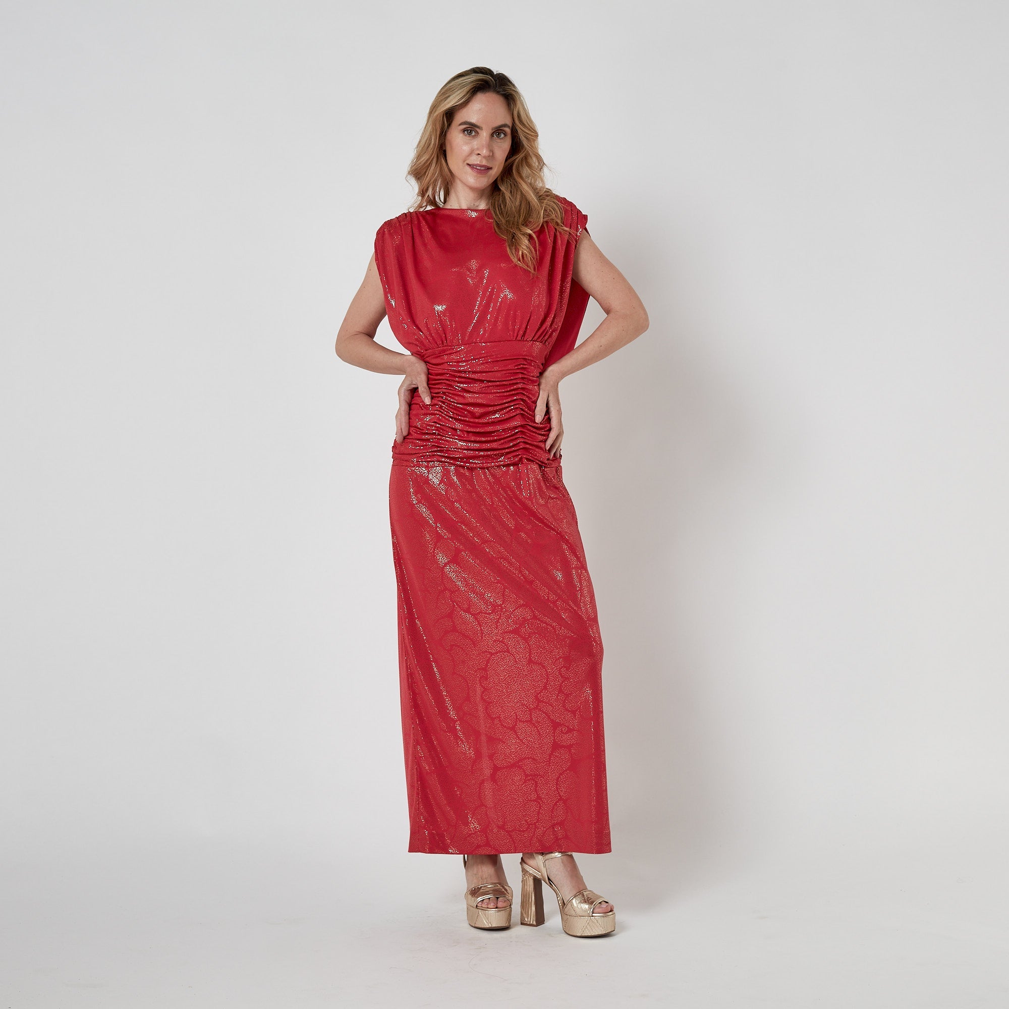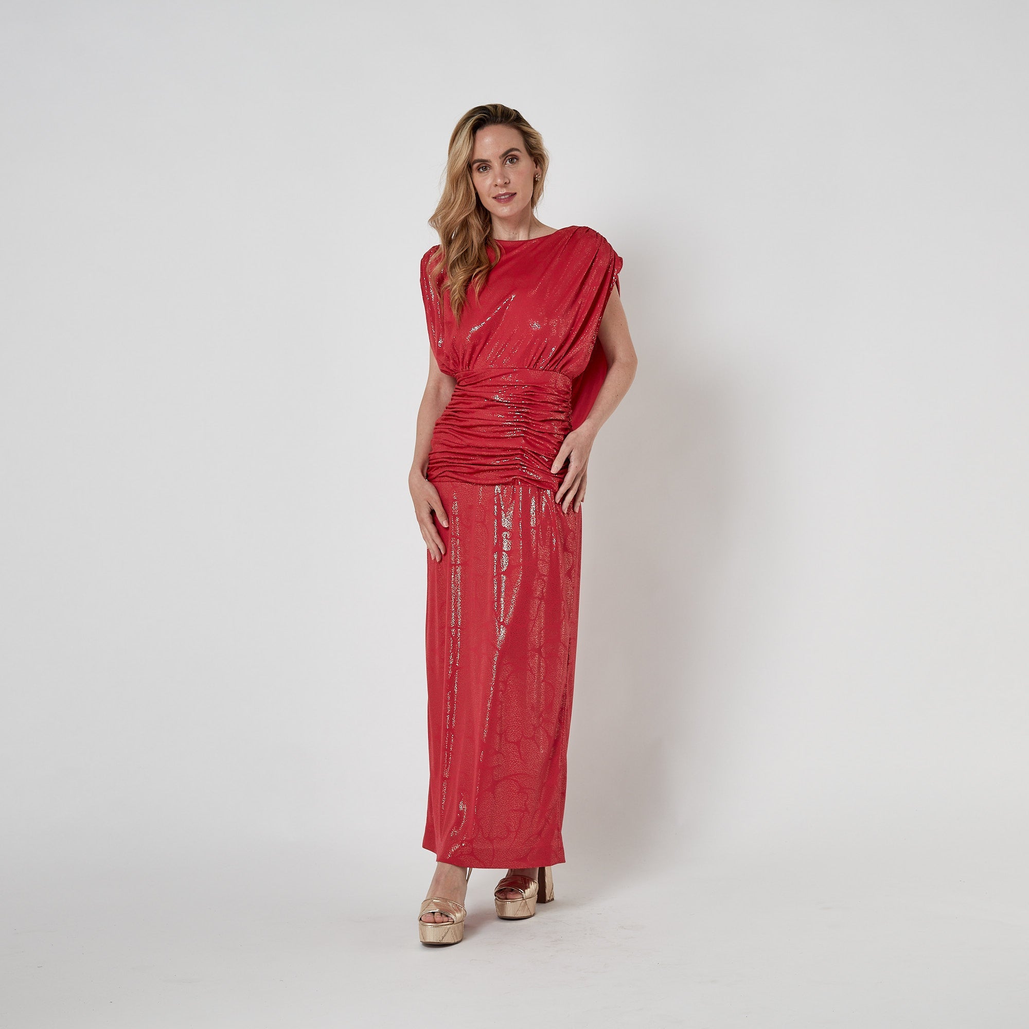 1980s John Charles Red Gold Lame Maxi Dress with Ruched Waist