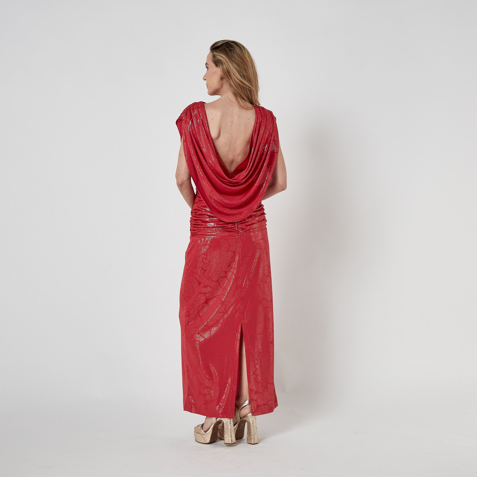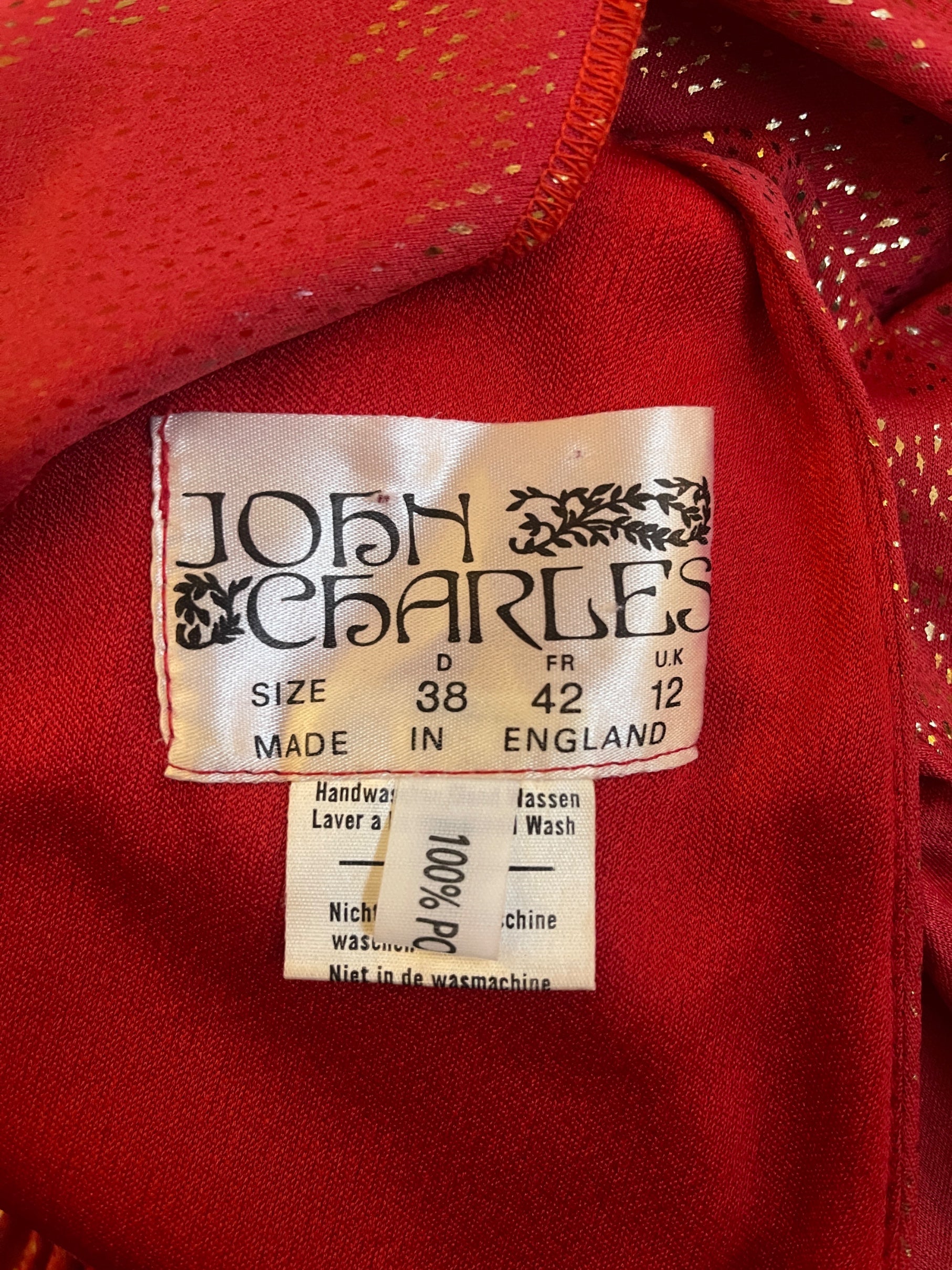 This is a great example of 1980s evening wear by John Charles. Founded by designer Cherry Price in 1958, the brand became known for its OTT party dresses and occasion wear throughout the 1970s and 1980s. True to form, this dress is tailored from high-octane red jersey detailed with flecks of gold lamé. The front is generously cut from swathes of fabric, with a slash-neck and sleeveless silhouette. The fabric at the front gives way to a sensuously low-cut back finished with a cape-like panel of fabric. The waistband is wide and ruched, cinching the flowing fabric. The skirt is cut straight and falls to the ankle, broken only by a slit at the back. The dress is lined in matte red jersey. It fastens at the centre back with a hidden tonal zip.