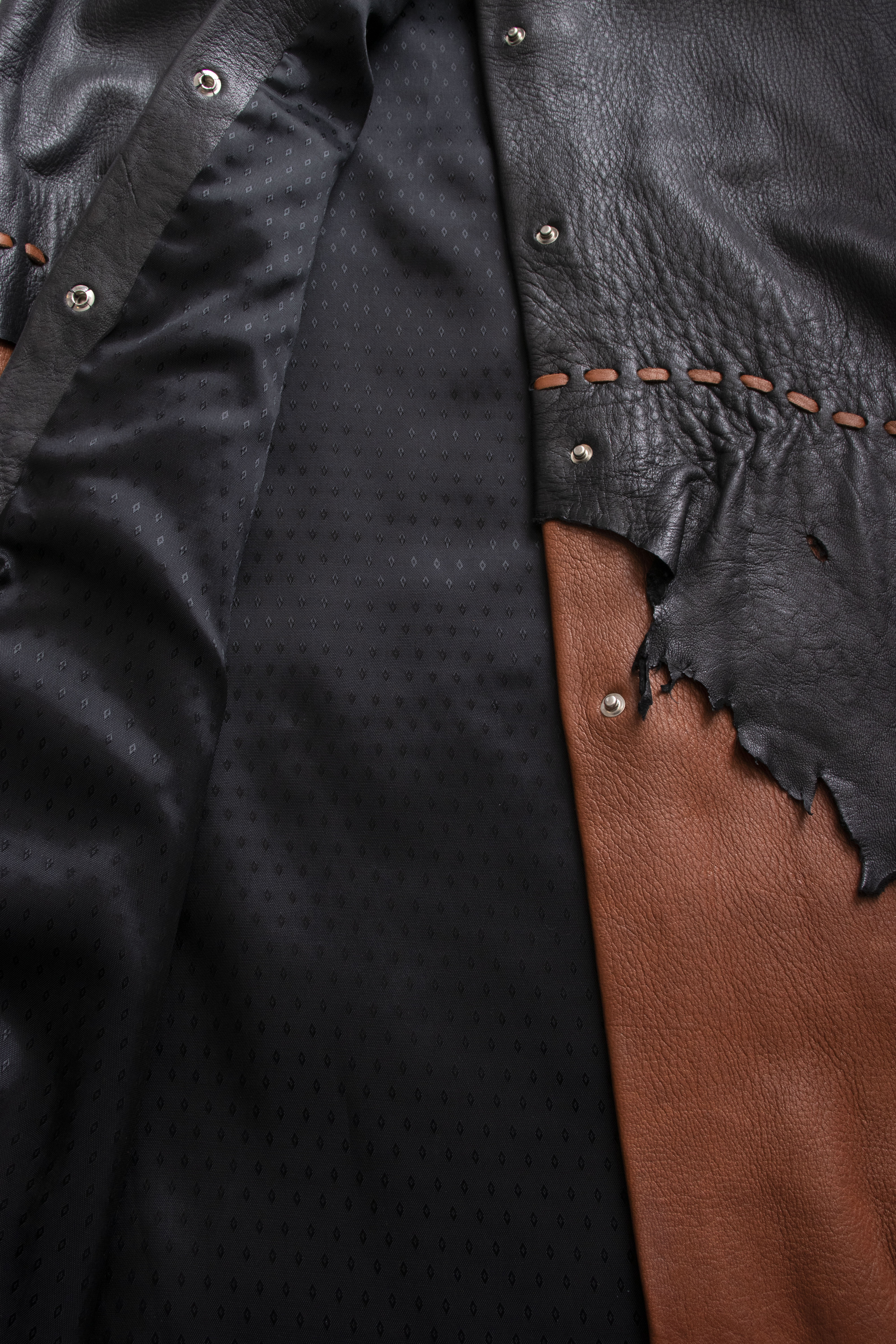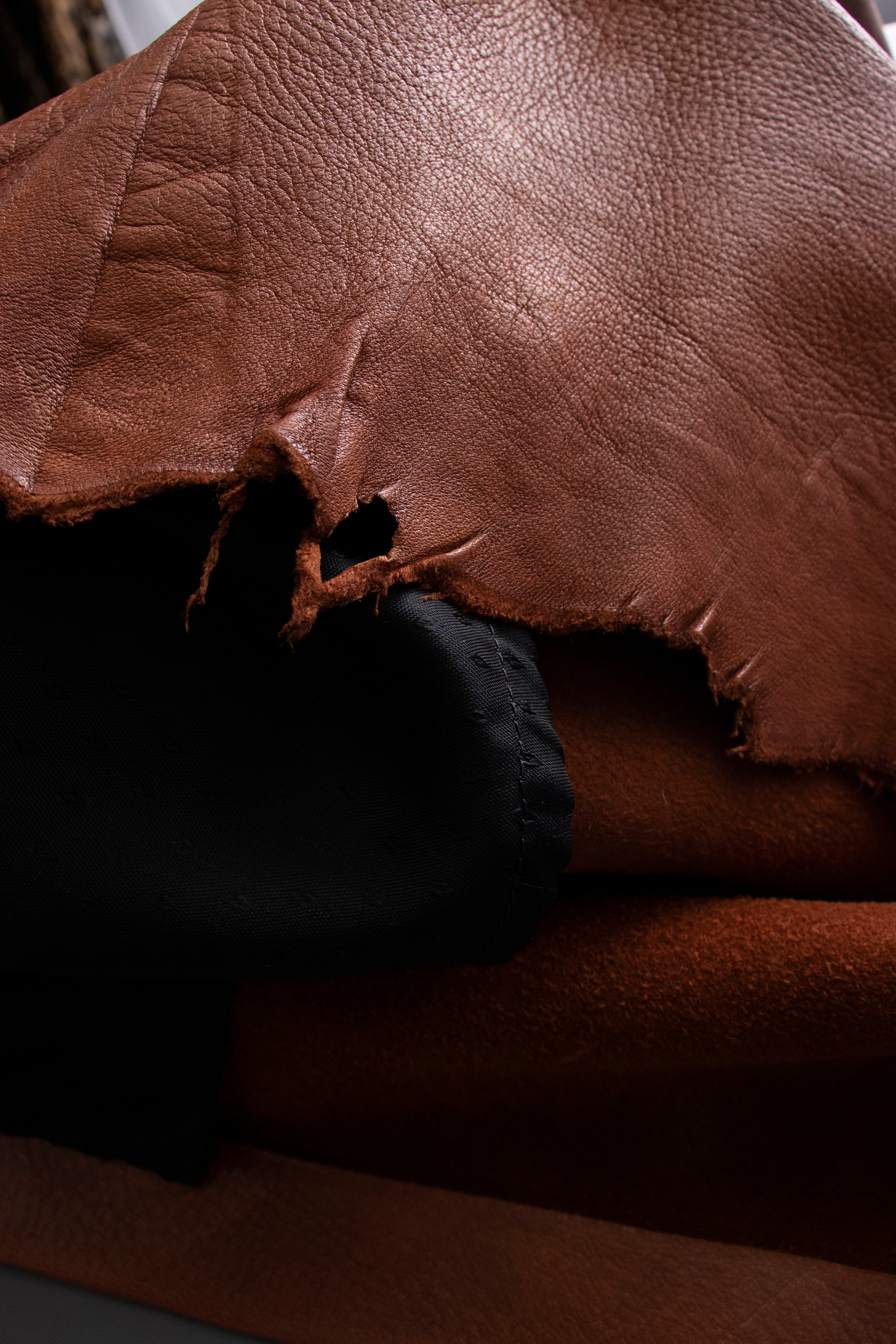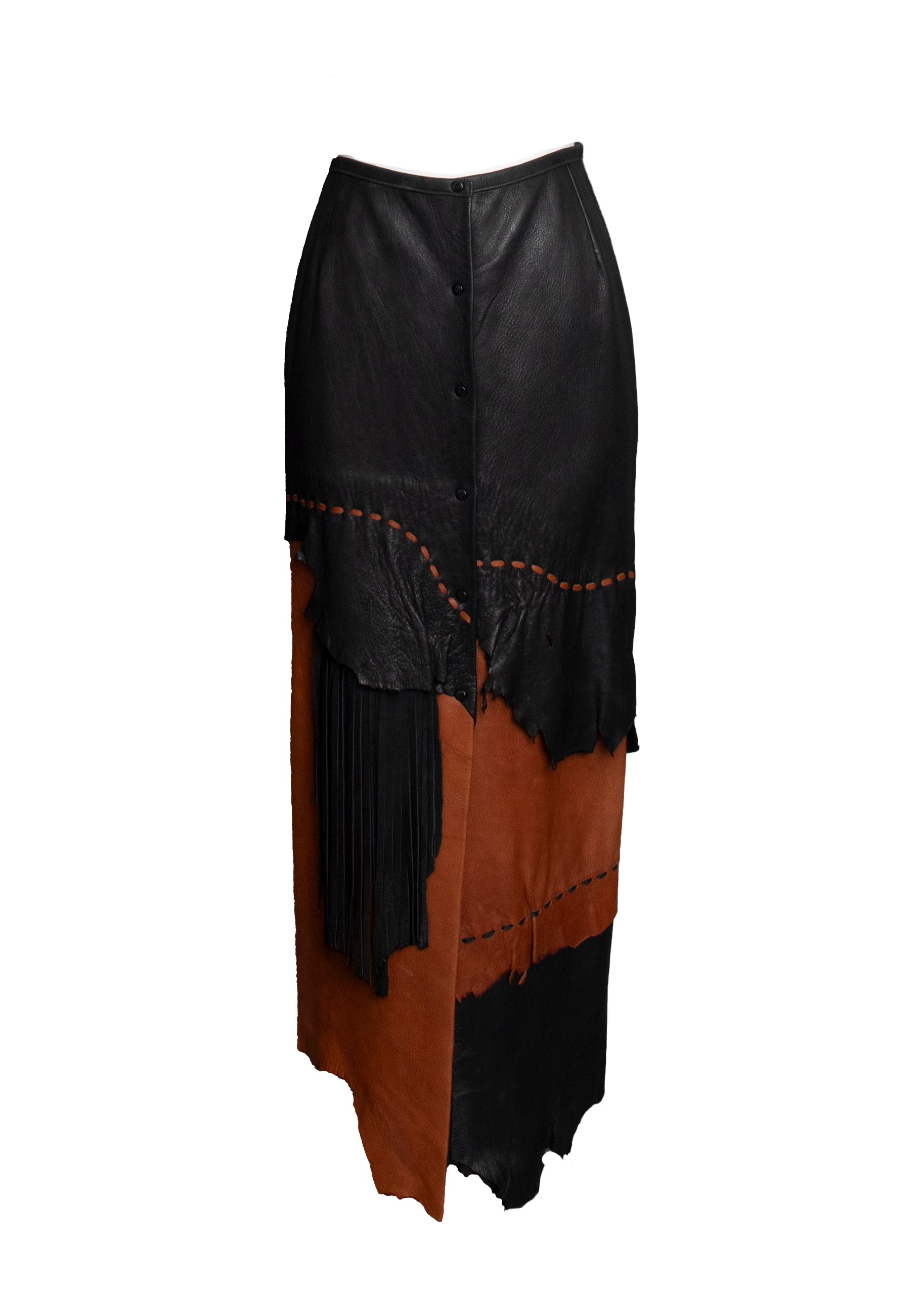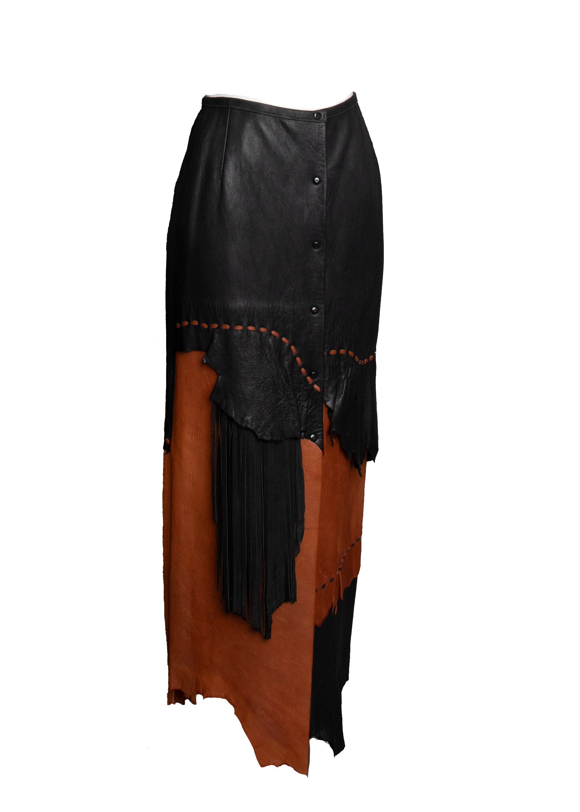 Everyone in the shop has fallen in love with this stunning custom leather skirt. Sourced from a designer's storage, this unworn piece was once part of a Los Angeles boutique owner's collection. The luxurious material is unbelievably soft and she is a perfect fit. Easy snap closures down the front allow for versatile styling, and the asymmetrical design and raw edges add a touch of rustic charm. There is no damage to the skirt, but we are offering up close shots of natural imperfections.