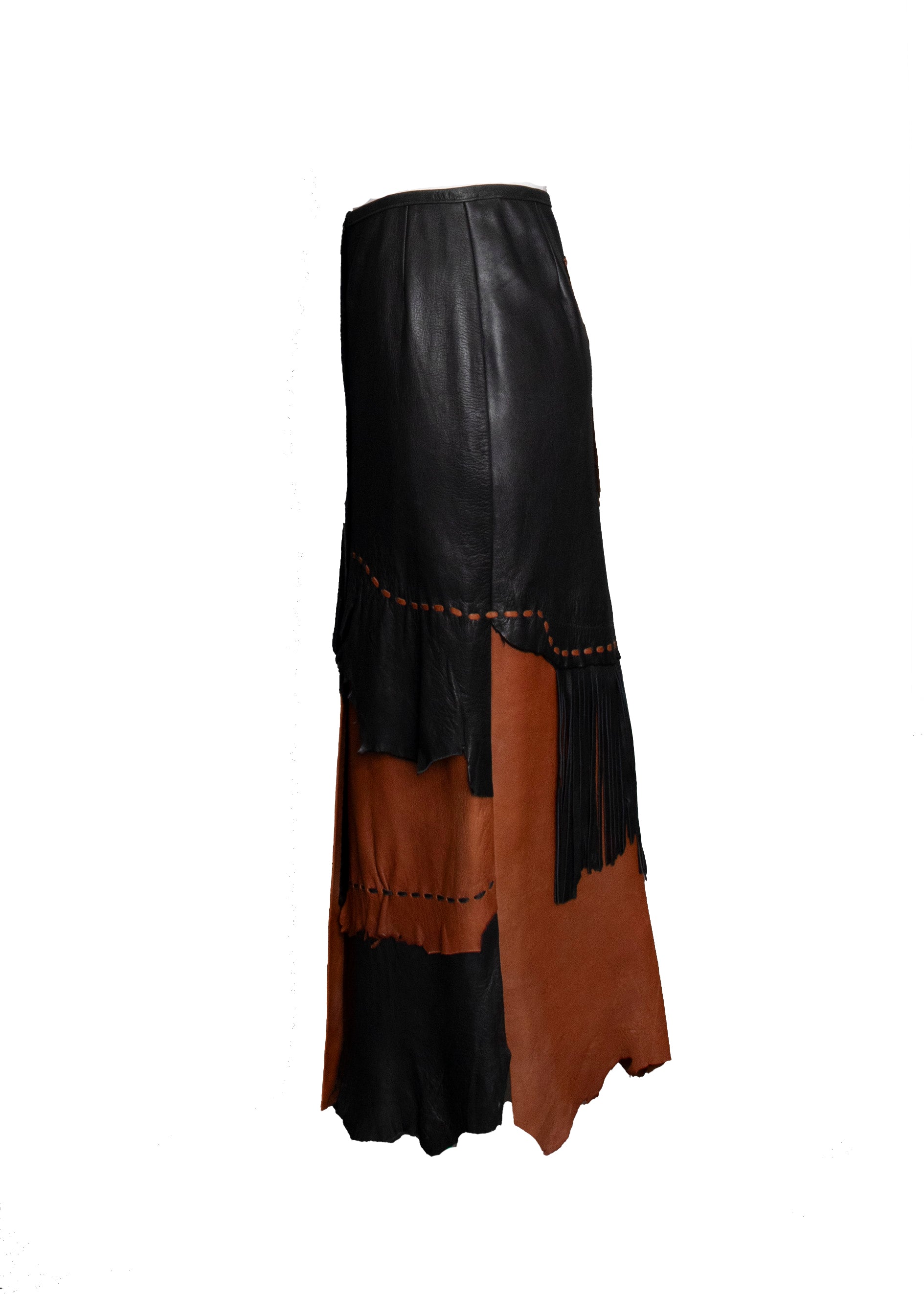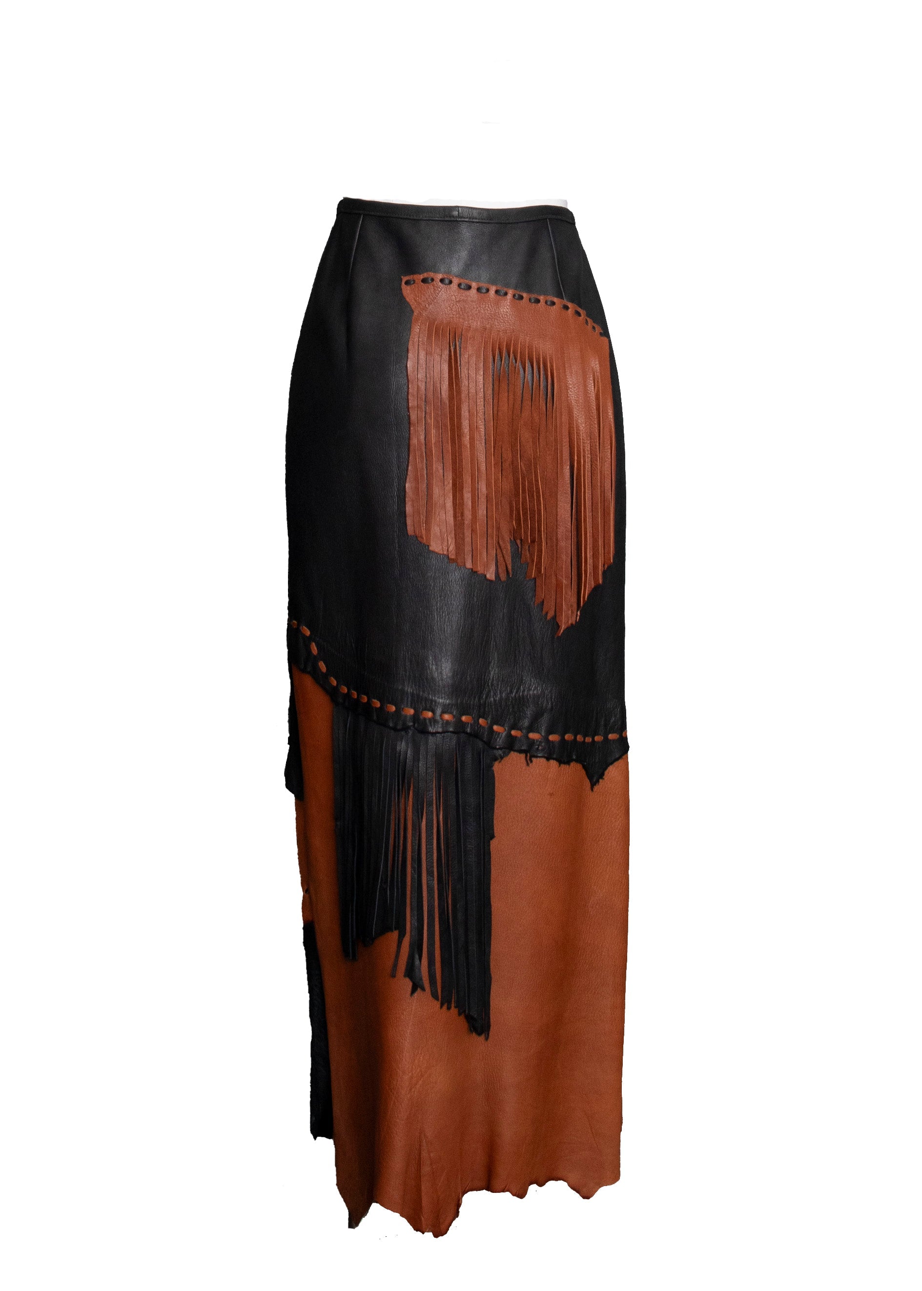 1990's Deerskin Leather Skirt Patchwork Style with Fringe.