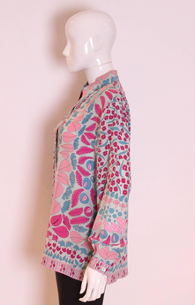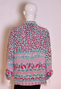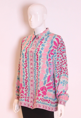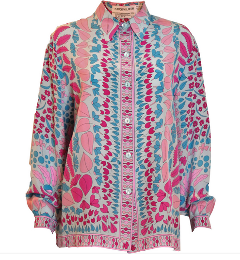 A great silk shirt by Averardo Bessi ( he worked with Pucci). The shirt is made of silk, and has a light blue background, with a pattern in pink, purple, blue and black with a border along the hem. The shirt has single button cuffs, and a 6 button opening at the front,and is meant to be worn loose.