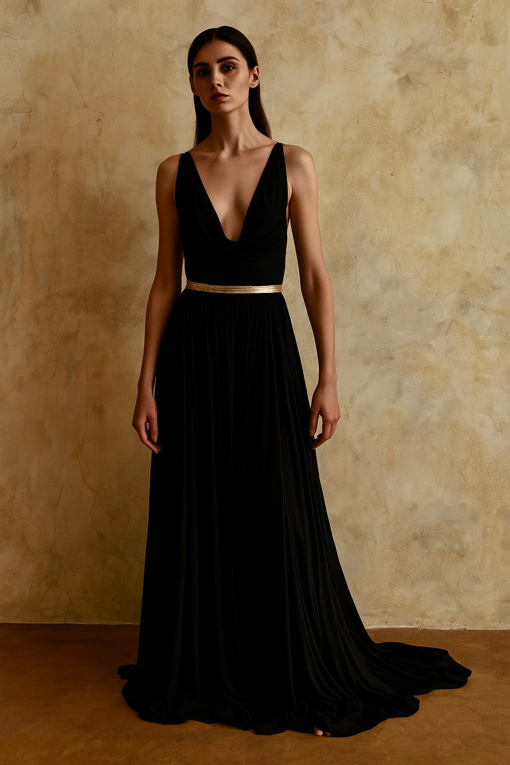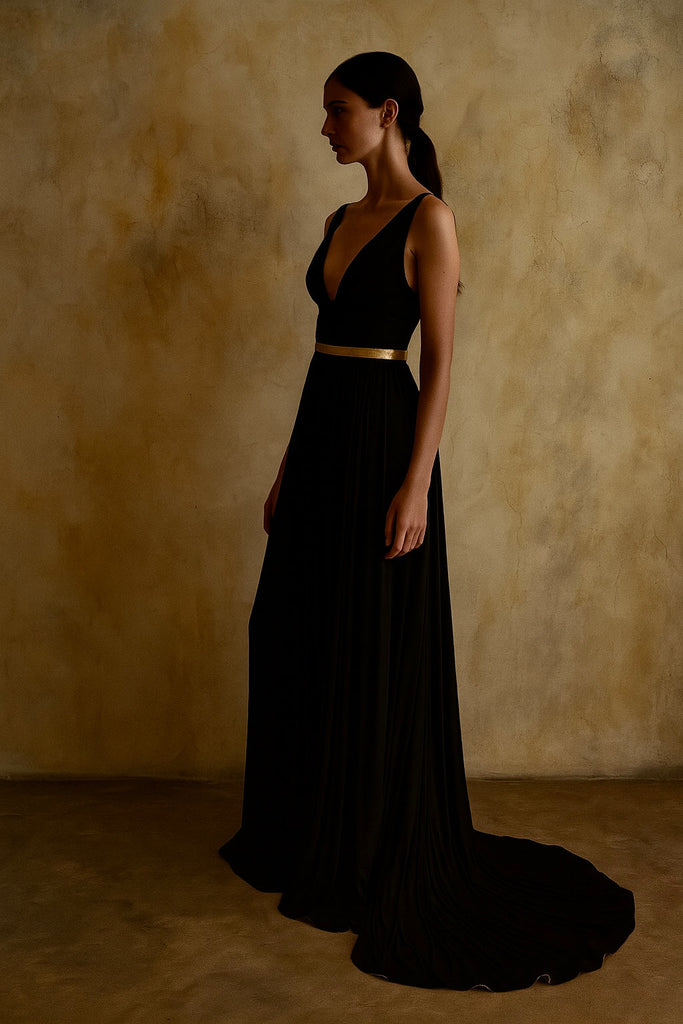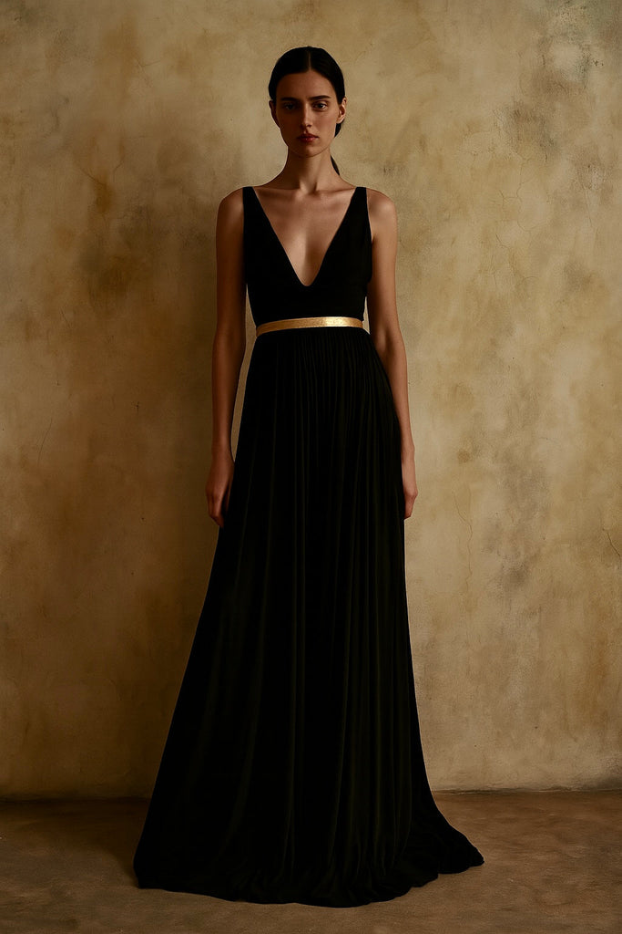 This vintage Alaia maxi dress from 2010 showcases expert craftsmanship with its black jersey fabric and striking gold lame Holt neck strap and waistband. The plunging cowl neck and crossover straps at the back create a sophisticated silhouette, while the flowing full skirt with an elasticated waist ensures comfort and movement. A concealed zip completes the design, making this piece a timeless statement of elegance and style.