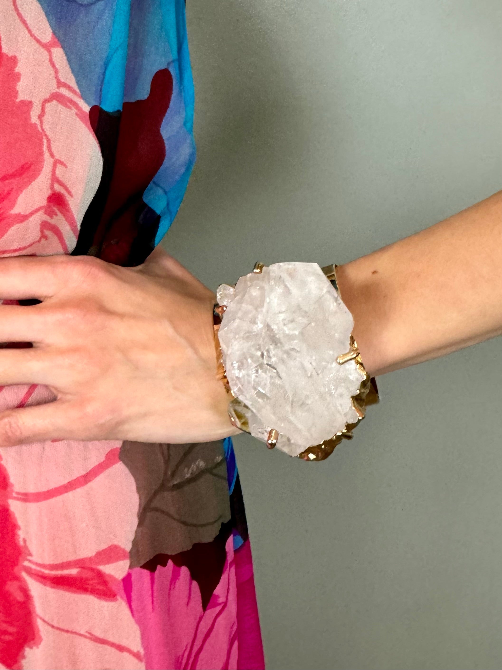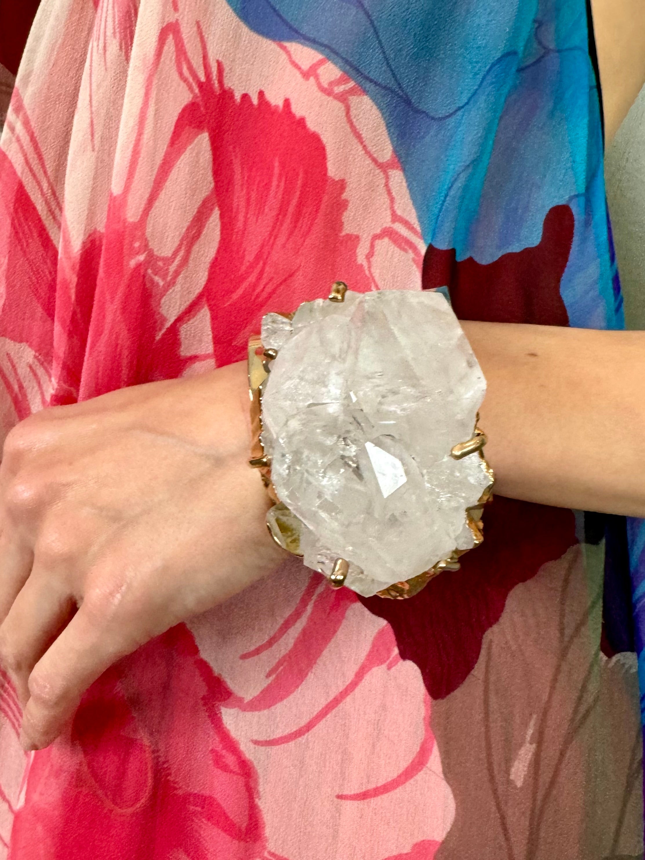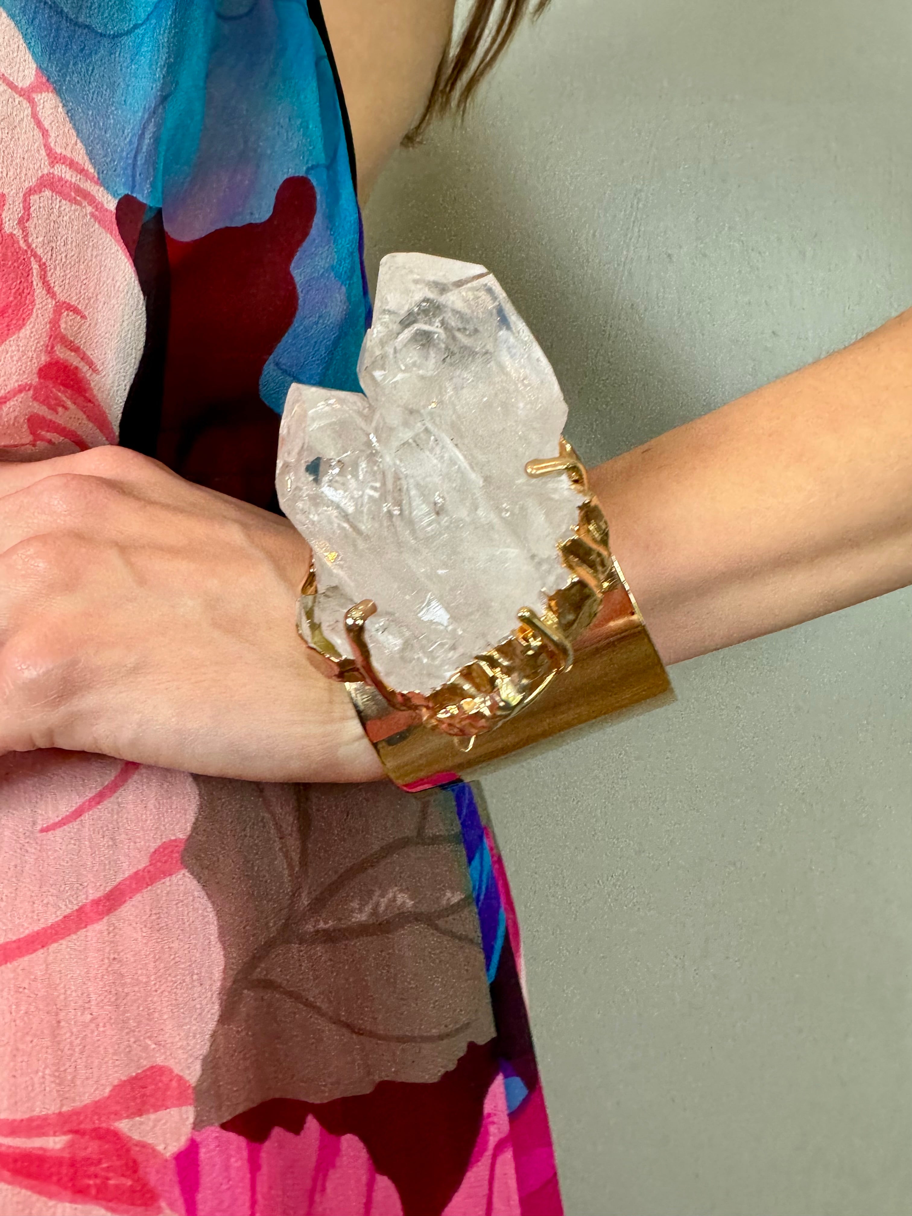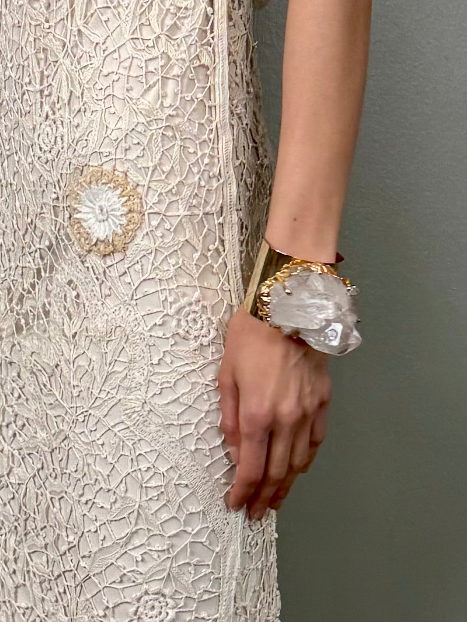 Experience the glamour of the 70s with our Blythe cuff. This amazing modernist piece features a rough cut crystal set on a stunning gold wide cuff. Add a touch of vintage chic to your outfit and make a statement with this unique and luxurious cuff.