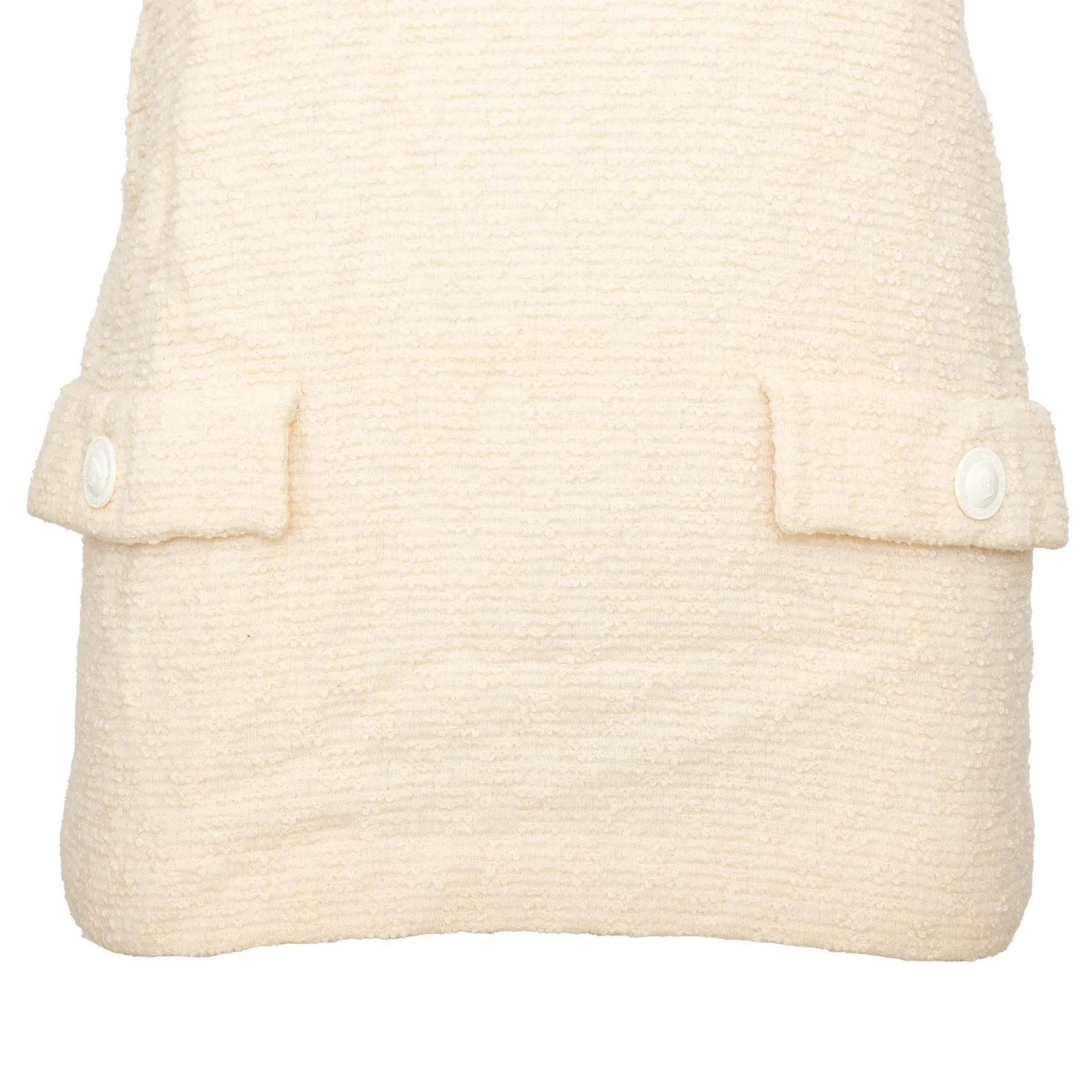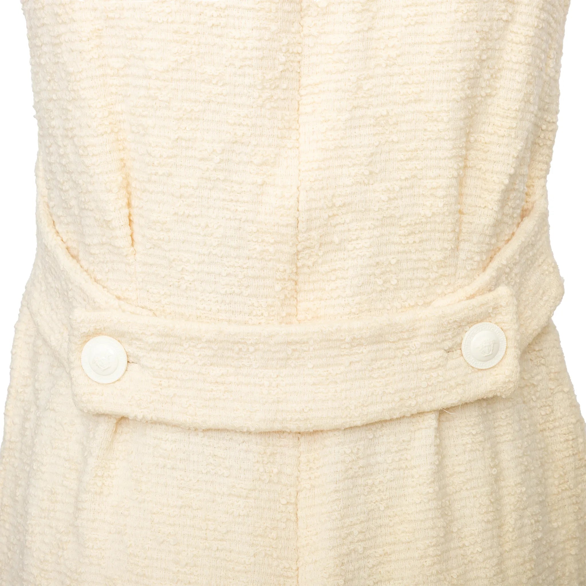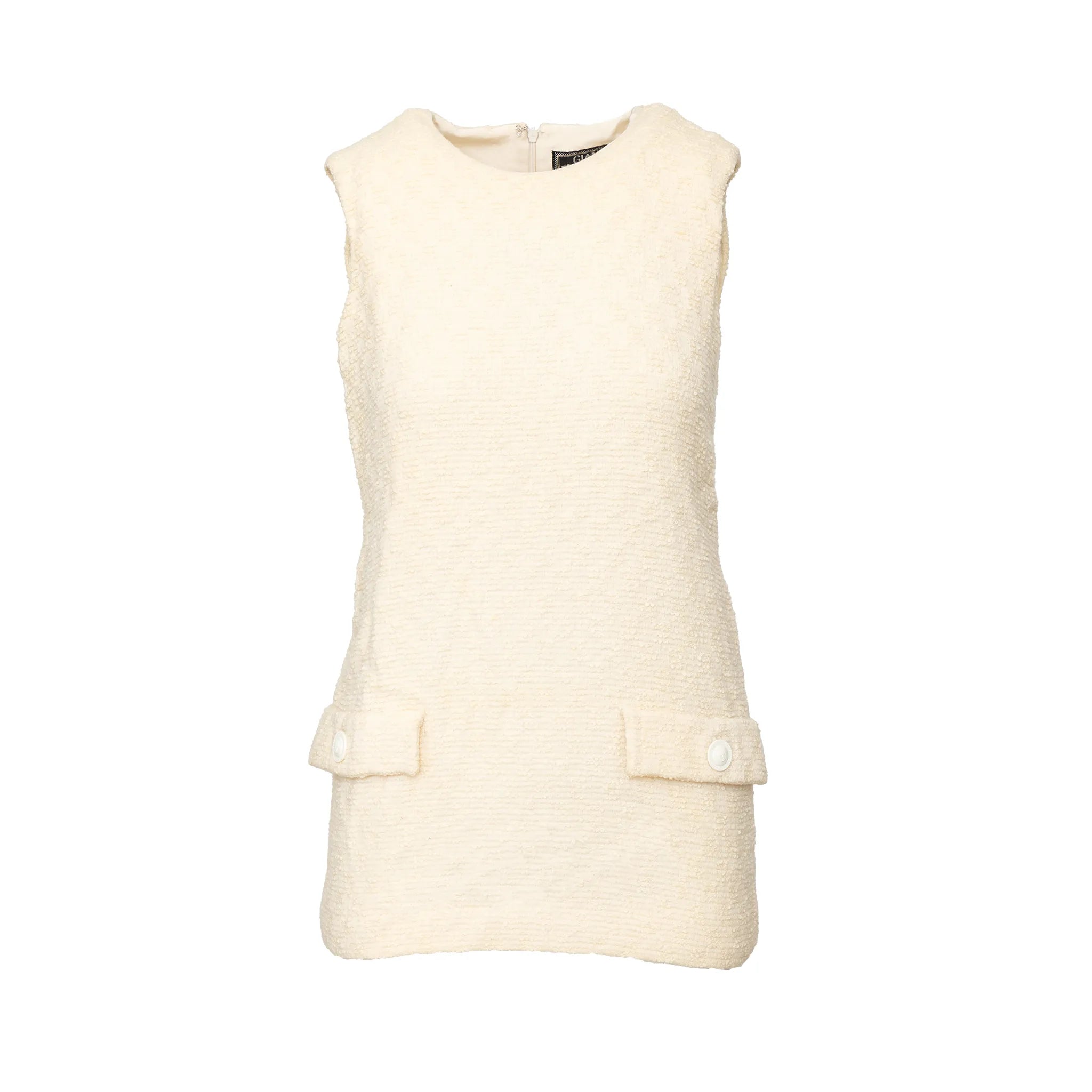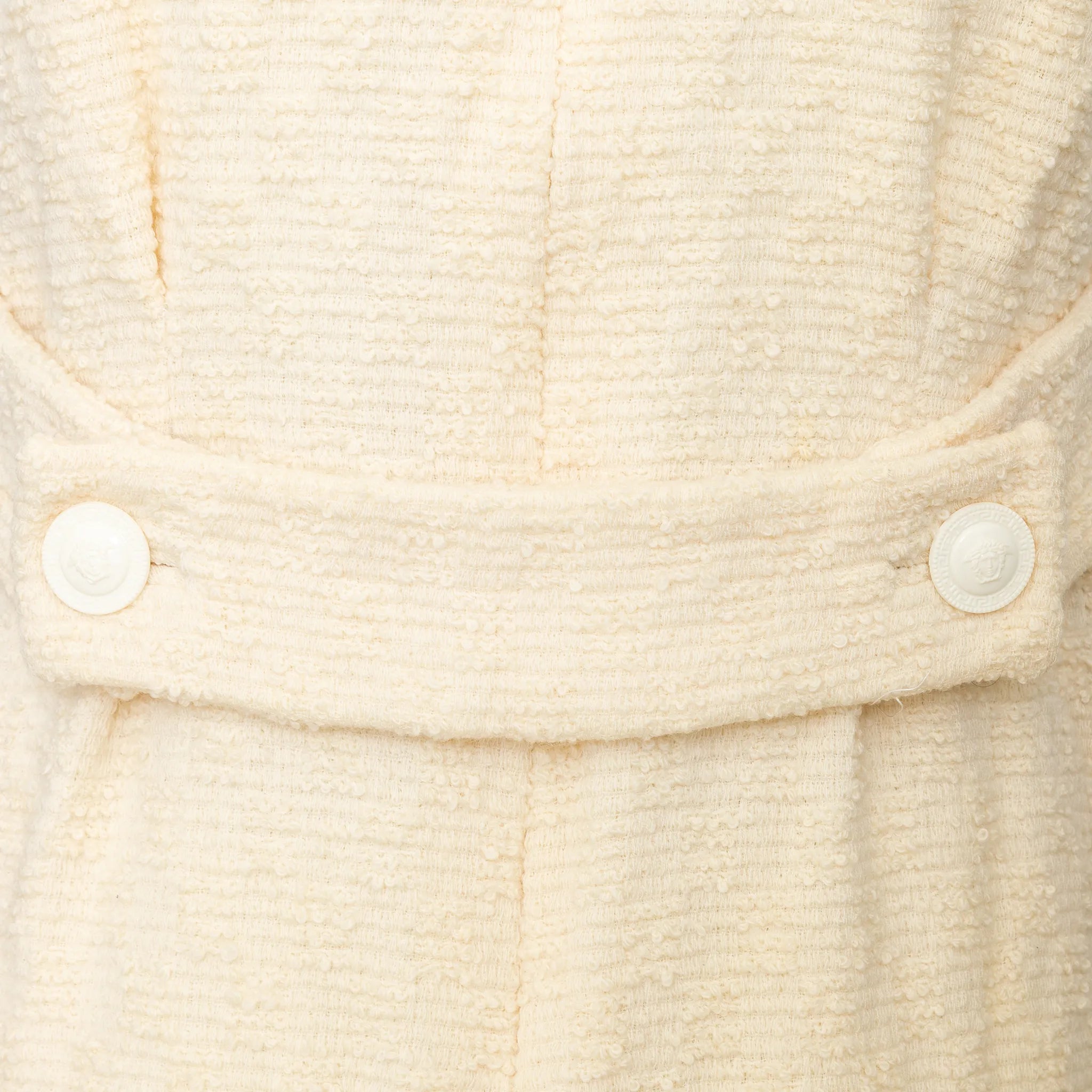 Cream wool-silk blend mini dress from Versace Fall 1995 collection. Features a round collar, Medusa flap pockets, back belt accent, and sleek sleeveless fit.