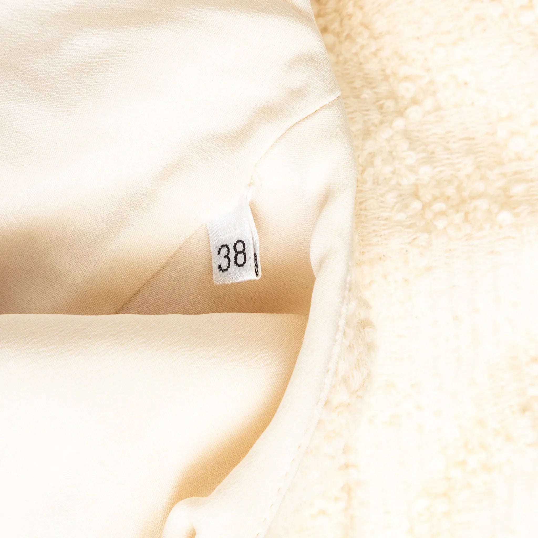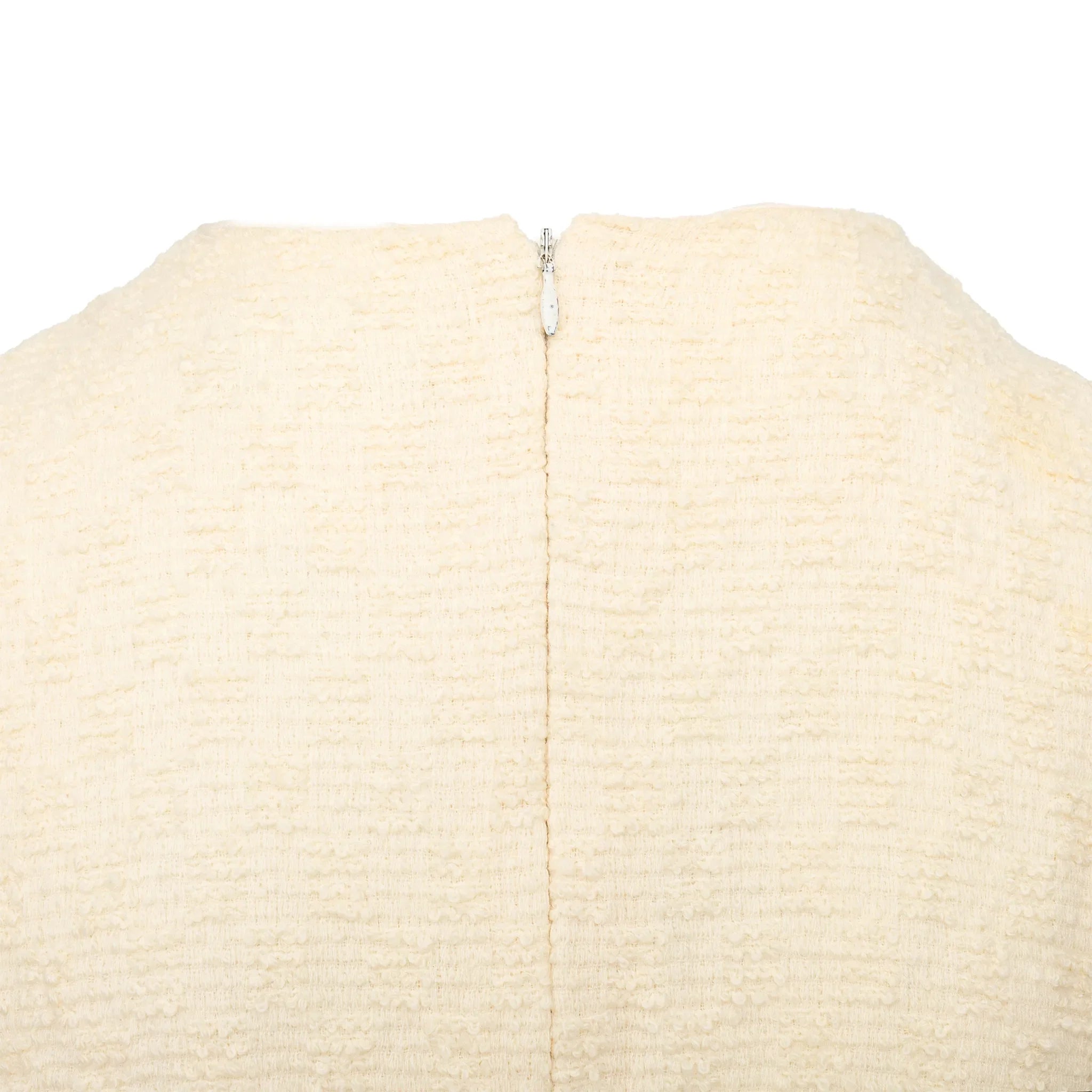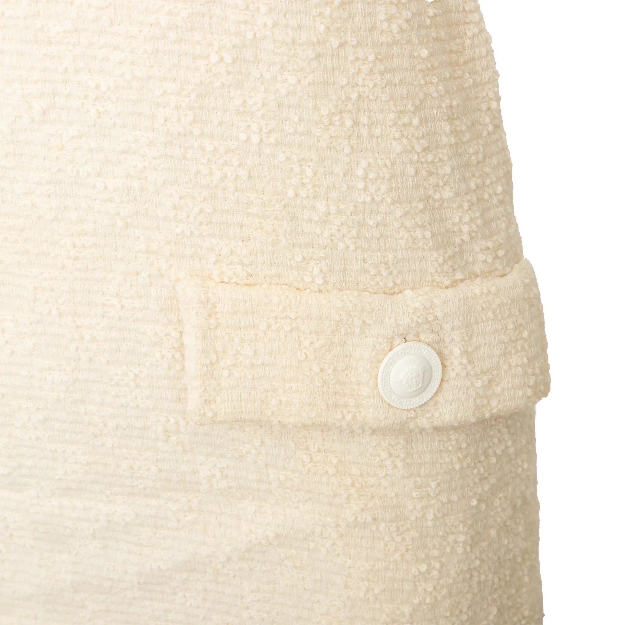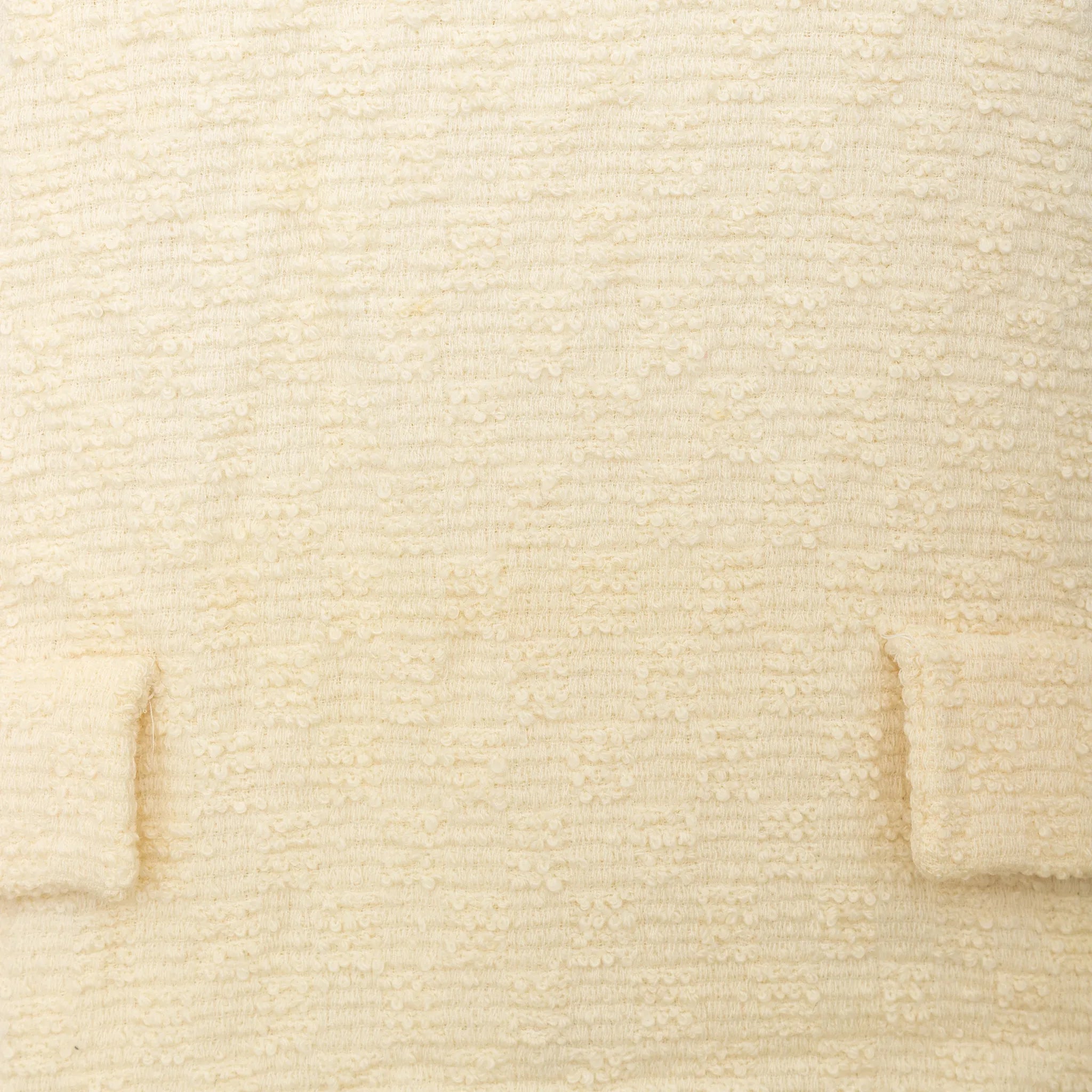 Cream wool-silk blend mini dress from Versace Fall 1995 collection. Features a round collar, Medusa flap pockets, back belt accent, and sleek sleeveless fit.