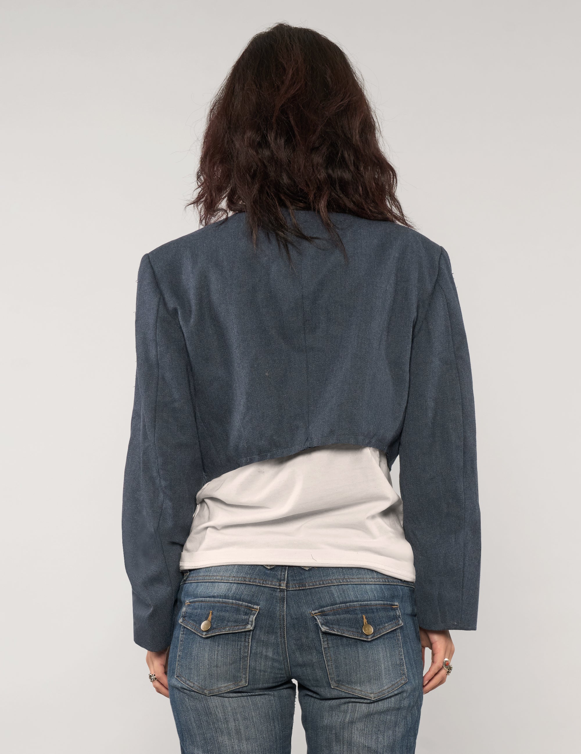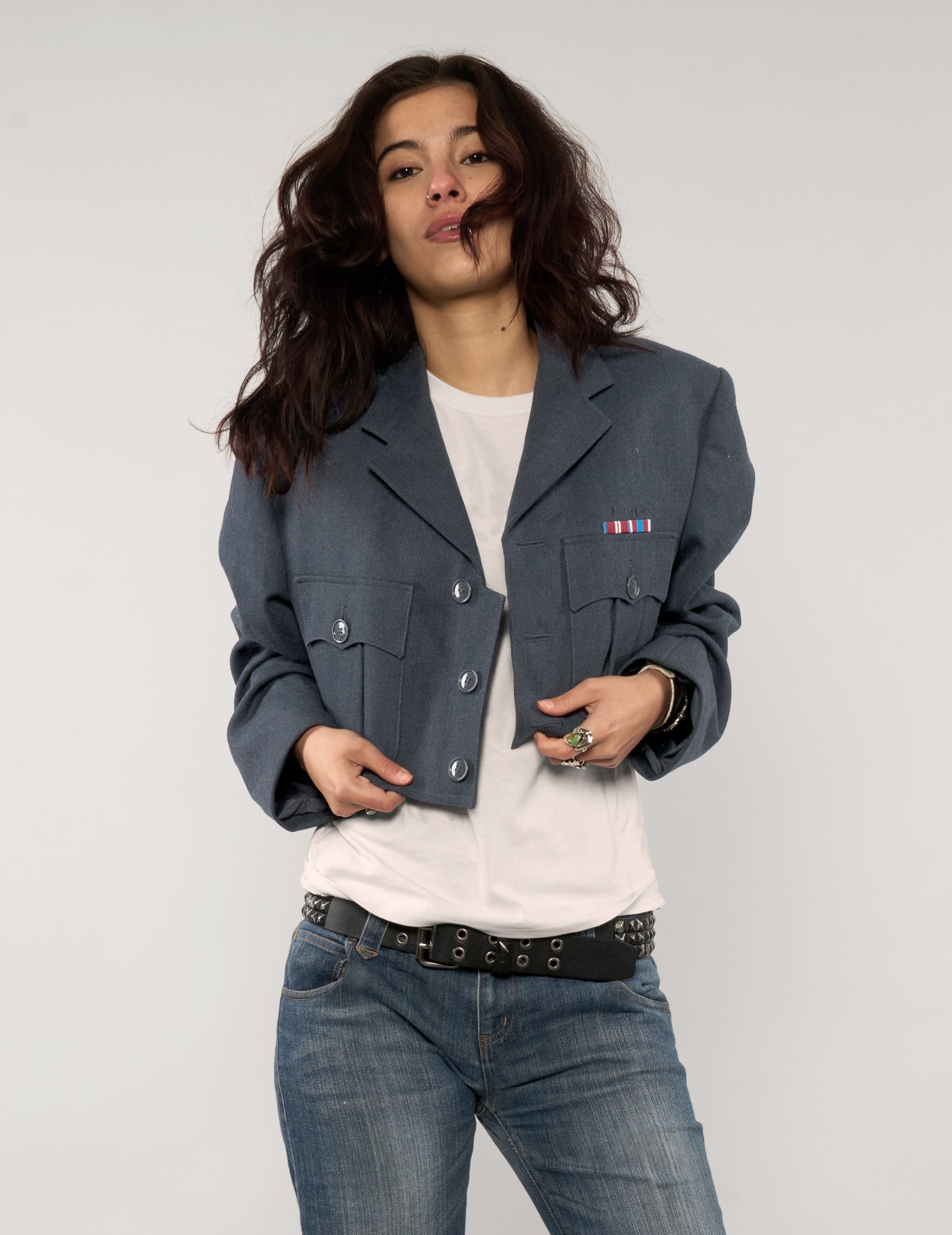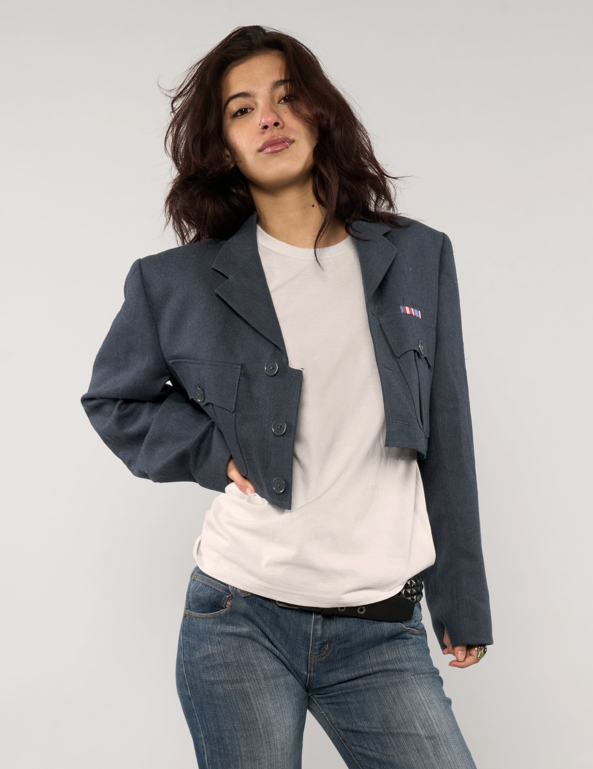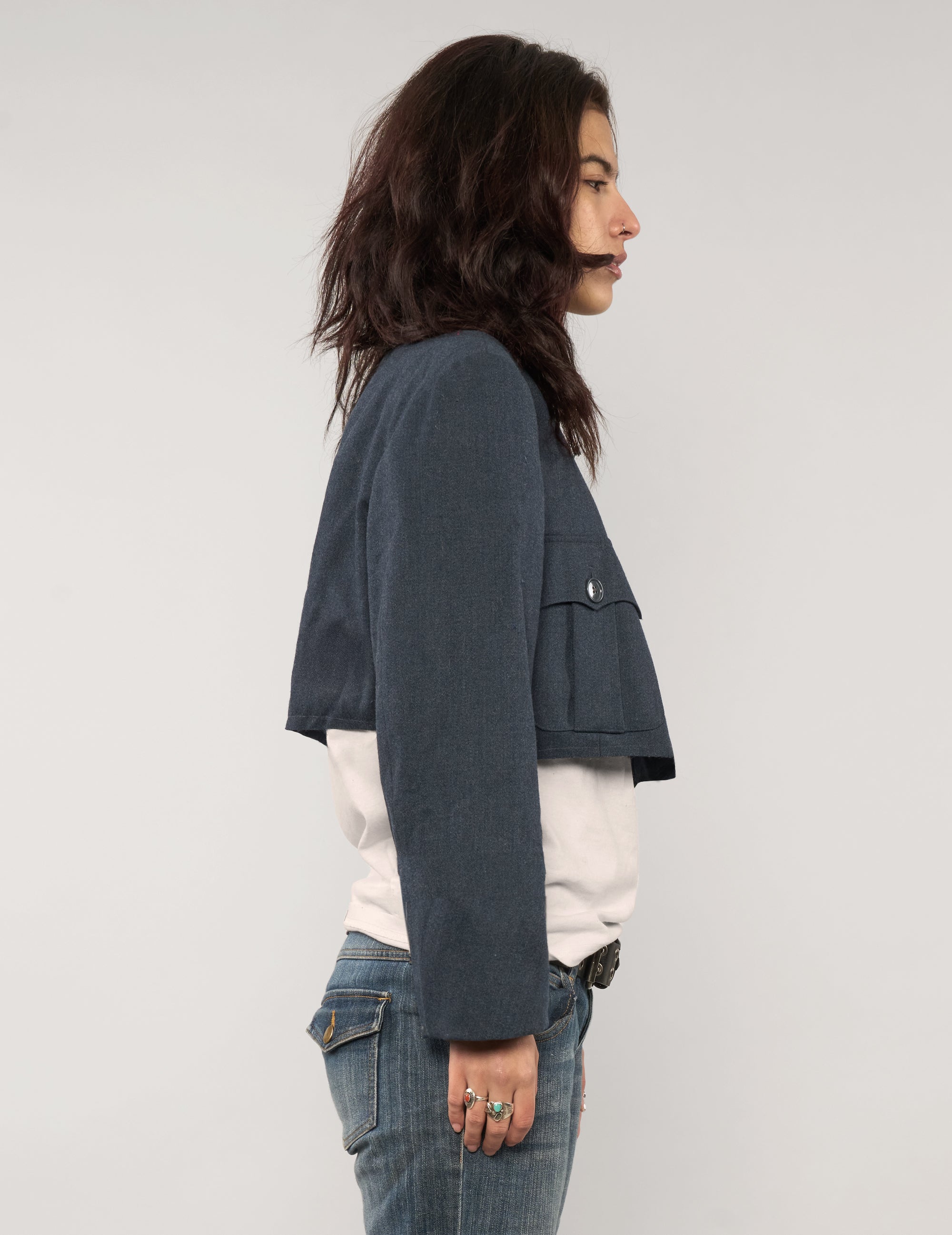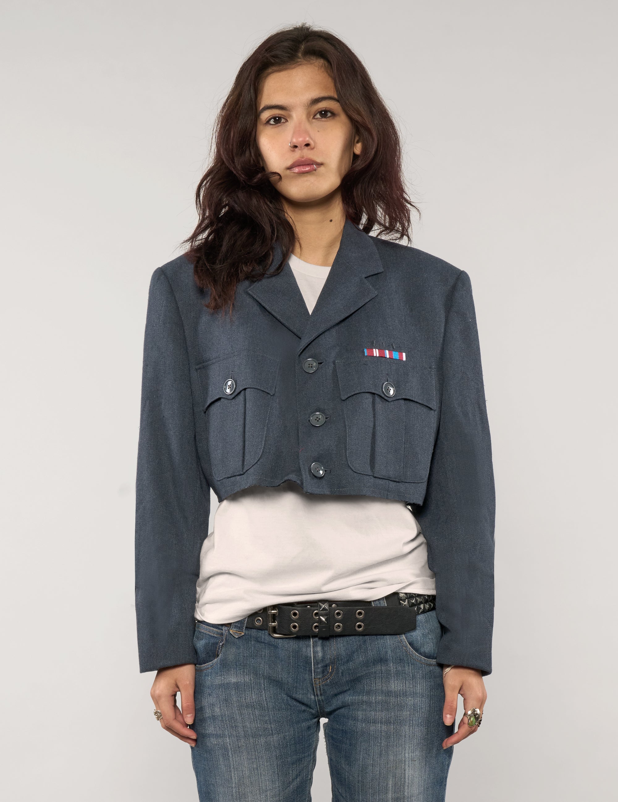 Super cool, reworked cropped jacket, repurposed from a vintage military uniform. Crafted from 100% wool, this piece features a raw-edge finish at the hem for a distressed look. Designed with functional breast pockets and a structured silhouette that references its uniform origins while remaining easy to wear.