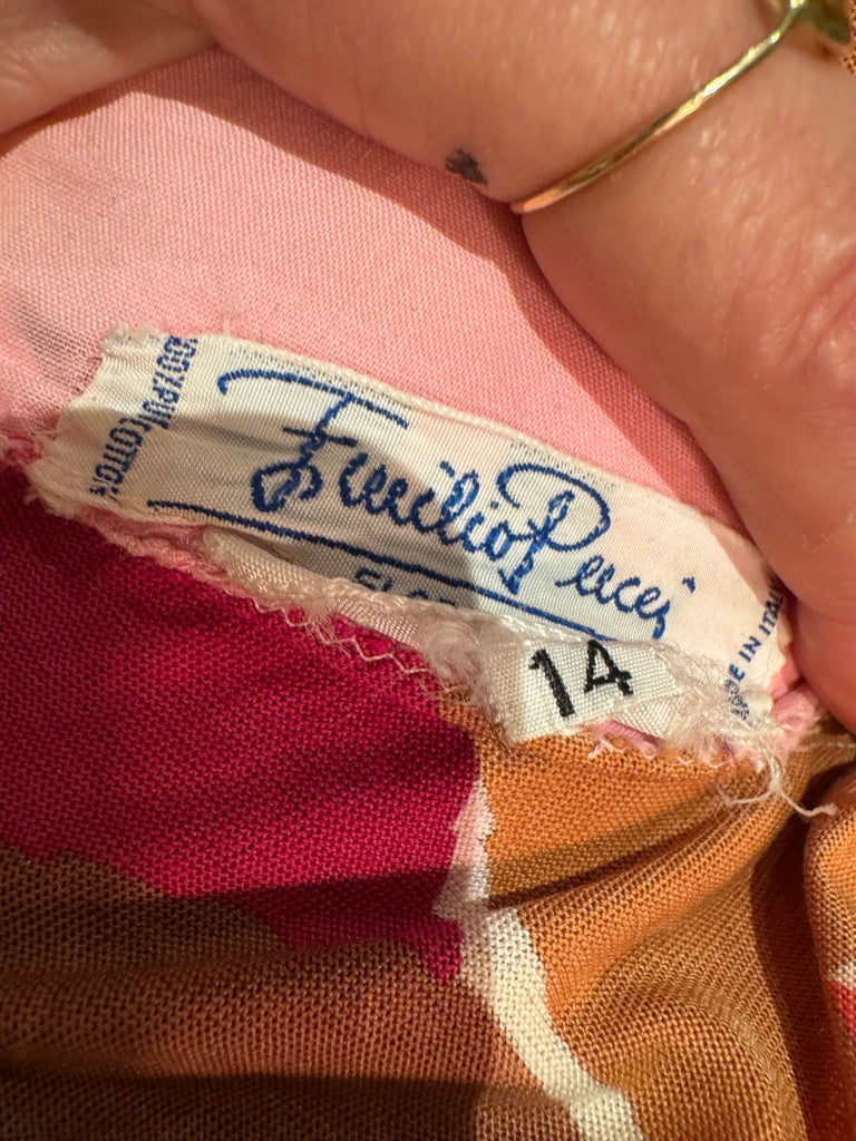 Indulge in a piece of fashion history with this 1960s Emilio Pucci cotton dress. The rare and collectible design features a drop waist and A-line skirt, creating a flattering silhouette. With a front V-neck, long sleeves, and concealed hooks for a perfect fit, this dress is both stylish and functional. A timeless classic in excellent condition.