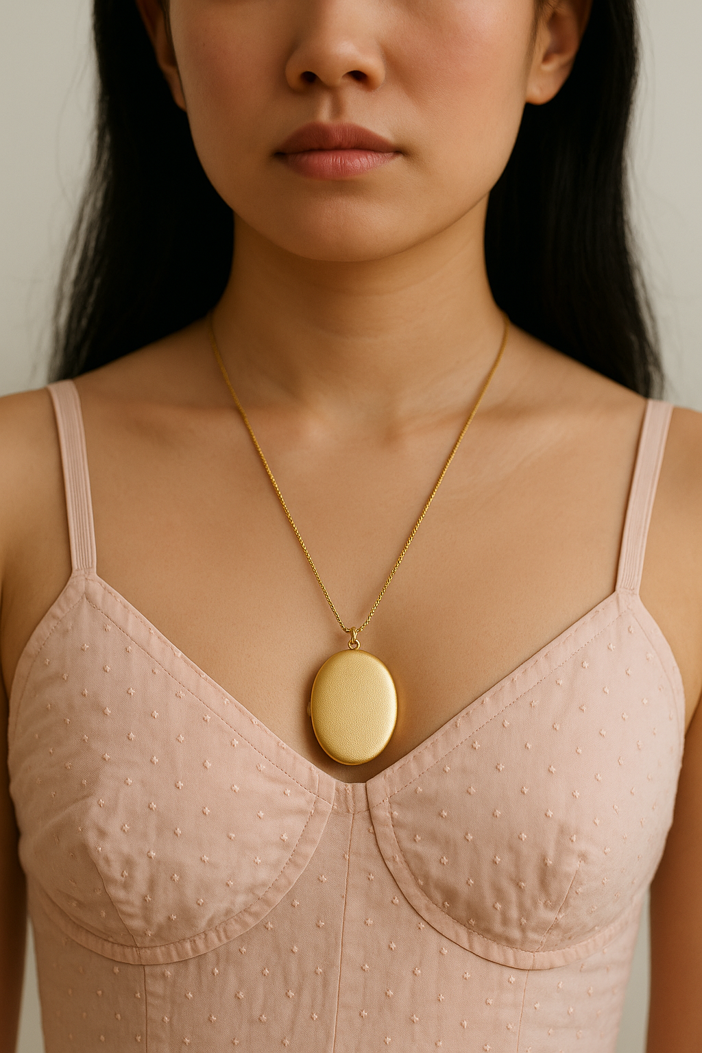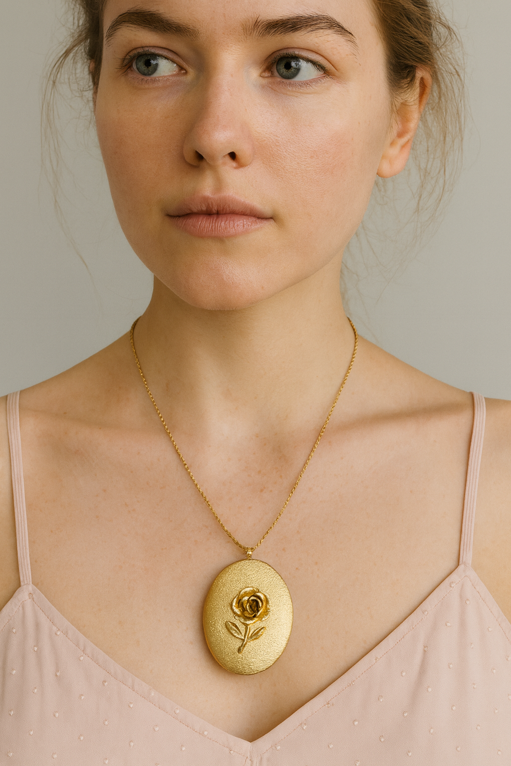 Flora, 40s gold brushed large locket pendant with 14 carat gold chain