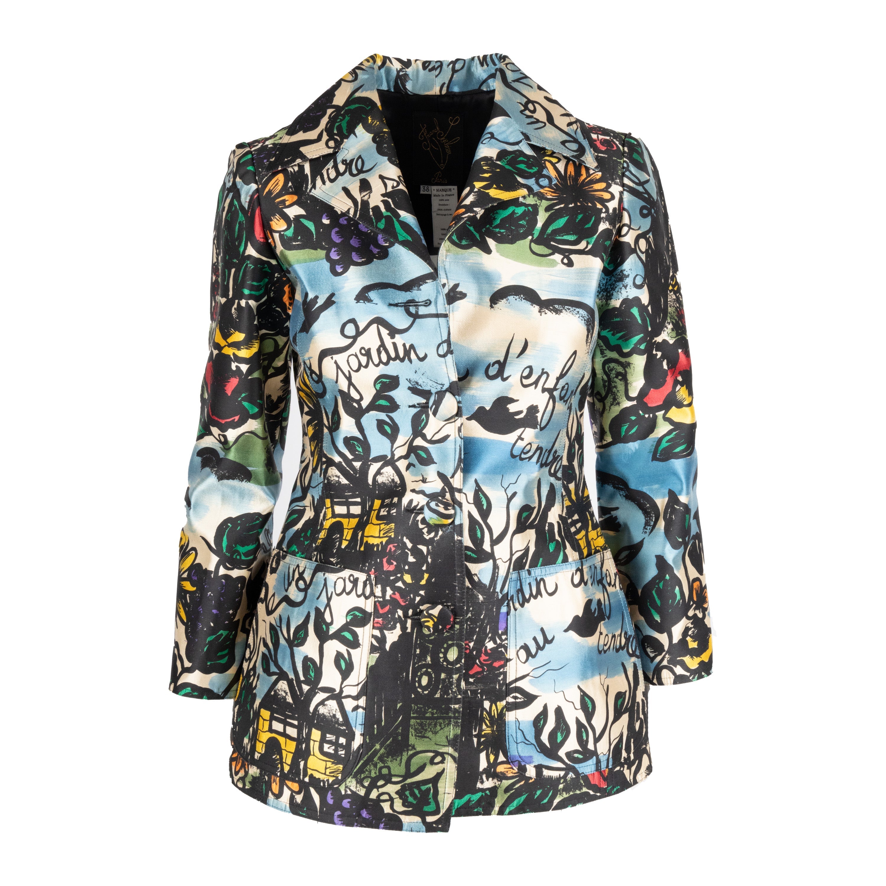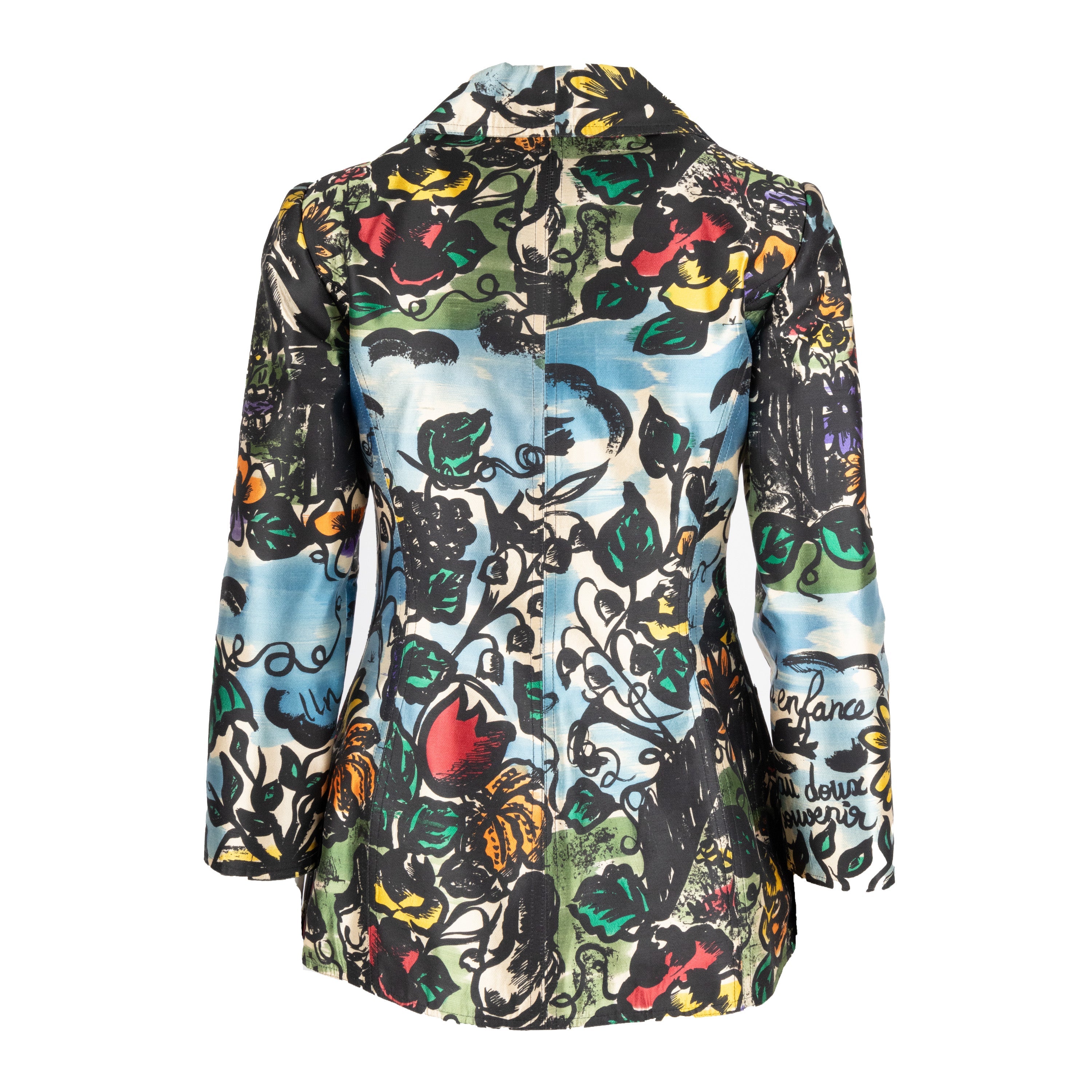 This Franck Sorbier long silk jacket features a hand-painted print of floral motif in vibrant blue and green tones. Its notched collar and single-breasted design add a touch of sophistication, while the two patch pockets offer convenience. Make a statement with this artful piece.