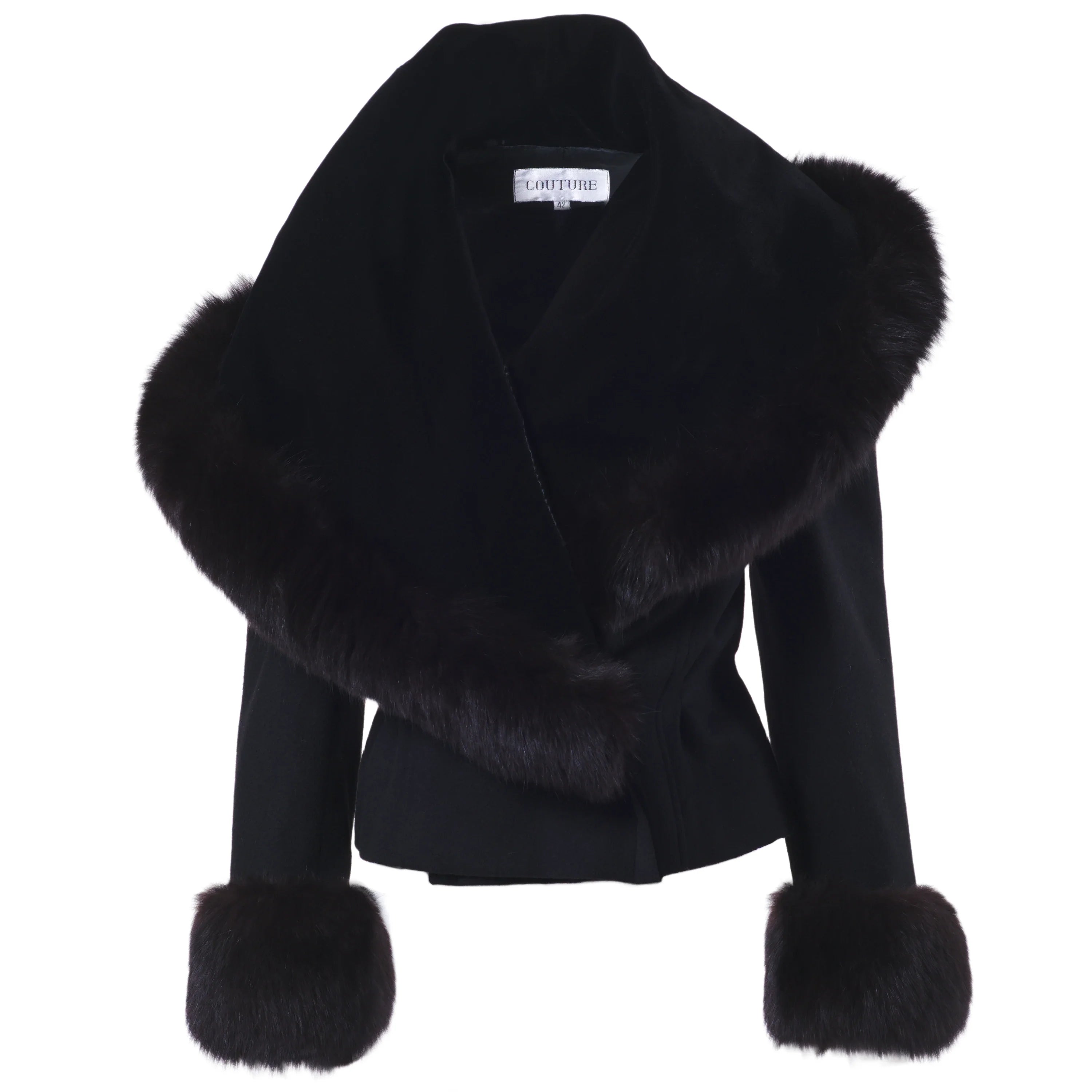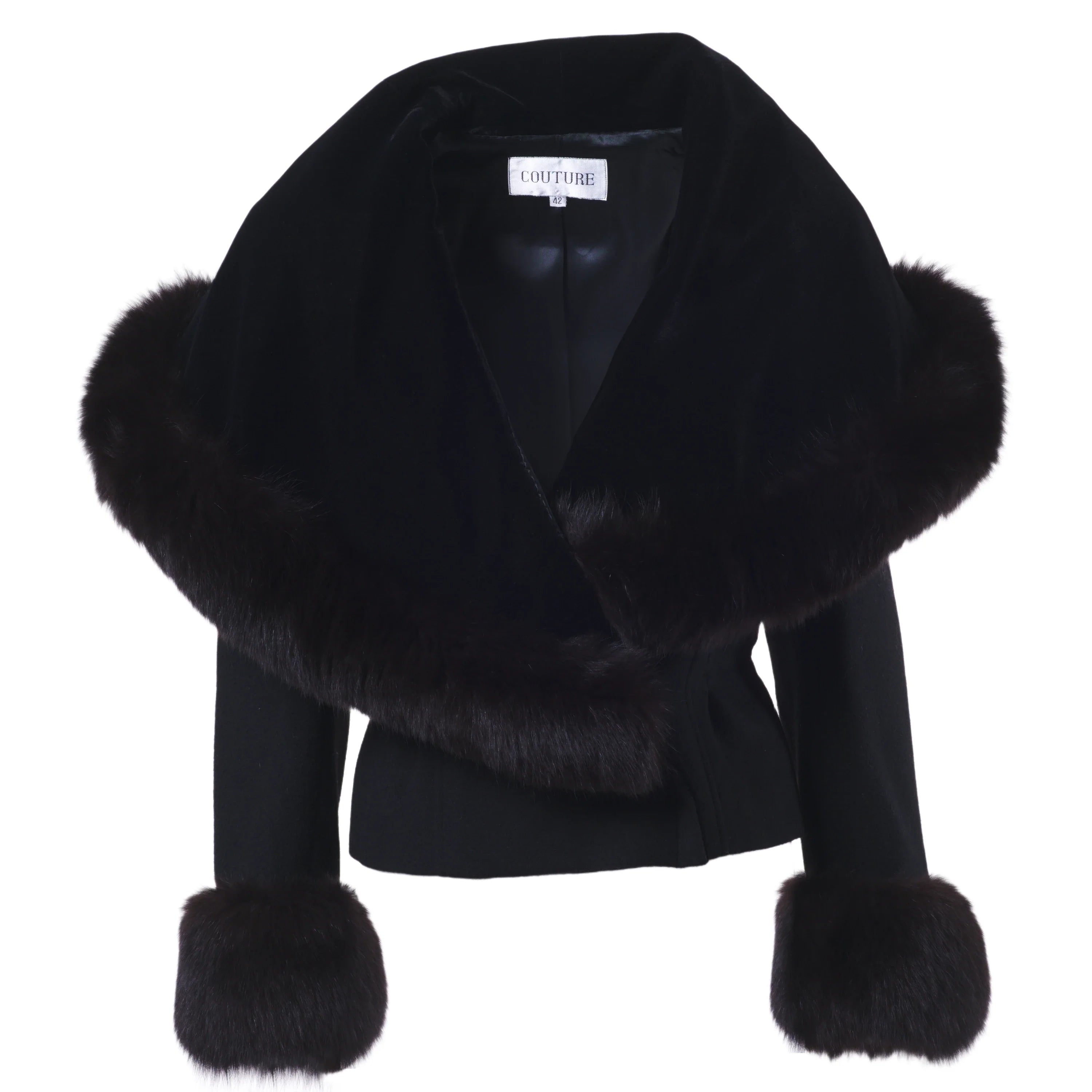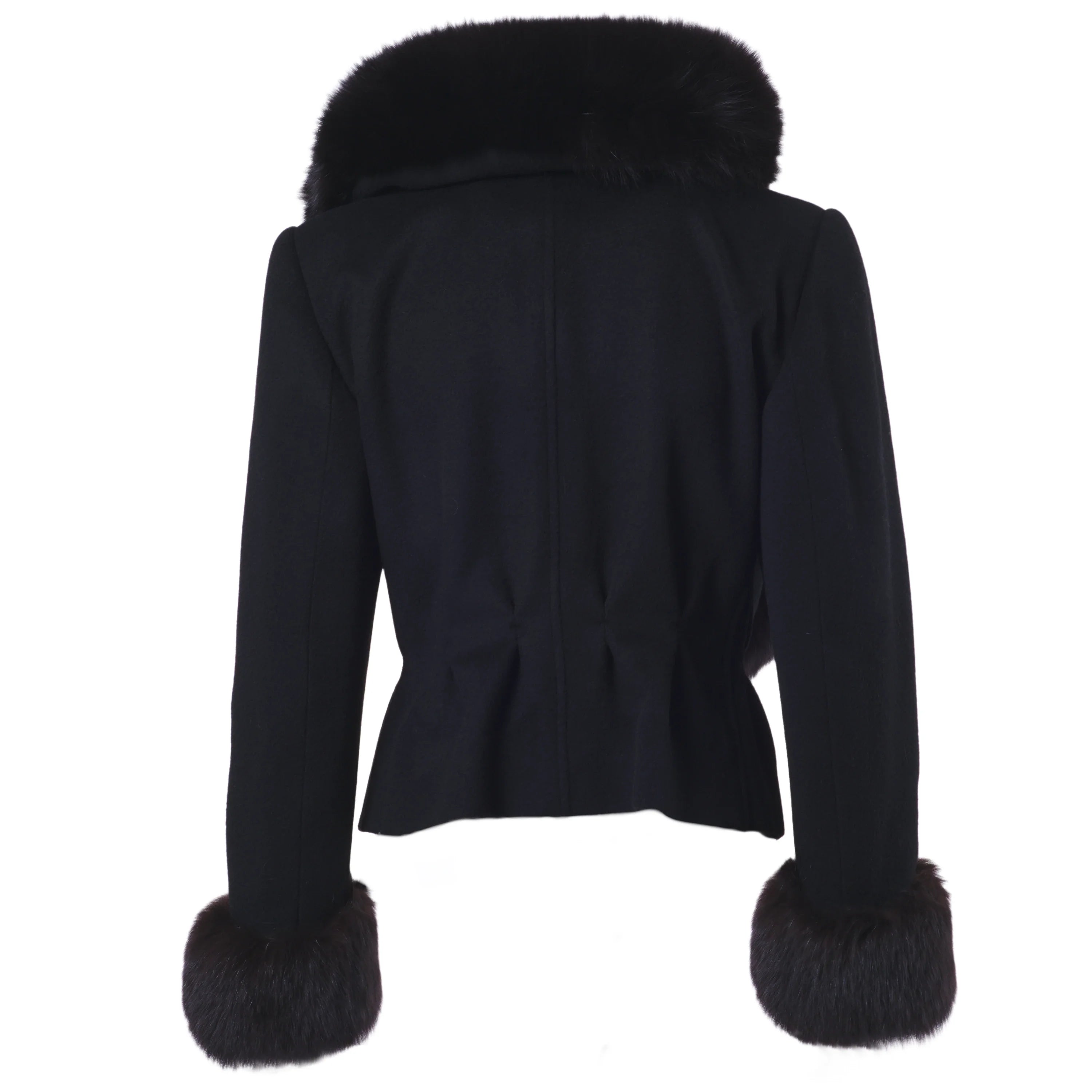 Elegant black couture jacket by Mario Borsato, defined by a refined tailored silhouette and luxurious fur trim along the collar and cuffs. A statement yet timeless piece, designed to elevate evening looks and sophisticated winter styling.
