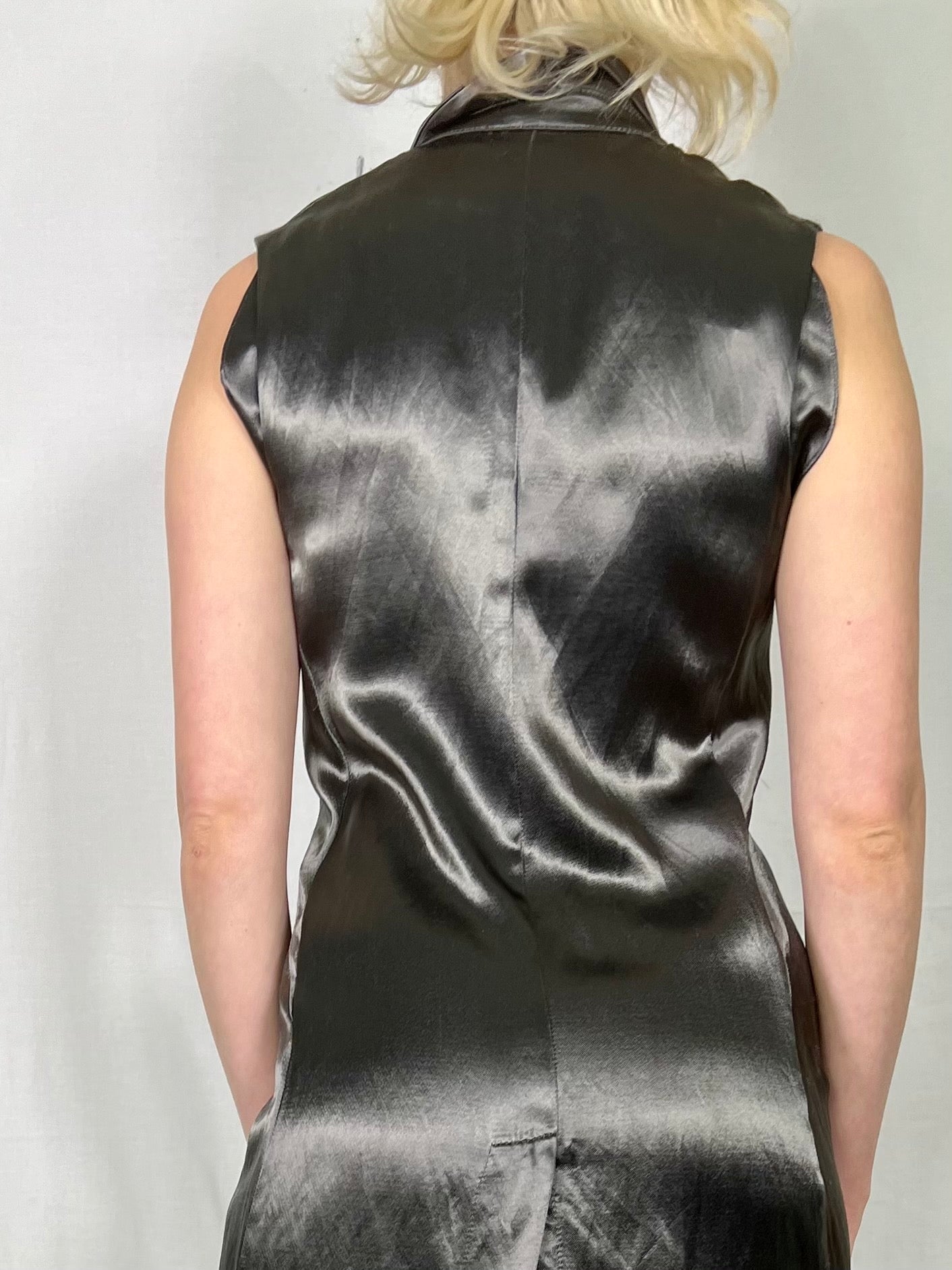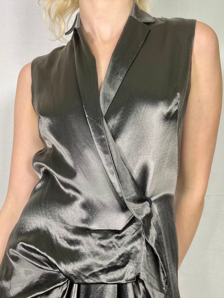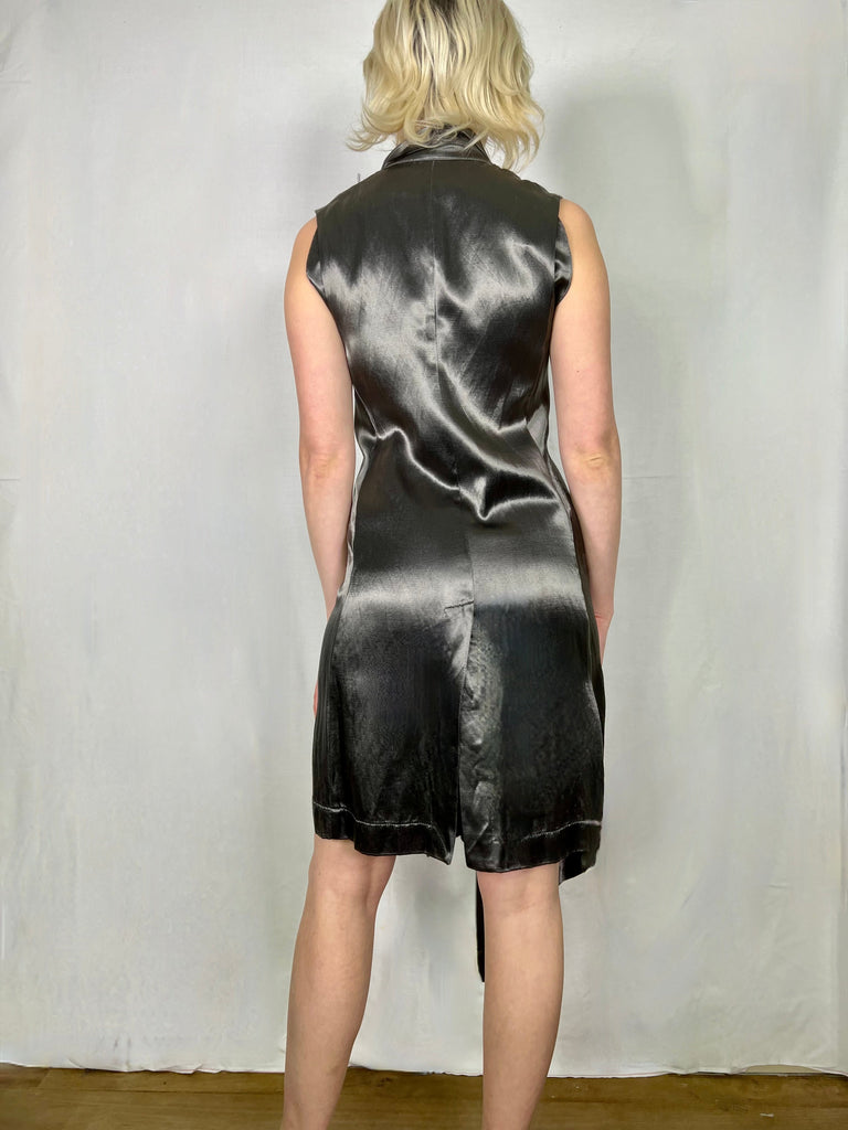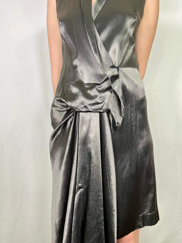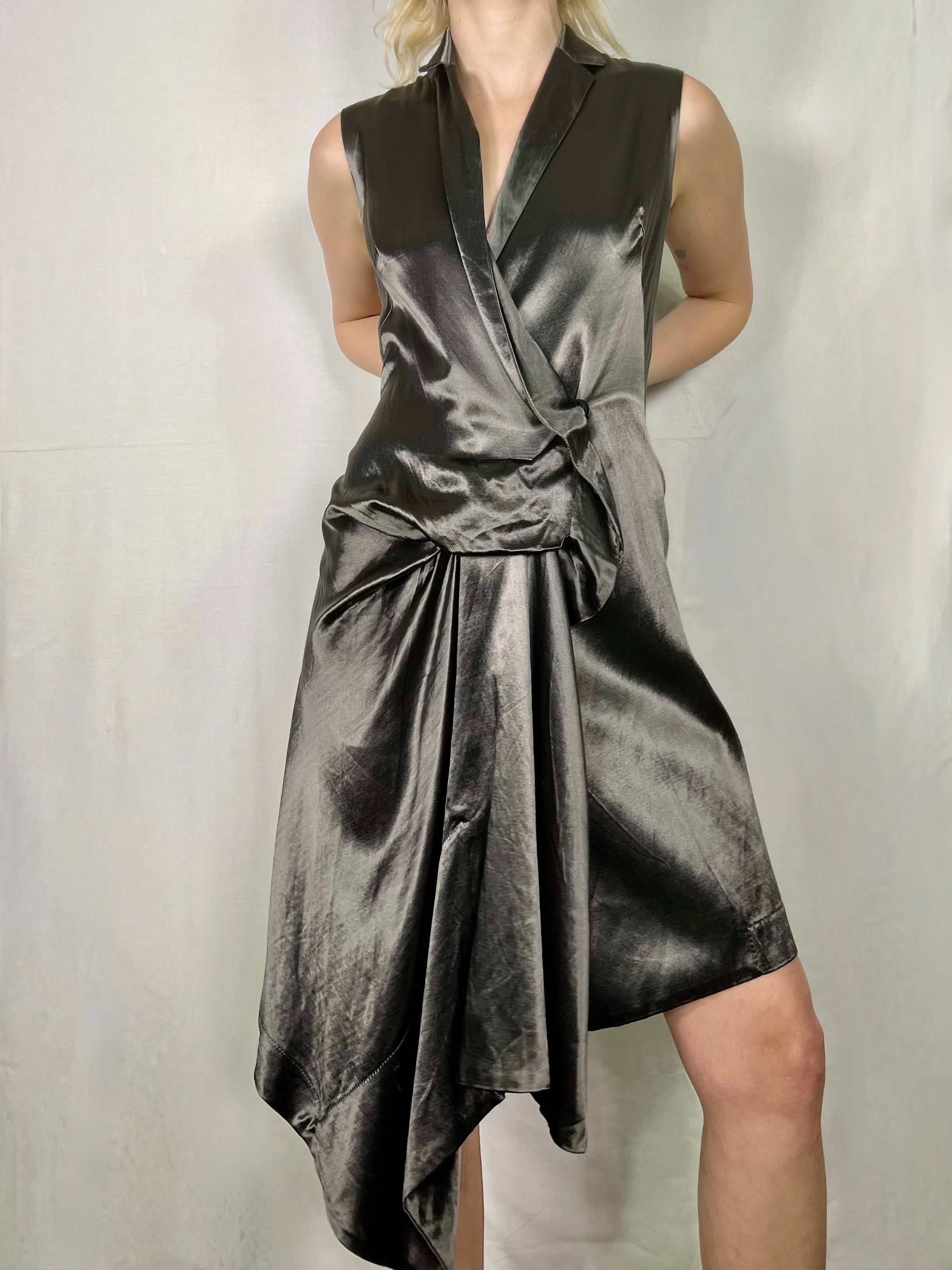 Liquid silk, anthracite grey 80s dress in a wrap over style. Has an asymmetric handkerchief detail and flows beautifully in motion. Makes a fab day to night dress and looks fab worn with boots. Has a vintage Helmut Lang vibe.