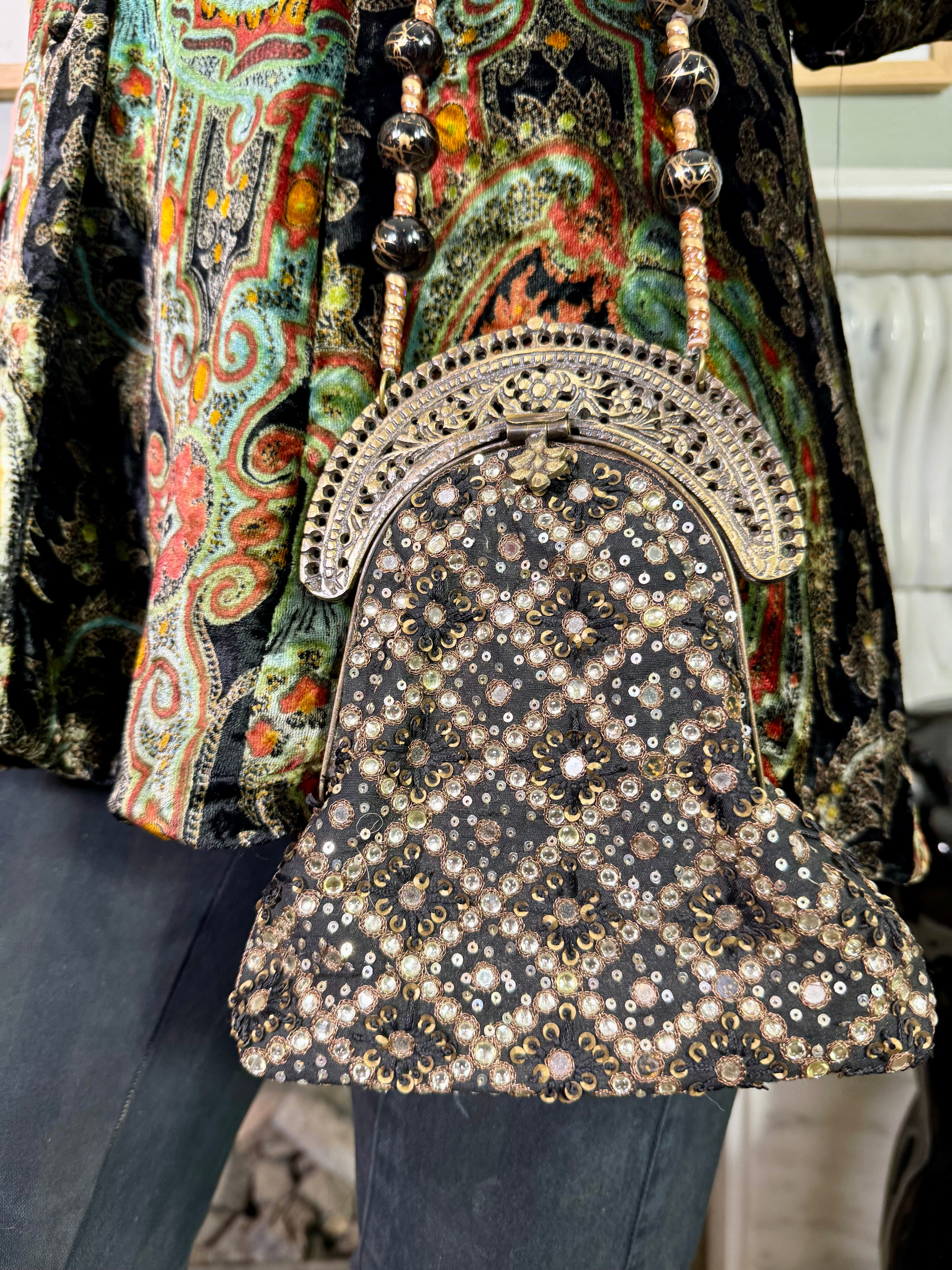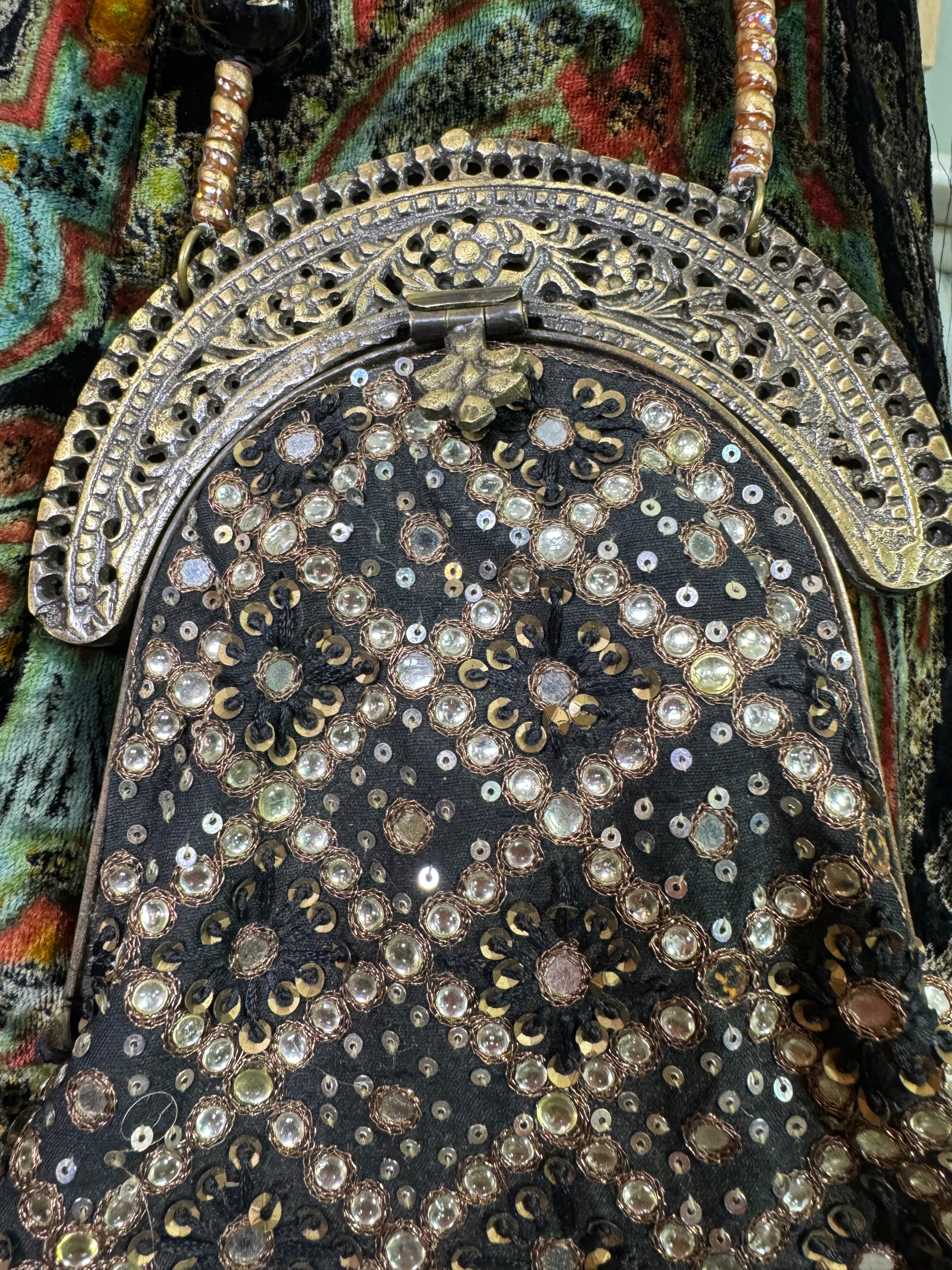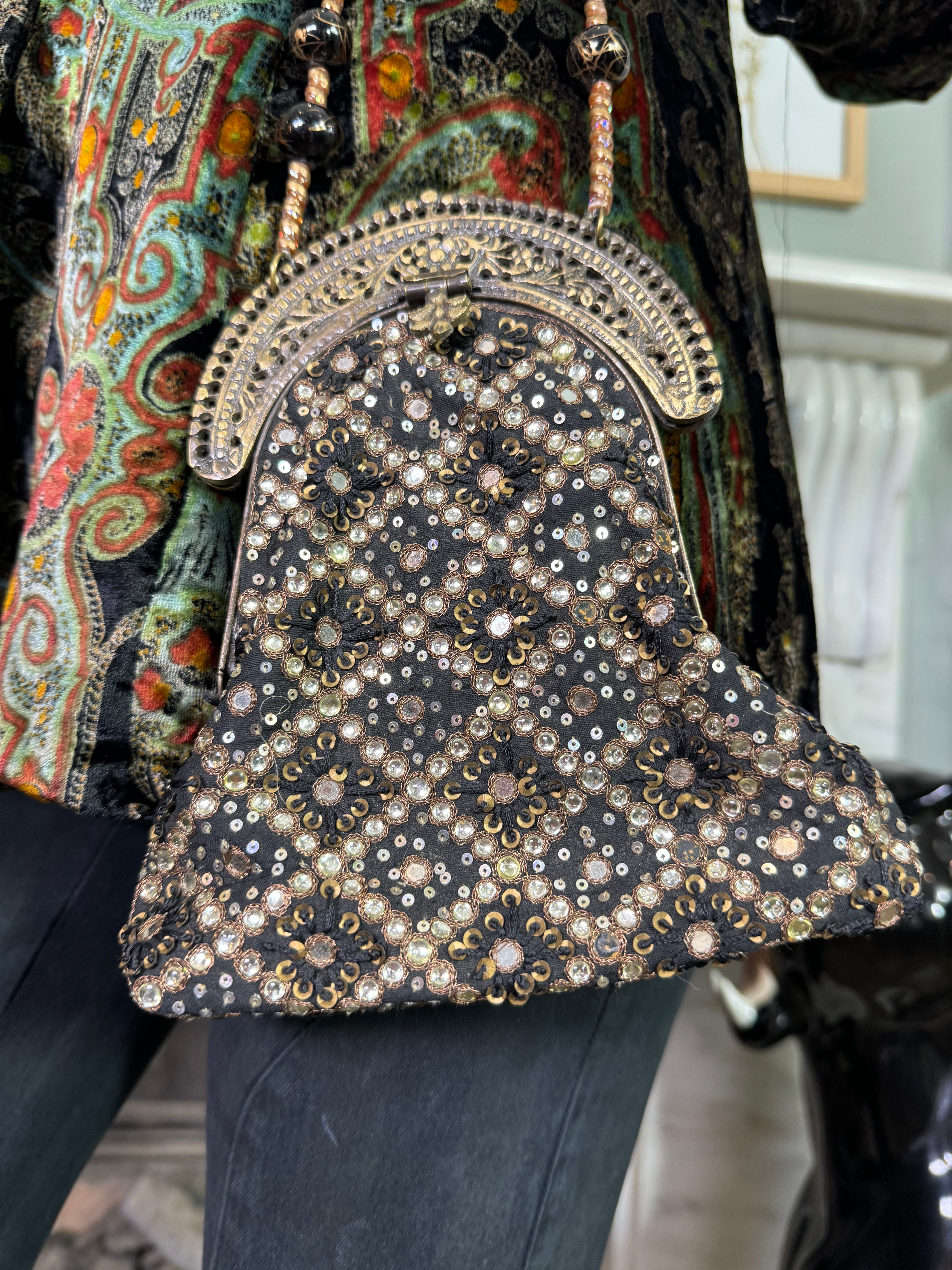 Fabulous little vintage handbag in an interesting shape with a metal floral frame. Has a beaded monochrome print design and a beaded handle. Perfect for essentials and matches practically all dark outfits.