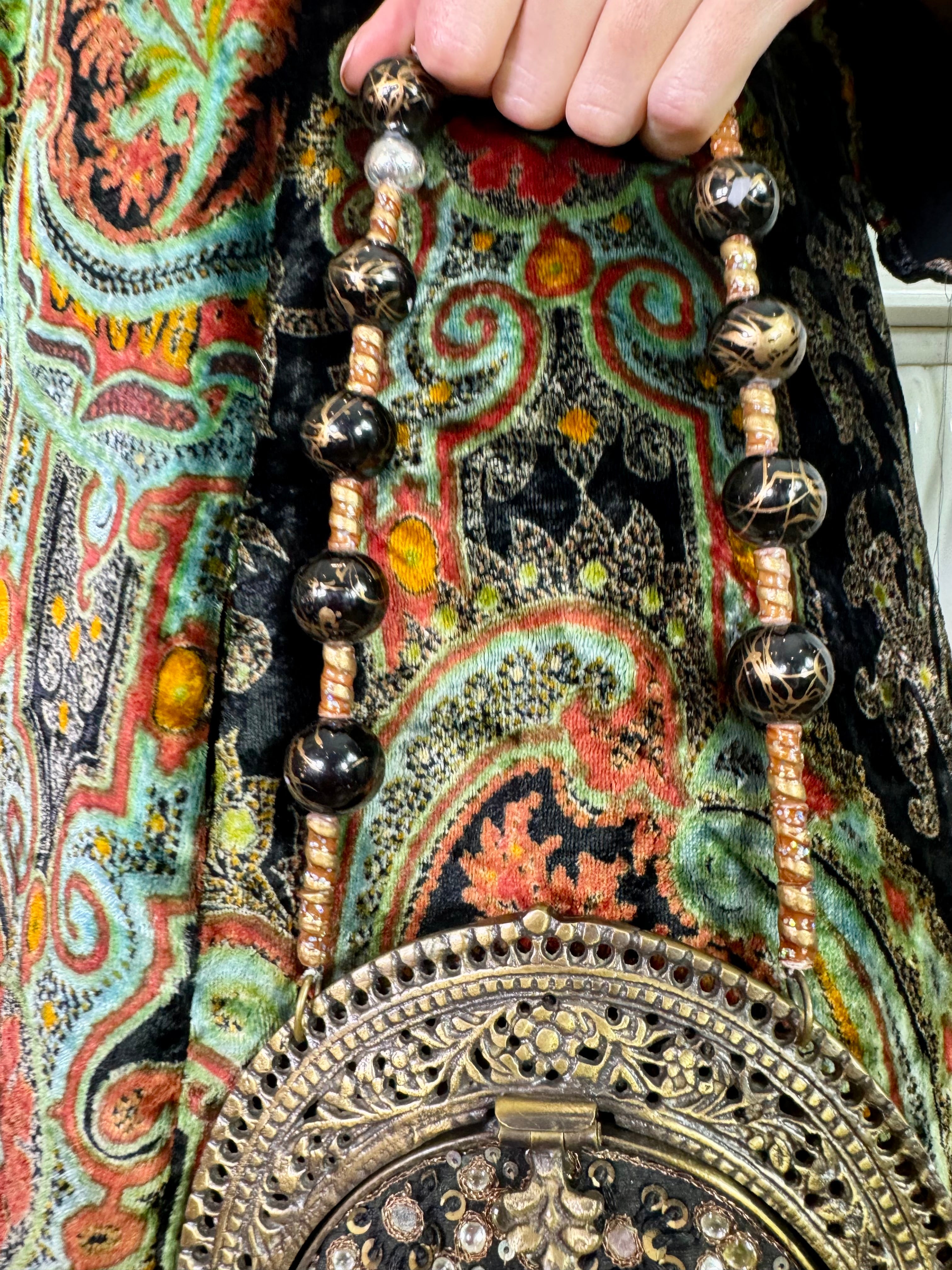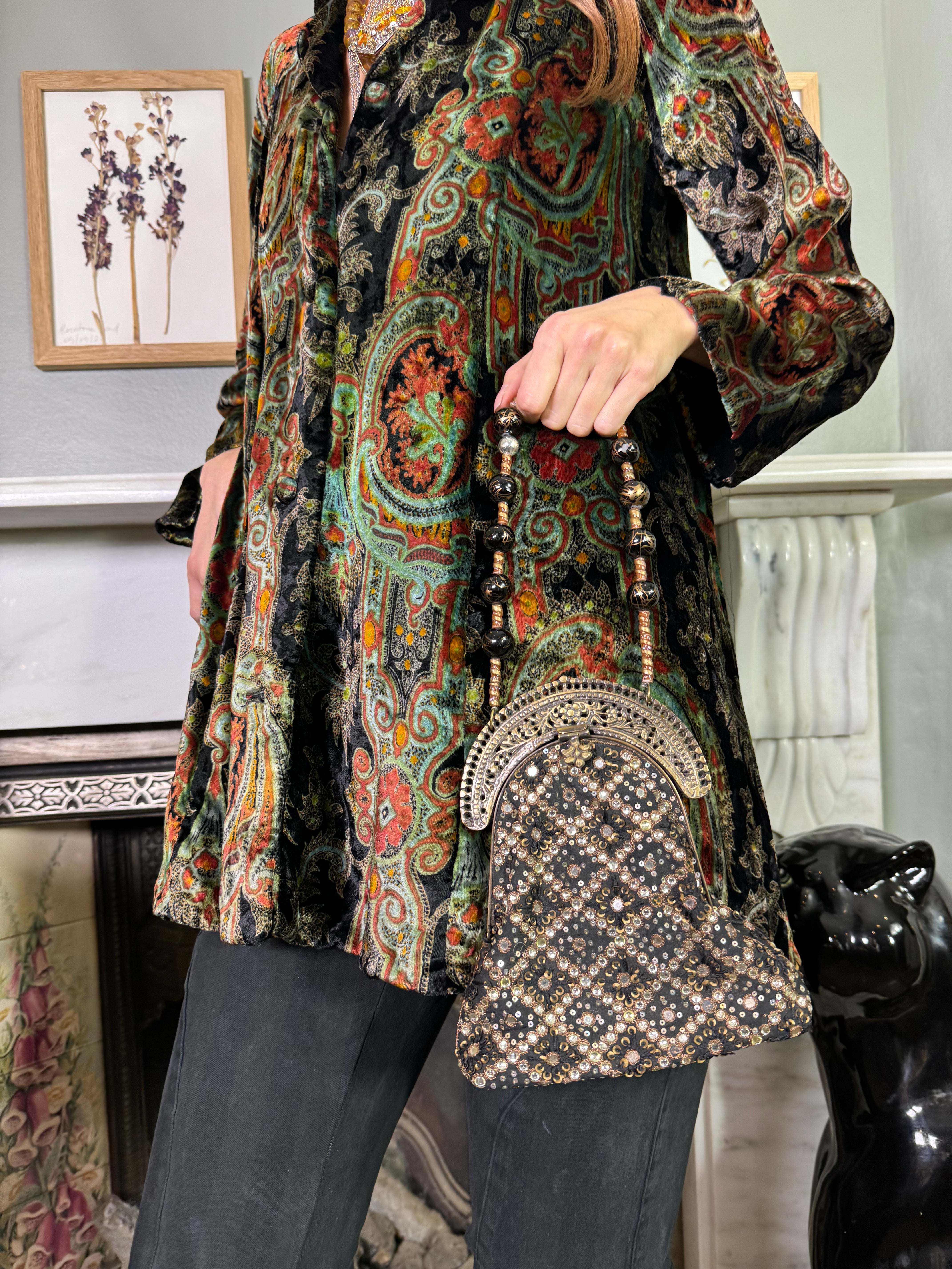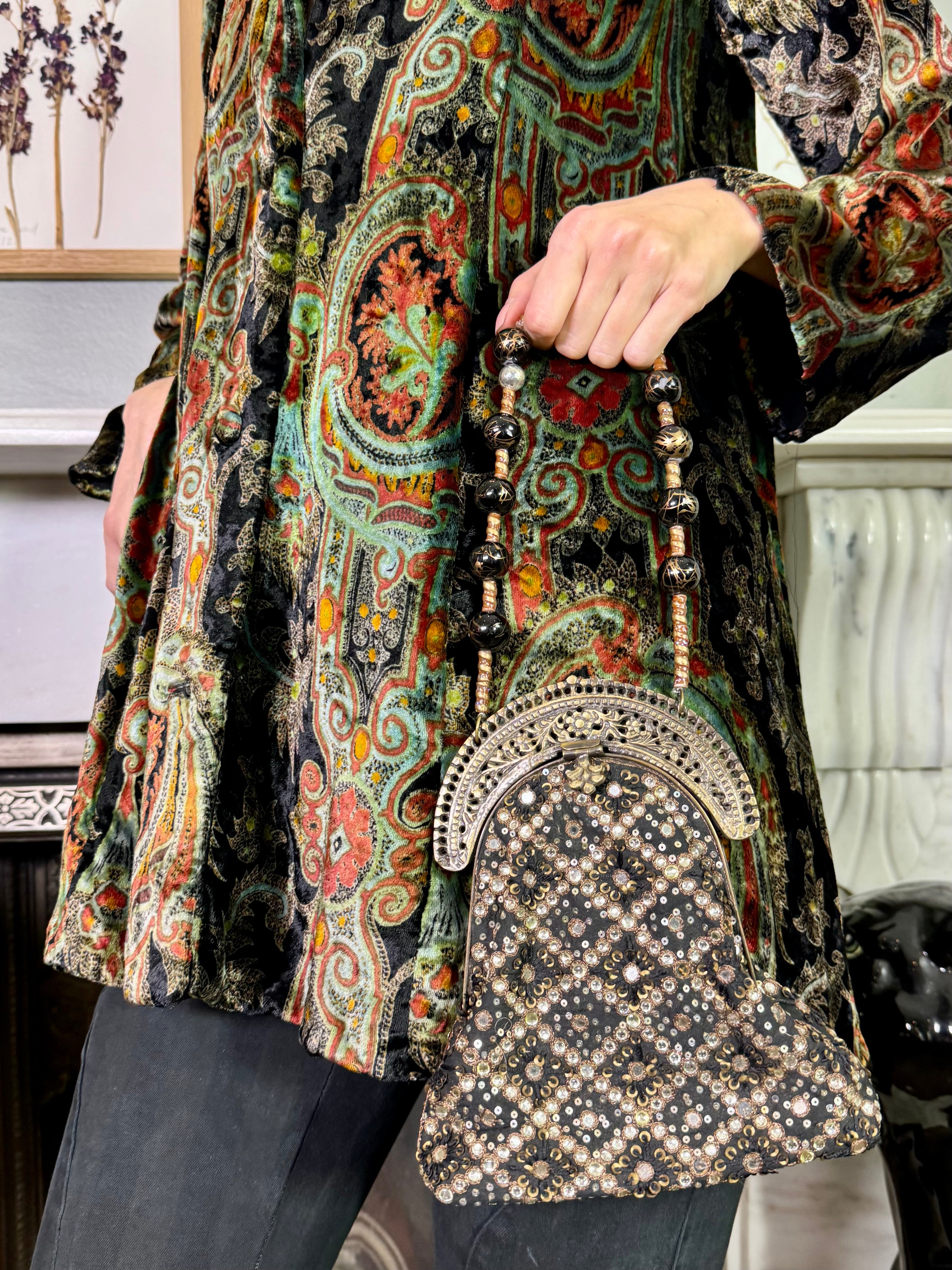 Fabulous little vintage handbag in an interesting shape with a metal floral frame. Has a beaded monochrome print design and a beaded handle. Perfect for essentials and matches practically all dark outfits.