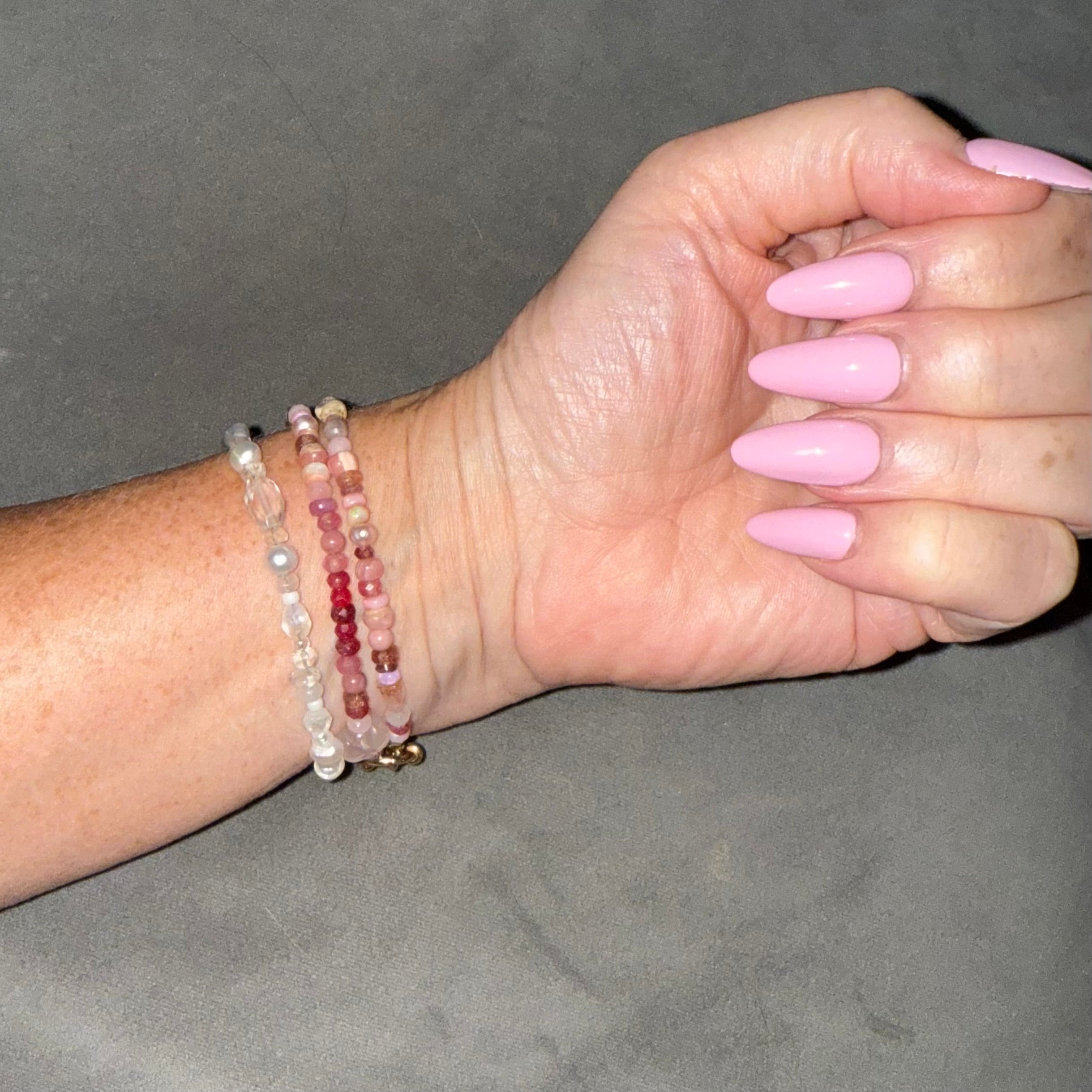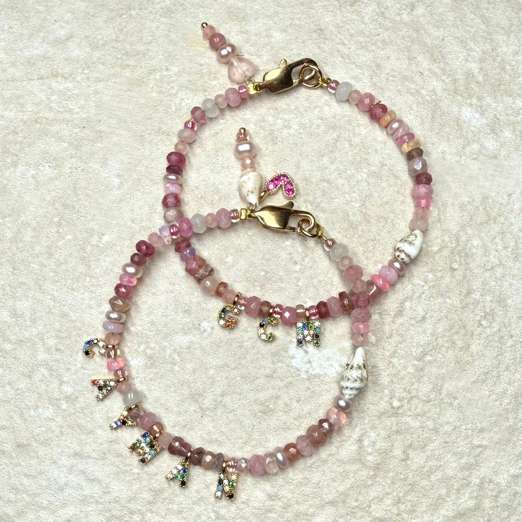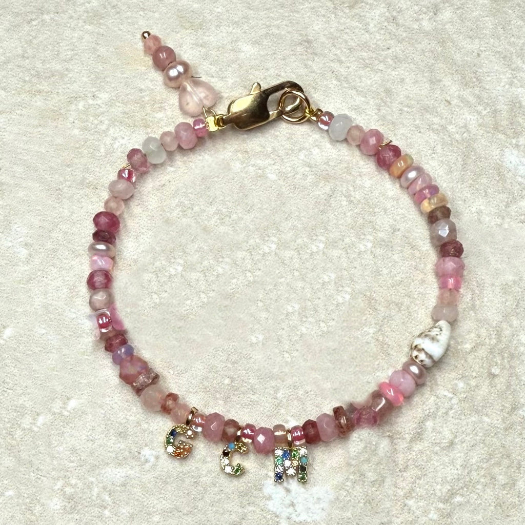 Our Naked Beach Gemstone Bracelet is handmade from blush and rose ruby, tourmaline, pearls, opals, rhodendrite, rose & strawberry Quartz and shells . It has cute charms at the clasp.