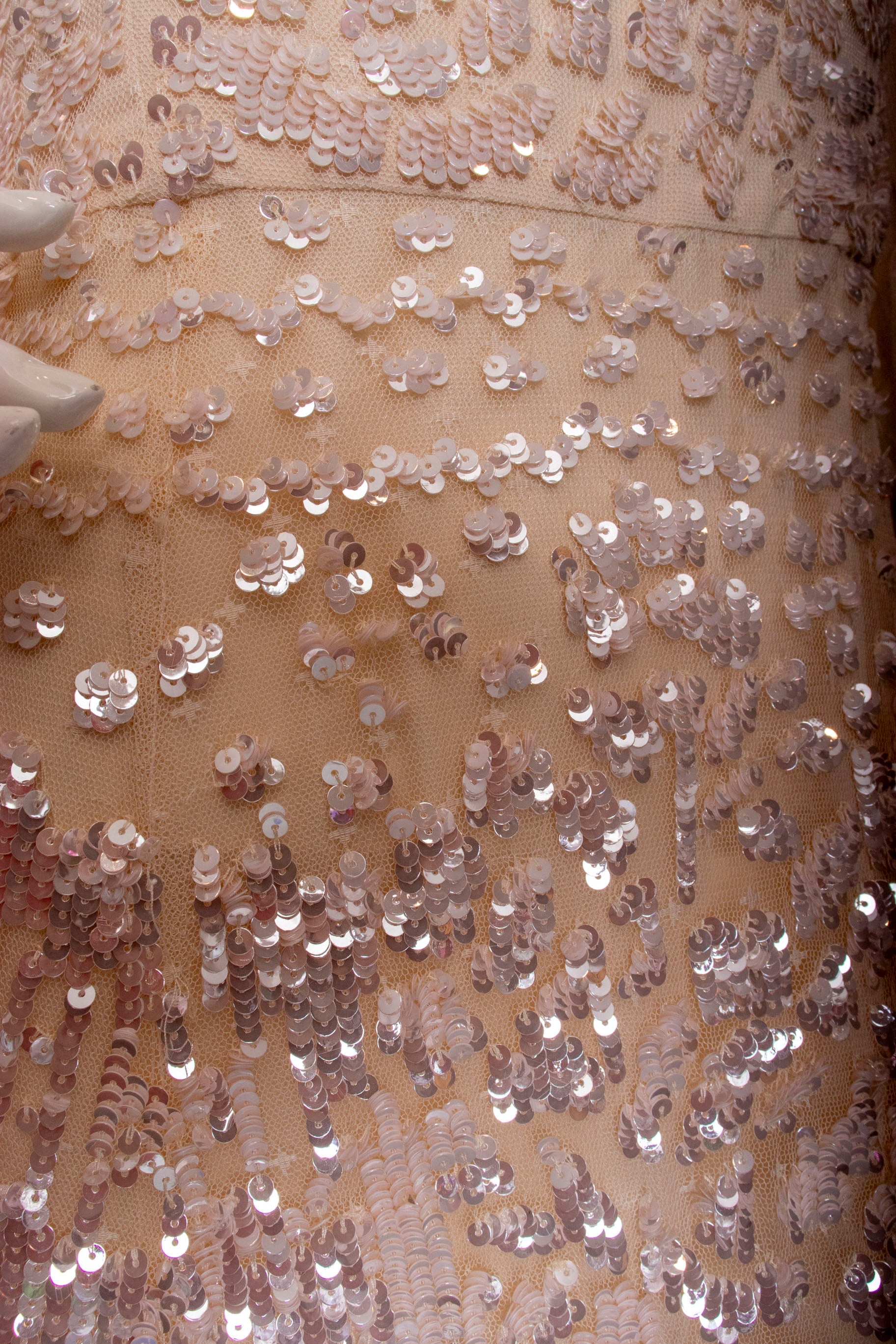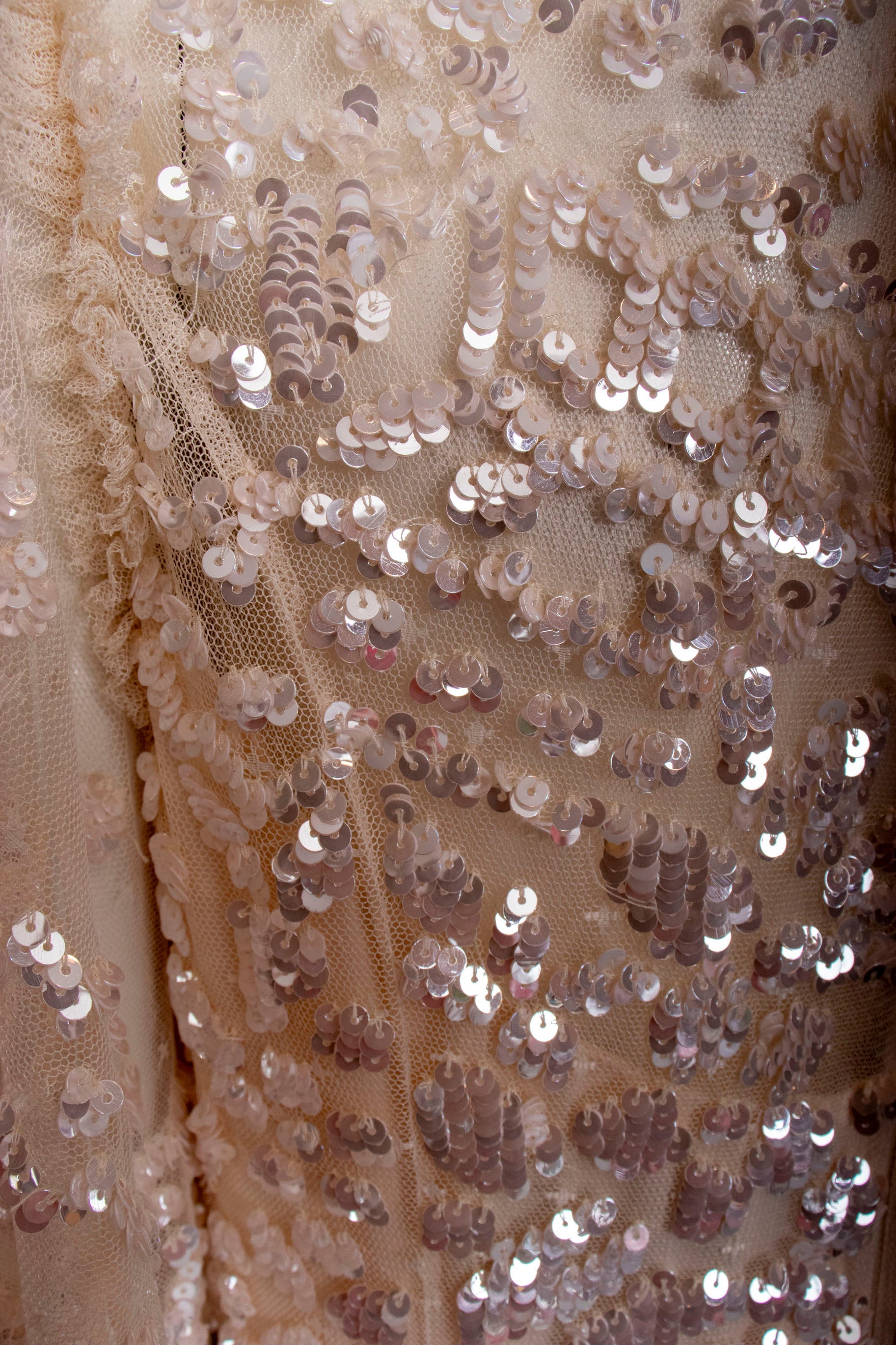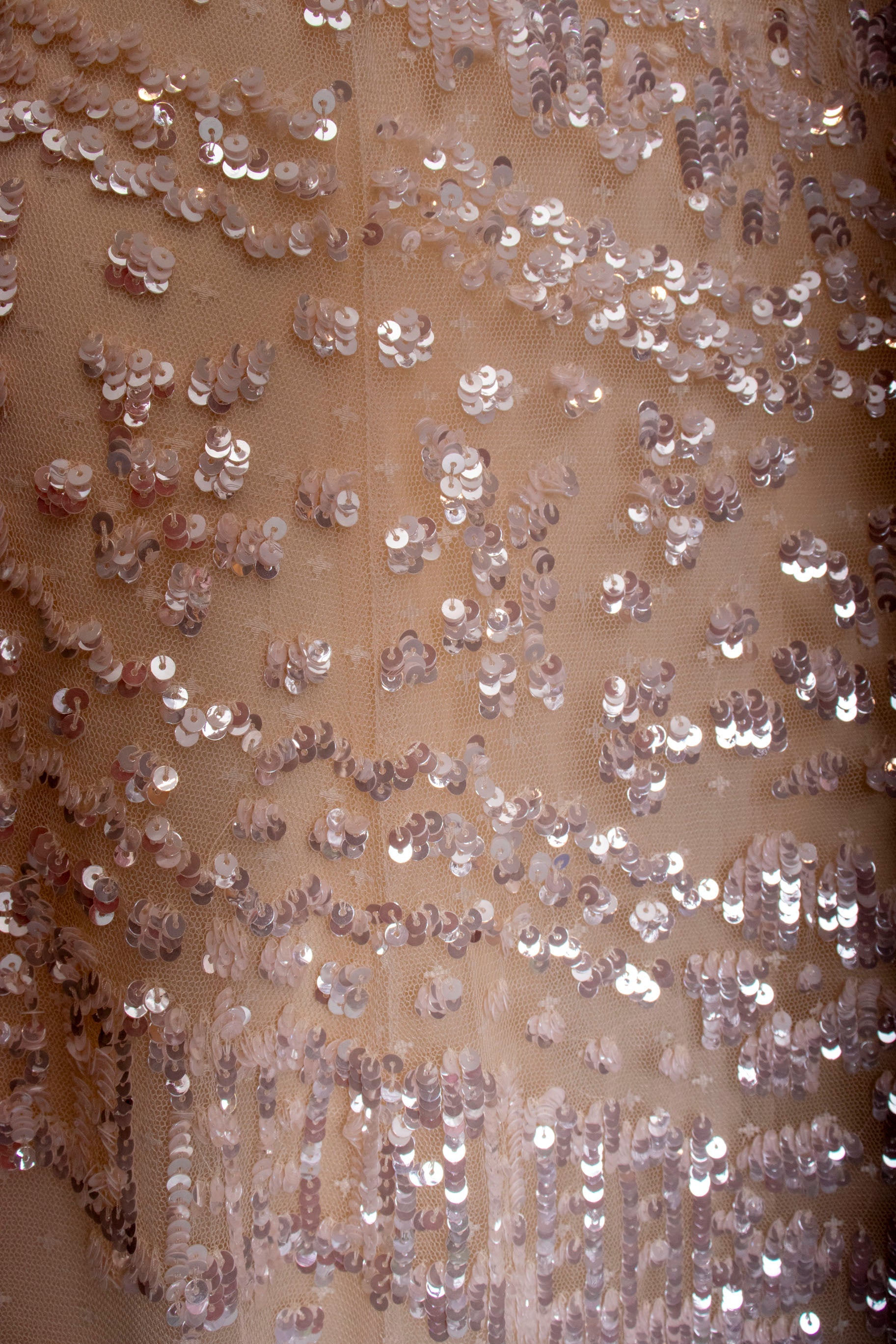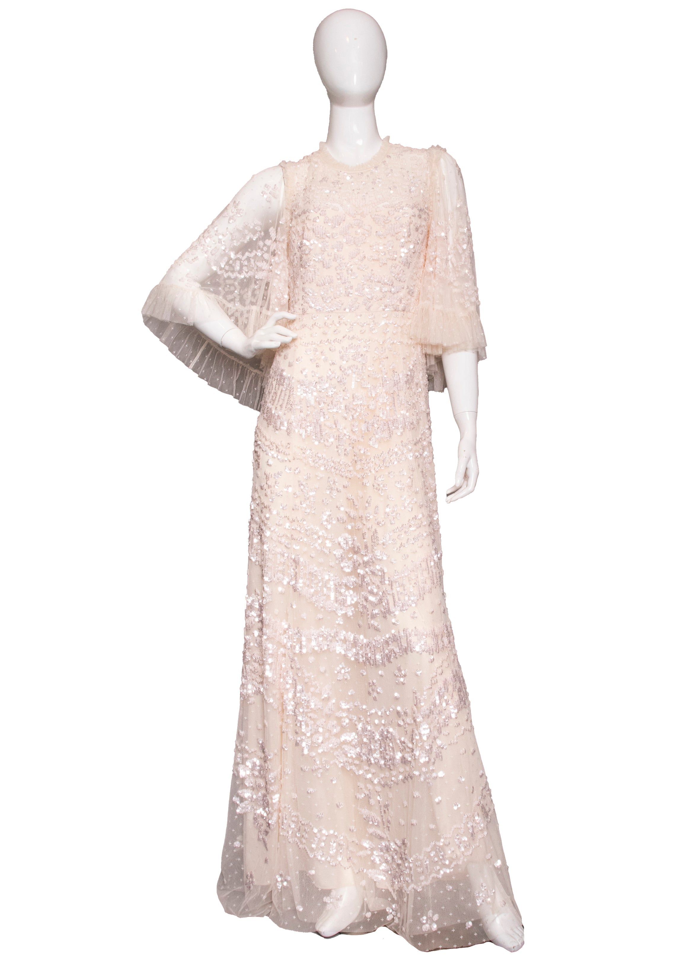 This iridescent tulle maxi dress shines in a way that photos struggle to capture. Featuring delicate blush tulle embellished with shimmering sequins, its floor-length and fully lined princess silhouette is perfect for special occasions or as a wedding dress. Elegant, dreamy, and timeless, it offers a romantic and sophisticated look you'll cherish.