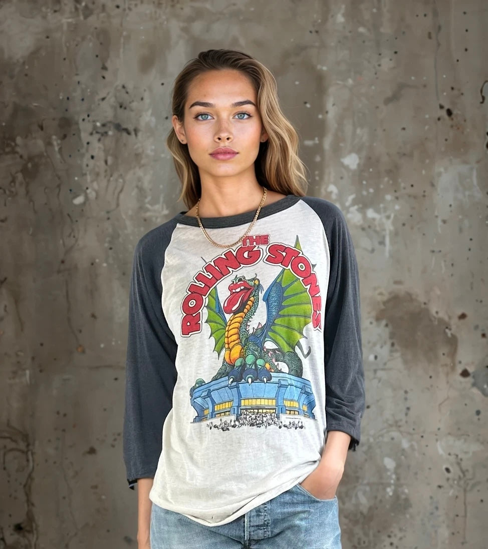 Upgrade your wardrobe with this Original Rare Vintage 1981 Rolling Stones American Tour Rock Band T-shirt. Made with UK size 6-10 in mind, this shirt is an iconic piece of music history. Featuring original artwork and a comfortable fit, this shirt is a must-have for any music or fashion enthusiast. Don't miss out on this one-of-a-kind find!