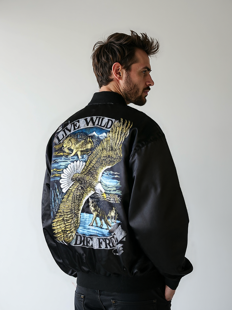 This authentic vintage 1980s black bomber jacket features a striking "Live Wild / Die Free" print, embodying the rebellious spirit of the era. Crafted in the UK, it offers a classic silhouette with durable materials that ensure longevity. Perfect for collectors or enthusiasts of retro fashion, this size M jacket blends timeless style with bold attitude, making it a standout addition to any wardrobe.