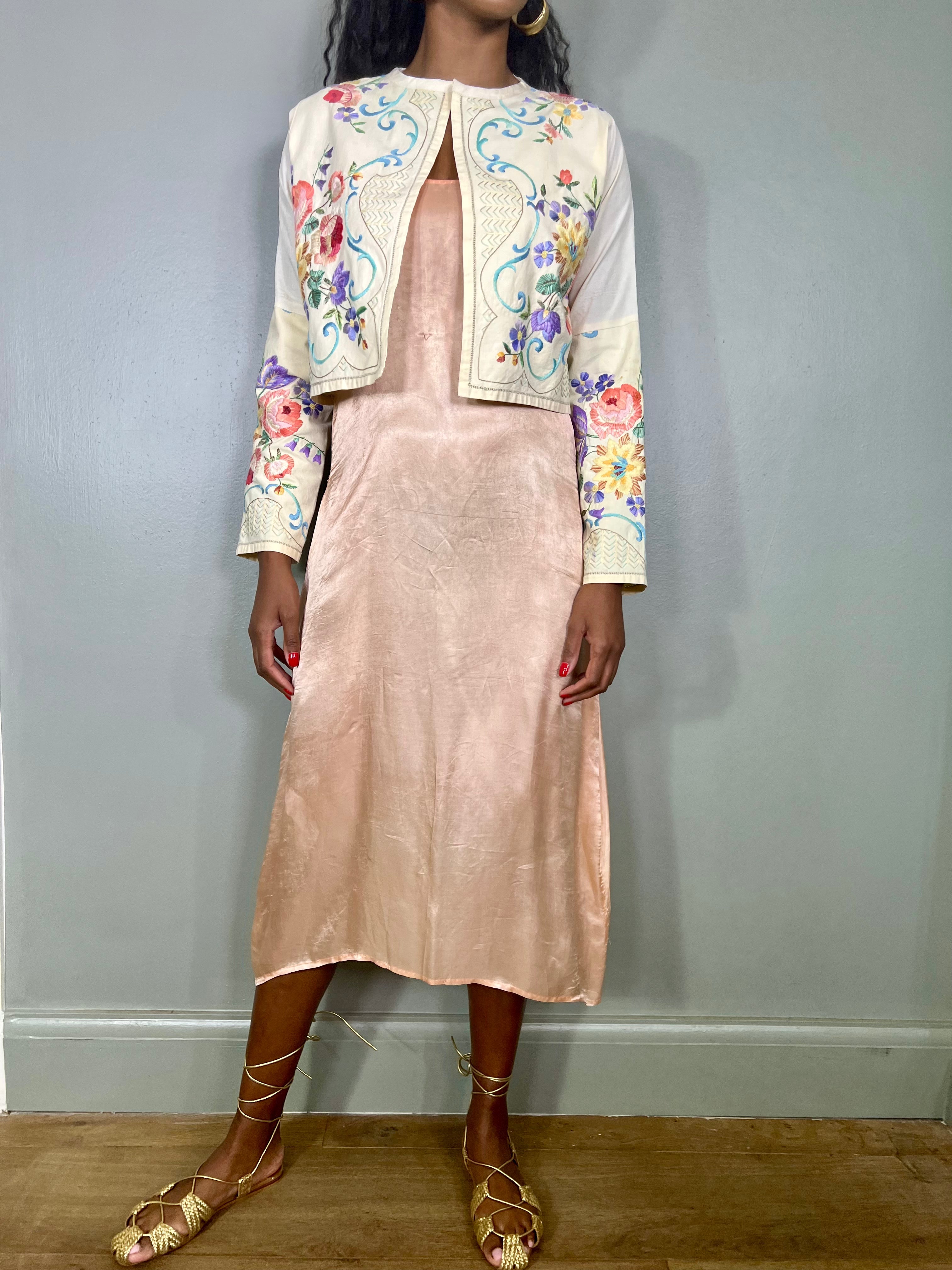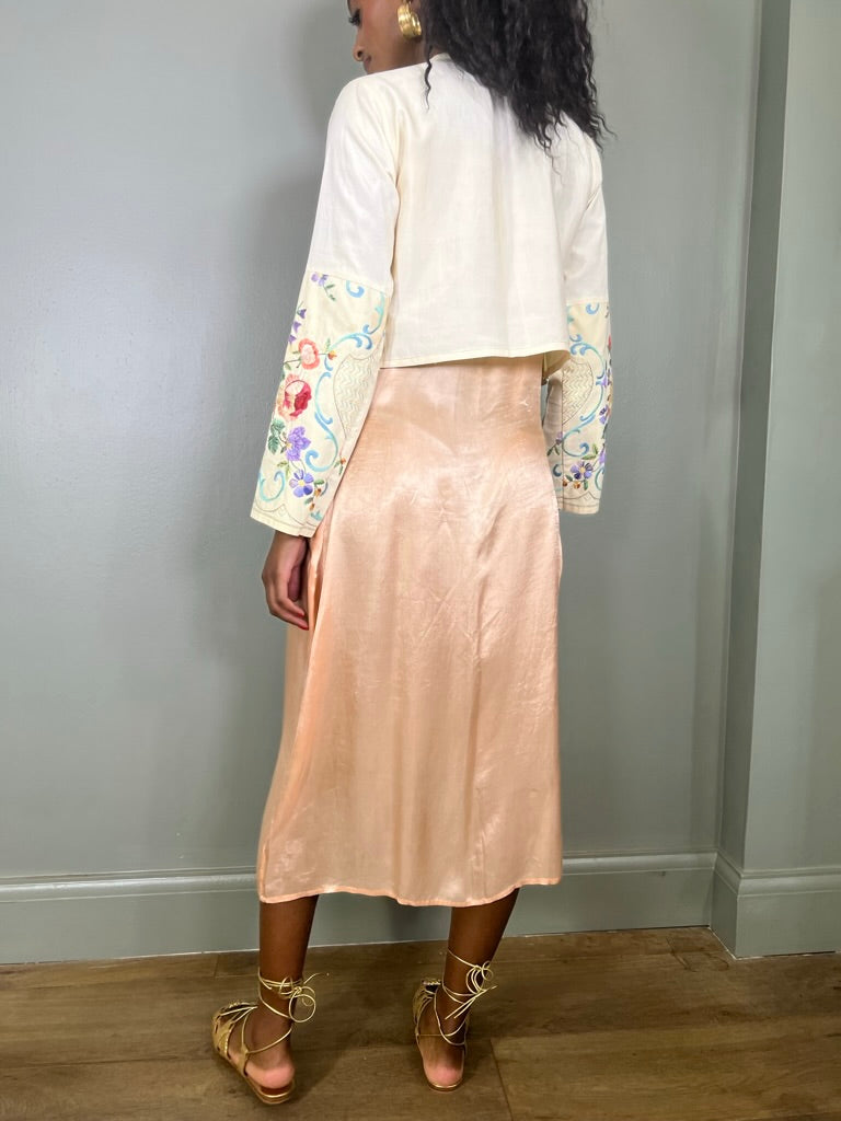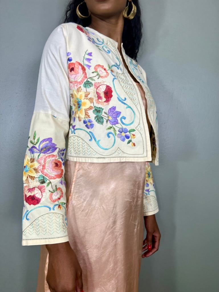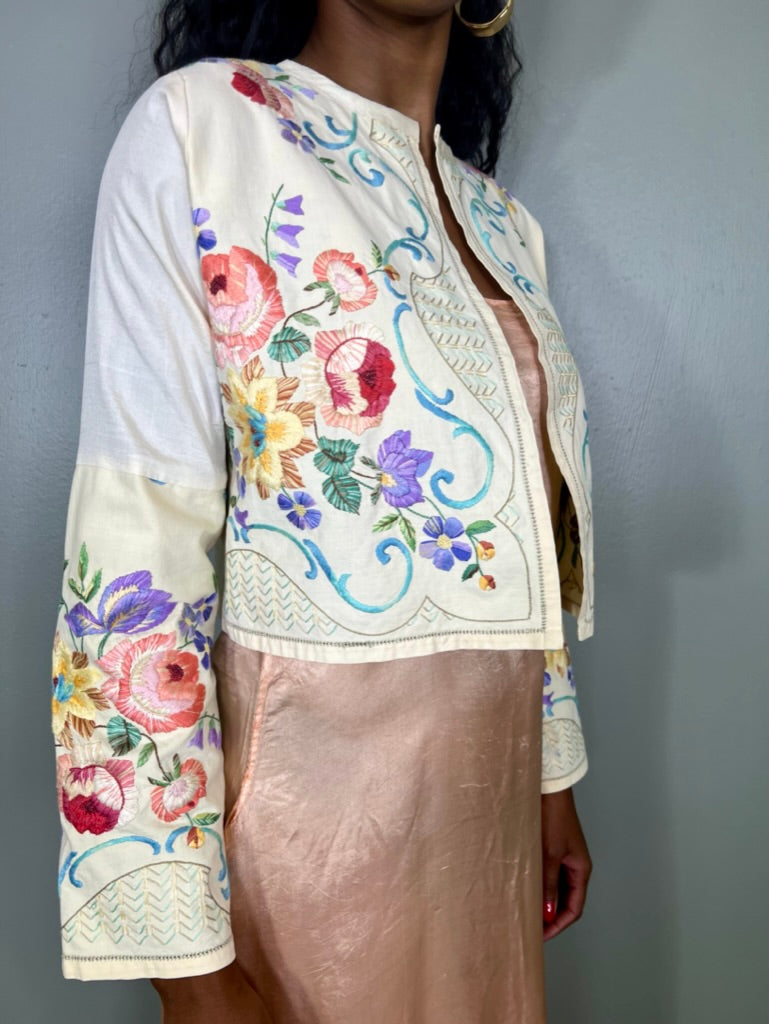 Glorious vintage cotton embroidered jacket. Has a pretty floral design on the front and sleeves. Has a round neckline and straight fit with no fastening. A unique forever piece.