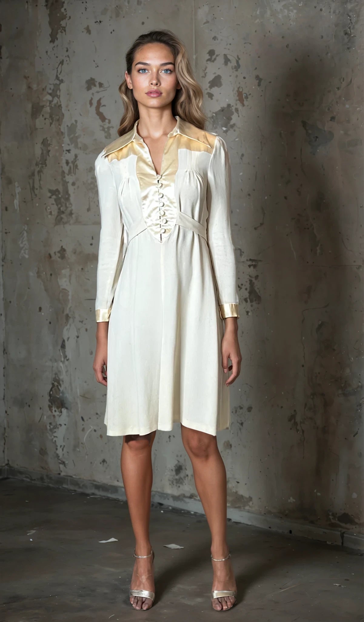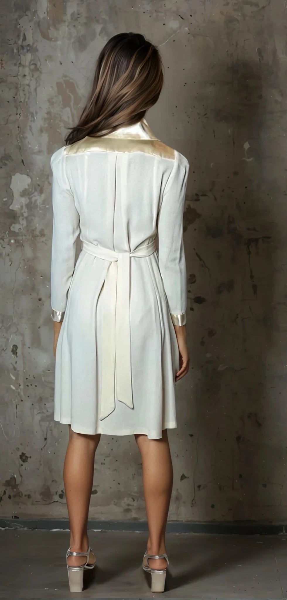 This vintage wedding dress is made of cream moss crepe fabric with a flattering silhouette. It can fit sizes from 8 to 12 UK due to it's design and tie waist and has a flair for a grand entrance. A timeless piece for a classic and sophisticated look.