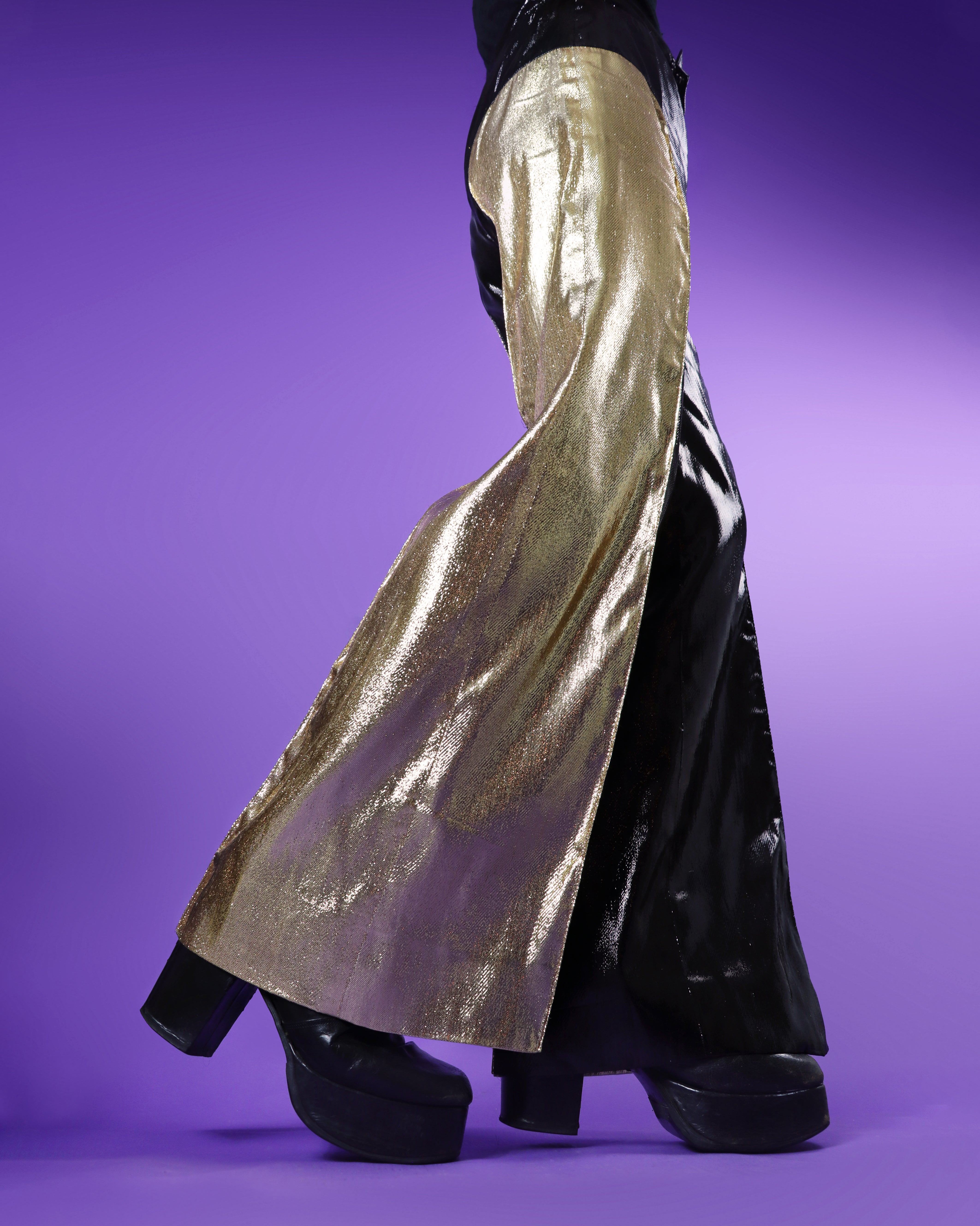 Truly spectacular vintage 1970s two tone glam rock lamé flares. Beautifully made using a sparkly liquid lamé material in black with contrast golden panels. Fully lined. Cut with a high waistband and rounded side panels which fall to the floor from the hip. Totally show stopping and mesmerising under the lights. Unworn. Once in a lifetime type find!