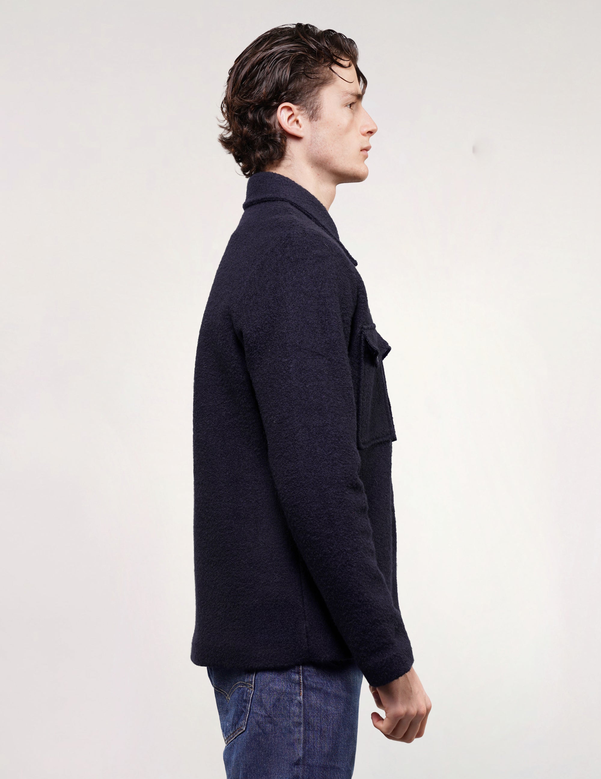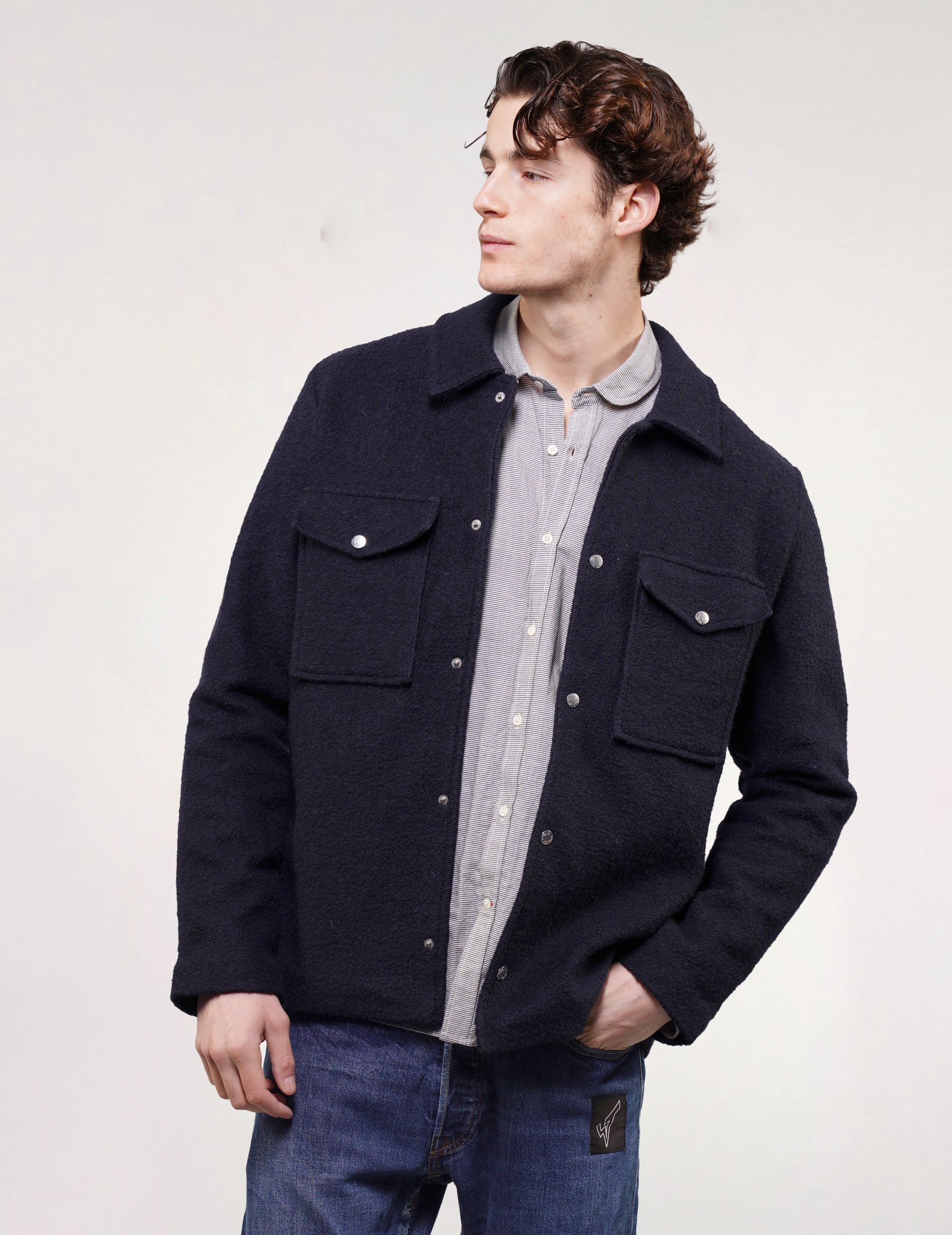 Deadstock Reiss navy blue textured wool jacket. Features silver snap-button closures and two buttoned chest pockets. The most perfect versatile, everyday jacket.