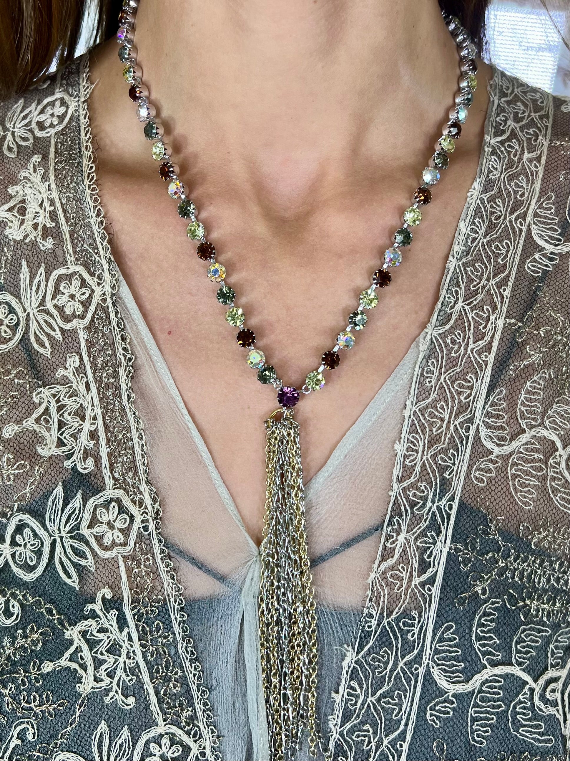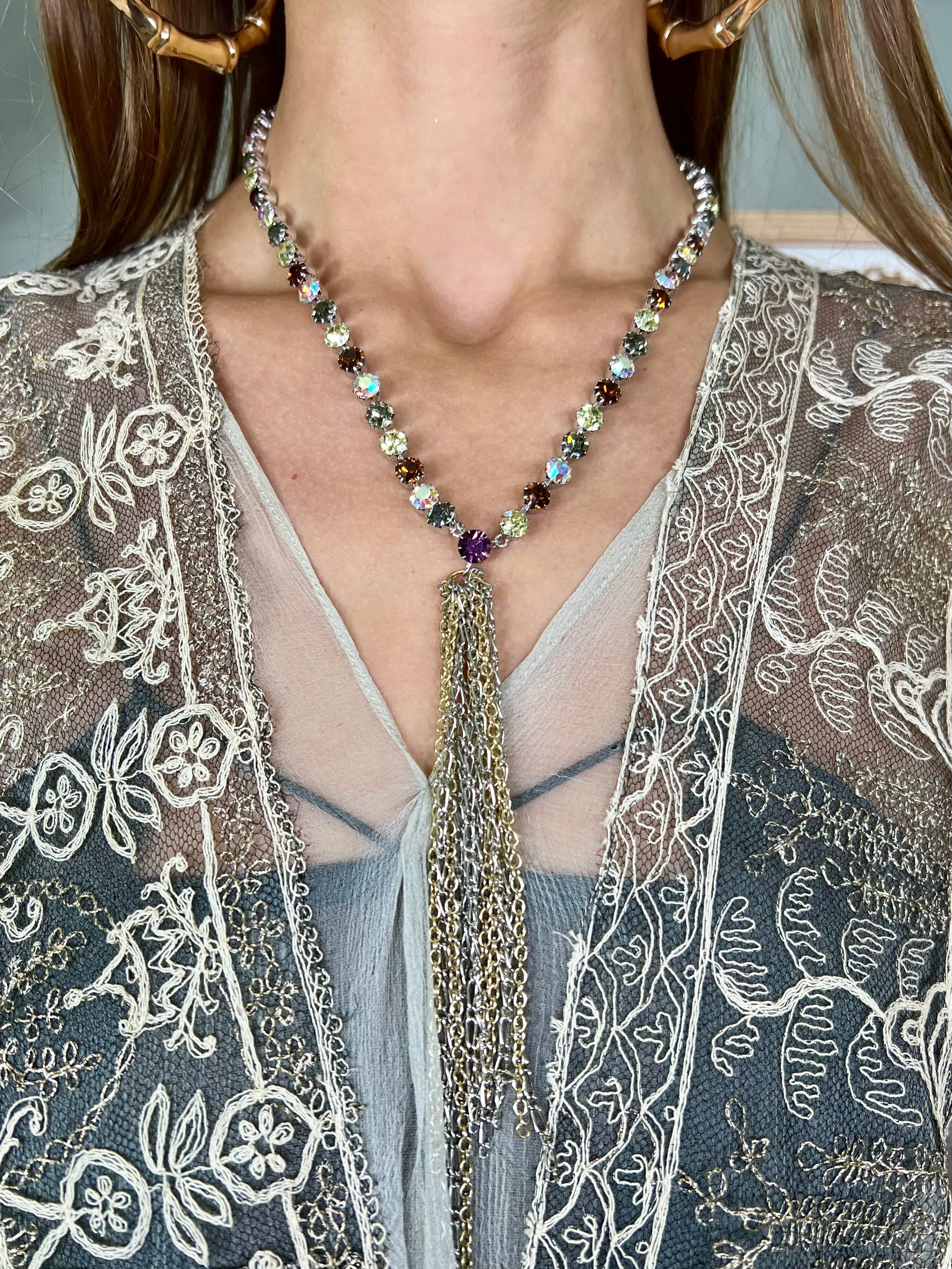 Pretty vintage reworked necklace made from a diamanté necklace in green, purple and translucent stones with a multi chain central tassel pendant. Easy to wear and effective.