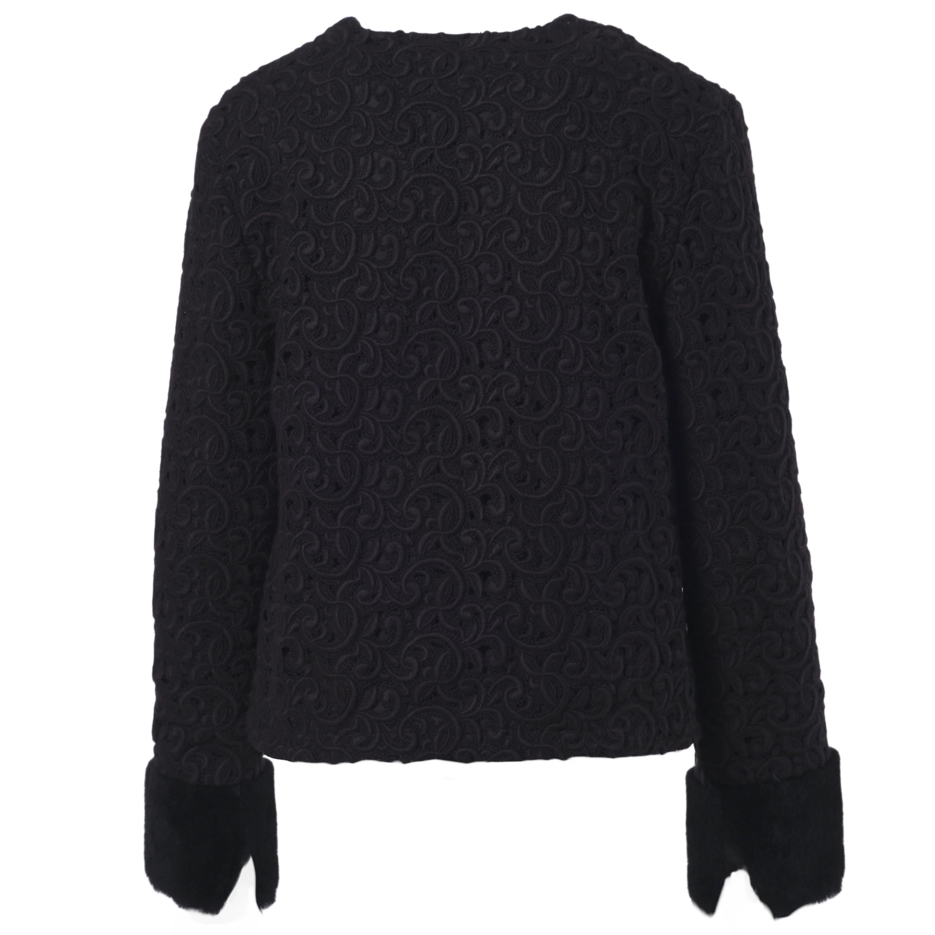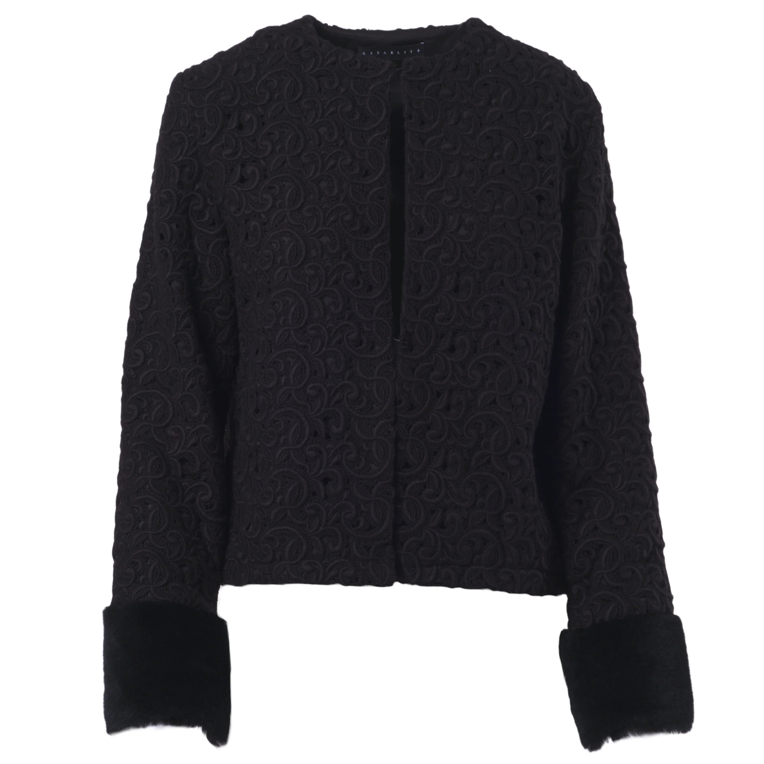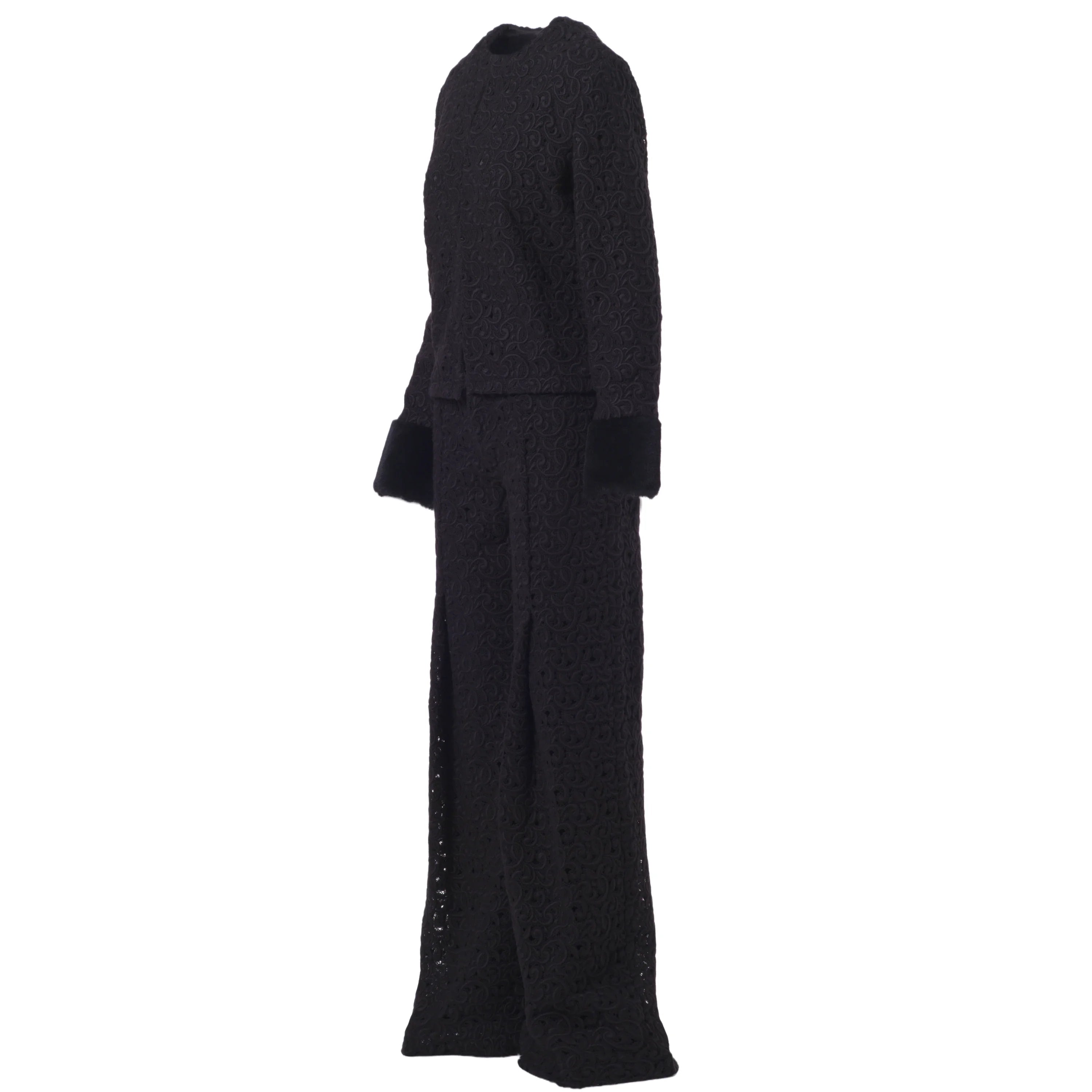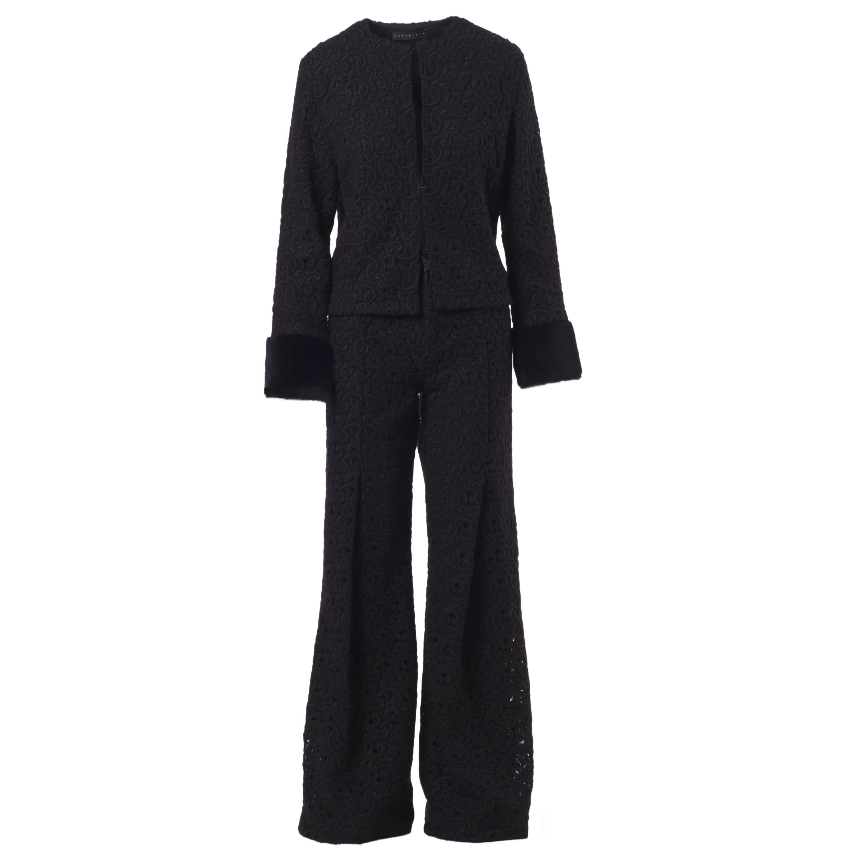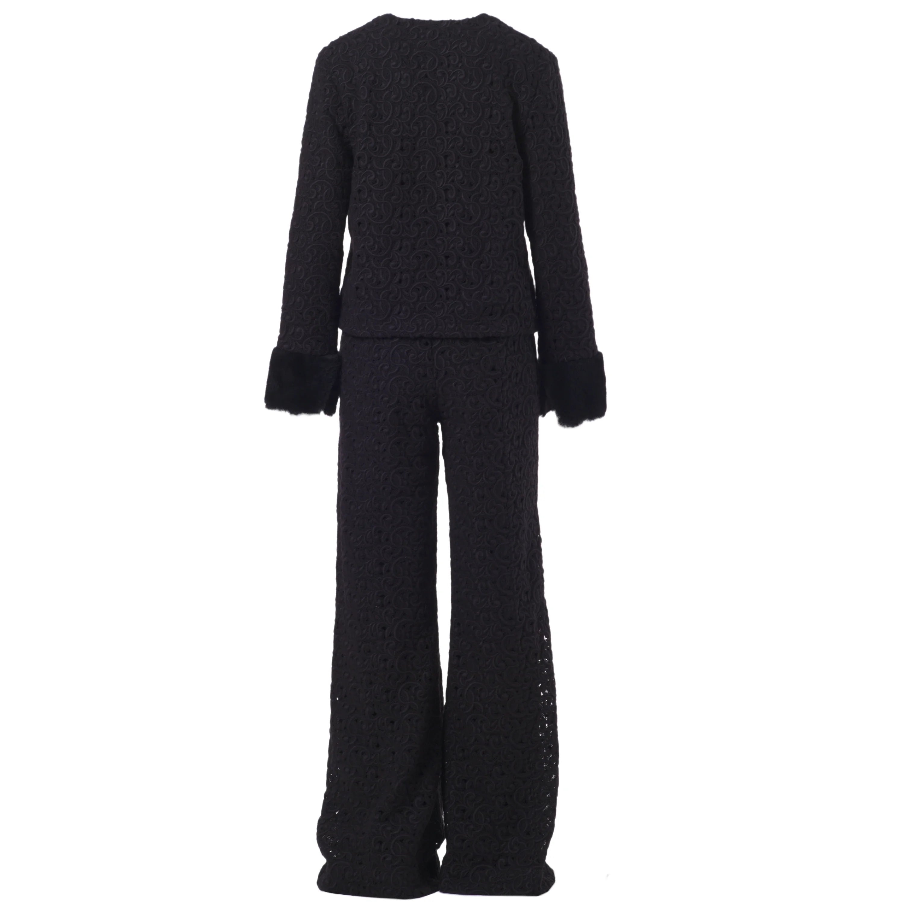This Starlit set brings together a jacket and trousers in a balance of clean lines and refined textures. The jacquard fabric, worked in relief, adds depth to the black tone and defines a sober yet distinctive aesthetic. The jacket features a clean neckline and long sleeves finished with contrasting cuffs, subtle details that add character without disrupting the harmony of the design.